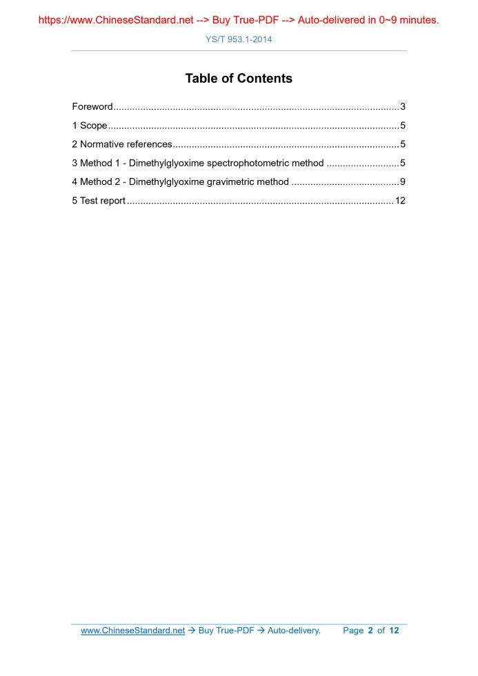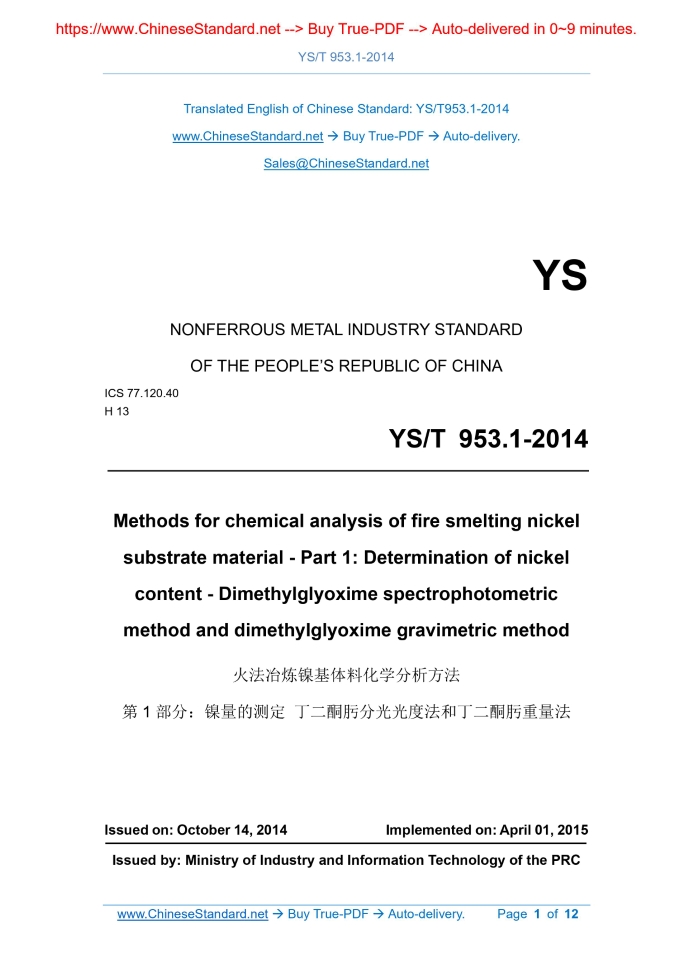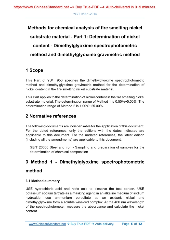 Similar standardsYS/T 953.1-2014: Methods for chemical analysis of fire smelting nickel substrate material - Part 1: Determination of nickel content - Dimethylglyoxime spectrophotometric method and dimethylglyoxime gravimetric method---This is an excerpt. Full copy of true-PDF in English version (including equations, symbols, images, flow-chart, tables, and figures etc.), auto-downloaded/delivered in 9 seconds, can be purchased online: https://www.ChineseStandard.net/PDF.aspx/YST953.1-2014 YS NONFERROUS METAL INDUSTRY STANDARD ICS 77.120.40 H 13 Methods for chemical analysis of fire smelting nickel substrate material - Part 1.Determination of nickel content - Dimethylglyoxime spectrophotometric method and dimethylglyoxime gravimetric method Issued on. OCTOBER 14, 2014 Implemented on. APRIL 01, 2015 Issued by. Ministry of Industry and Information Technology of the PRC Table of ContentsForeword... 3 1 Scope... 5 2 Normative references... 5 3 Method 1 - Dimethylglyoxime spectrophotometric method... 5 4 Method 2 - Dimethylglyoxime gravimetric method... 9 5 Test report... 12ForewordYS/T 953 "Methods for chemical analysis of fire smelting nickel substrate material" is divided into 11 parts. - Part 1.Determination of nickel content - Dimethylglyoxime spectrophotometric method and dimethylglyoxime gravimetric method; - Part 2.Determination of silicon content - Molybdosilicate blue spectrophotometric method and perchloric acid dehydration gravimetric method; - Part 3.Determination of phosphorus content - Bismuth phosphomolybdate blue spectrophotometric method; - Part 4.Determination of chrome content - Ammonium ferrous sulfate titration method; - Part 5.Determination of manganese content - Potassium periodate spectrophotometric method; - Part 6.Determination of cobalt content - 5-CI-PADAB spectrophotometric method and flame atomic absorption spectrometric method; - Part 7.Determination of copper content - BCO spectrophotometric method and flame atomic absorption spectrometric method; - Part 8.Determination of iron content - Titanium trichloride reduction- potassium dichromate titrimetric method; - Part 9.Determination of carbon and sulfur contents - Infrared absorption method after high frequency combustion; - Part 10.Determination of nickel, chromium, manganese, cobalt, copper and phosphorus contents - Inductively coupled plasma atomic emission spectrometric method; - Part 11.Determination of Lead, Arsenic, Cadmium and Mercury contents - Inductively coupled plasma-mass spectrometric method. This Part is Part 1 of YS/T 953.Method 2 is the arbitration method. This Part is drafted in accordance with the rules given in GB/T 1.1-2009. This Part shall be under the jurisdiction of National Technical Committee 243 on Nonferrous Metals of Standardization Administration of China (SAC/TC 243). Responsible drafting organization of this Part. Zhongbao Binhai Nickel Industry Co., Ltd. Drafting organizations of Method 1 of this Part. Zhongbao Binhai Nickel Industry Co., Ltd., Guangdong General Research Institute for Industrial Technology (Guangzhou Research Institute of Non-ferrous Metals). Participating drafting organizations of Method 1 of this Part. Northwest Institute for Non-ferrous Metal Research, Shanxi Taigang Stainless Steel Co., Ltd., Gejiu Research Institute of Metallurgy, Nantong Entry-Exit Inspection and Quarantine Bureau of the PRC. Main drafters of Method 1 of this Part. Zhou Jiannan, Liu Xianbin, Luo Hui, Dai Fengying, Zhang Yongjin, Sun Baolian, Zhou Kai, Zhao Shuying, Liu Aikun, Han Ning, Su Linjian, Wu Lianfen, Dou Huaizhi, Zhou Xiaolu. Drafting organization of Method 2 of this Part. Zhongbao Binhai Nickel Industry Co., Ltd. Participating drafting organizations of Method 2 of this Part. Shanxi Taigang Stainless Steel Co., Ltd., Henan Nashi Technology Co., Ltd., Guangdong General Research Institute for Industrial Technology (Guangzhou Research Institute of Non-ferrous Metals), Guangxi Yinyi Science and Technic Mine Metallurgy Co., Ltd. Main drafters of Method 2 of this Part. Zhou Jiannan, Liu Xianbin, Shen Yahong, Liu Aikun, Hu Jianchun, Zhang Xiaoqin, Zhang Junfang, Sun Huina, Dai Fengying, Sun Hongying, Cao Guohua, Cui Anfang. Methods for chemical analysis of fire smelting nickel substrate material - Part 1.Determination of nickel content - Dimethylglyoxime spectrophotometric method and dimethylglyoxime gravimetric method1 ScopeThis Part of YS/T 953 specifies the dimethylglyoxime spectrophotometric method and dimethylglyoxime gravimetric method for the determination of nickel content in the fire smelting nickel substrate material. This Part applies to the determination of nickel content in the fire smelting nickel substrate material. The determination range of Method 1 is 0.50%~5.00%. The determination range of Method 2 is 1.00%~25.00%.2 Normative referencesThe following documents are indispensable for the application of this document. For the dated references, only the editions with the dates indicated are applicable to this document. For the undated references, the latest edition (including all the amendments) are applicable to this document. GB/T 20066 Steel and iron - Sampling and preparation of samples for the determination of chemical composition3 Method 1 - Dimethylglyoxime spectrophotometricmethod 3.1 Method summary USE hydrochloric acid and nitric acid to dissolve the test portion. USE potassium sodium tartrate as a masking agent; in an alkaline medium of sodium hydroxide, use ammonium persulfate as an oxidant; nickel and dimethylglyoxime form a soluble wine-red complex. At the 460 nm wavelength of the spectrophotometer, measure the absorbance and calculate the nickel content. 3.2 Reagents Unless otherwise specified, only reagents confirmed to be analytically pure and distilled water or deionized water or water of equivalent purity are used in the analysis. 3.2.1 Hydrochloric acid (ρ=1.19 g/mL). 3.2.10 Nickel standard solution 3.2.10.1 Nickel standard solution (1.0 mg/mL). WEIGH 0