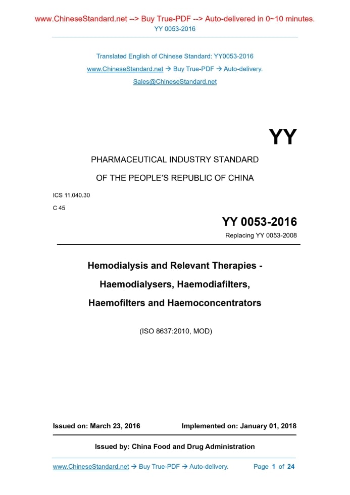 YY 0053-2016: Hemodialysis and relevant therapies - Haemodialysers, haemodiafilters, haemofilters and haemoconcentrators Delivery: 9 seconds. True-PDF full-copy in English & invoice will be downloaded + auto-delivered via email. See step-by-step procedure Status: Valid YY 0053: Historical versions