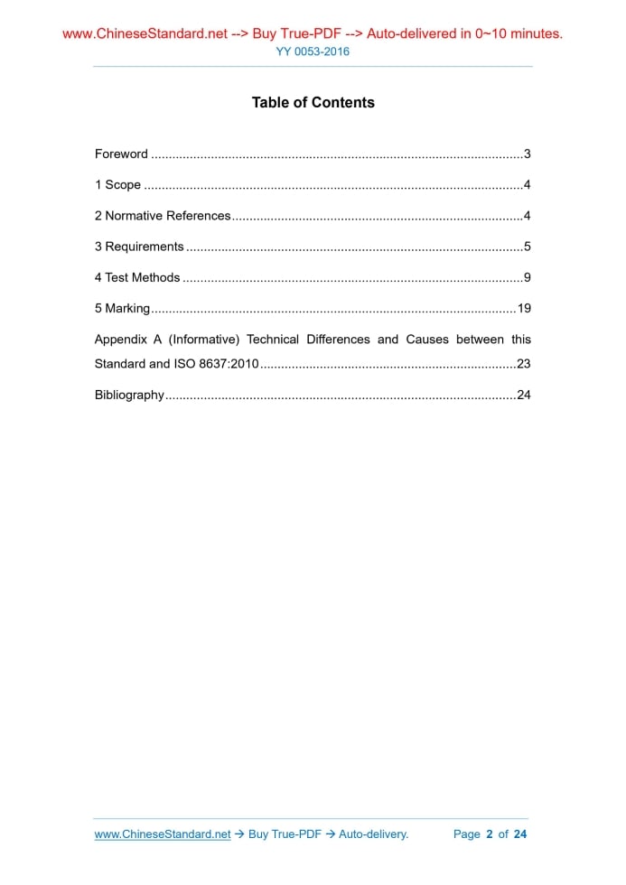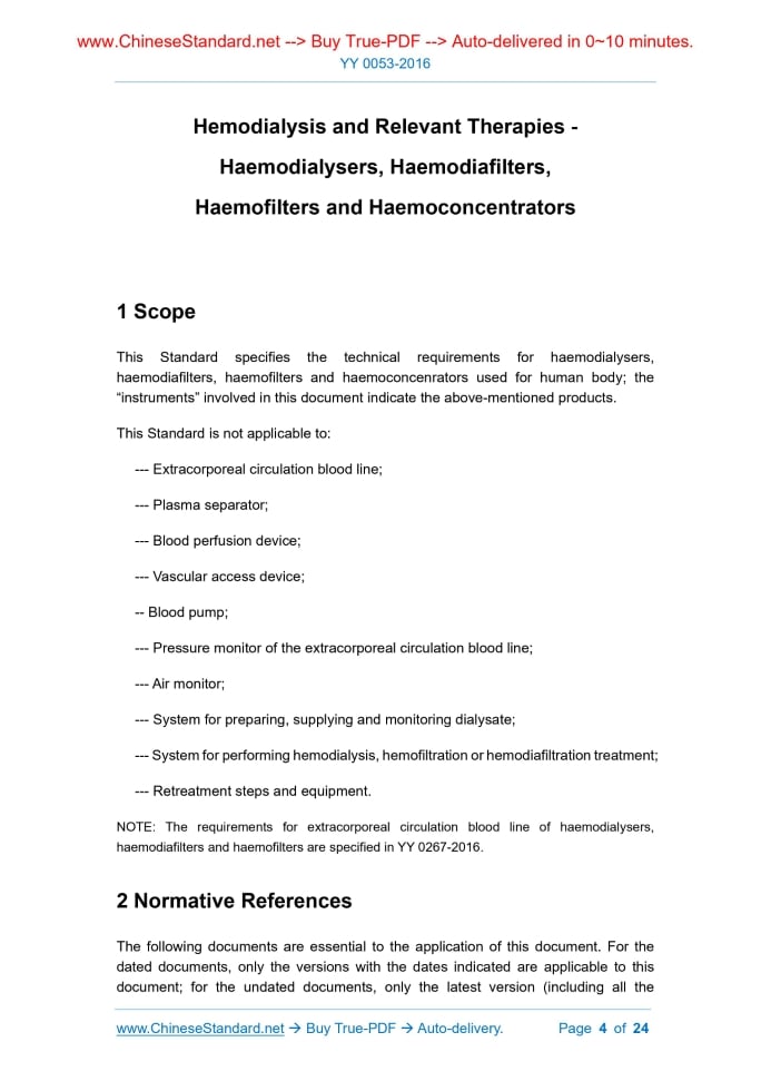 Similar standardsYY 0053-2016: Hemodialysis and relevant therapies - Haemodialysers, haemodiafilters, haemofilters and haemoconcentrators---This is an excerpt. Full copy of true-PDF in English version (including equations, symbols, images, flow-chart, tables, and figures etc.), auto-downloaded/delivered in 9 seconds, can be purchased online: https://www.ChineseStandard.net/PDF.aspx/YY0053-2016 YY PHARMACEUTICAL INDUSTRY STANDARD ICS 11.040.30 C 45 Replacing YY 0053-2008 Hemodialysis and Relevant Therapies - Haemodialysers, Haemodiafilters, Haemofilters and Haemoconcentrators (ISO 8637.2010, MOD) Issued on. MARCH 23, 2016 Implemented on. JANUARY 01, 2018 Issued by. China Food and Drug Administration Table of ContentsForeword... 3 1 Scope... 4 2 Normative References... 4 3 Requirements... 5 4 Test Methods... 9 5 Marking... 19 Appendix A (Informative) Technical Differences and Causes between this Standard and ISO 8637.2010... 23 Bibliography... 24ForewordThis Standard was drafted as per the rules specified in GB/T 1.1-2009. This Standard replaced YY 0053-2008 Cardiovascular Implants and Artificial Organs - Haemodialysers, Haemodiafilters, Haemofilters and Haemoconcentrators. The major technical difference between this Standard and YY 0053-2008 are as follows. --- According to the content of international standards, the screening coefficient increased β2-microglobulin; delete the requirement for pressure drop in the dialysate space; delete the requirement for multiple use of the device; --- According to the relevant content of international standards, supplement the test methods for clearance rate and screening coefficient; --- According to the provisions of relevant national regulations, add the content of β2-microglobulin clearance rate and chemical properties; inspect as per the domestic popular methods and projects, which is suitable for China’s national conditions. This Standard modified to adopt ISO 8637.2010 Cardiovascular Implants and Extracorporeal Systems - Haemodialysers, Haemodiafilters, Haemofilters and Haemoconcentrators. Compared with ISO 8637.2010, this Standard’s major differences can refer to Table A.1. Please note that some of the contents of this document may involve patents. The issuing organization of this document does not assume the responsibility to identify these patents. This Standard was proposed by China Food and Drug Administration. This Standard shall be under the jurisdiction of National Technical Committee for Standardization of Medical Extracorporeal Circulation Equipment (SAC/TC 158). Drafting organizations of this Standard. Weihai Weigao Blood Purification Products Co., Ltd.; and Medical Devices Quality Supervision and Testing Center of China Food and Drug Administration. Chief drafting staffs of this Standard. Wu Jingbiao, Fu Yingbo, He Xiaofan, and Mou Changjun. This Standard was first-time published in 1991; and first-time revised in 2008. Hemodialysis and Relevant Therapies - Haemodialysers, Haemodiafilters, Haemofilters and Haemoconcentrators1 ScopeThis Standard specifies the technical requirements for haemodialysers, haemodiafilters, haemofilters and haemoconcenrators used for human body; the “instruments” involved in this document indicate the above-mentioned products.2 Normative ReferencesThe following documents are essential to the application of this document. For the dated documents, only the versions with the dates indicated are applicable to this document; for the undated documents, only the latest version (including all the amendments) are applicable to this document. GB/T 1962.2 Conical Fittings with a 6% (Luer) Taper for Syringes, Needles and Certain Other Medical Equipment - Part 2.Lock Fittings (GB/T 1962.2-2001; ISO 594-2.1998, IDT)3 RequirementsThe haemodialysers, haemodiafilters, haemofilters and haemoconcentrators shall be free of leakage. The adhesion of the product shall be confirmed as per the following conditions.4 Test MethodsAppropriate test methods shall be selected to evaluate the pyrogenicity of haemodialysers, haemodiafilters, haemofilters and haemoconcentrators. The test shall be performed as per the PRC pharmacopoeia, and shall conform to the provisions of 3.3.5 MarkingAt least the following information is on the single package or can be see through the single package.Appendix A(Informative) Technical Differences and Causes between this Standard and ISO 8637.2010 ......Source: Above contents are excerpted from the full-copy PDF -- translated/reviewed by: www.ChineseStandard.net / Wayne Zheng et al. Tips & Frequently Asked Questions:Question 1: How long will the true-PDF of English version of YY 0053-2016 be delivered?Answer: The full copy PDF of English version of YY 0053-2016 can be downloaded in 9 seconds, and it will also be emailed to you in 9 seconds (double mechanisms to ensure the delivery reliably), with PDF-invoice.Question 2: Can I share the purchased PDF of YY 0053-2016_English with my colleagues?Answer: Yes. The purchased PDF of YY 0053-2016_English will be deemed to be sold to your employer/organization who actually paid for it, including your colleagues and your employer's intranet.Question 3: Does the price include tax/VAT?Answer: Yes. Our tax invoice, downloaded/delivered in 9 seconds, includes all tax/VAT and complies with 100+ countries' tax regulations (tax exempted in 100+ countries) -- See Avoidance of Double Taxation Agreements (DTAs): List of DTAs signed between Singapore and 100+ countriesQuestion 4: Do you accept my currency other than USD?Answer: Yes. www.ChineseStandard.us -- YY 0053-2016 -- Click this link and select your country/currency to pay, the exact amount in your currency will be printed on the invoice. Full PDF will also be downloaded/emailed in 9 seconds.Question 5: Should I purchase the latest version YY 0053-2016?Answer: Yes. Unless special scenarios such as technical constraints or academic study, you should always prioritize to purchase the latest version YY 0053-2016 eve