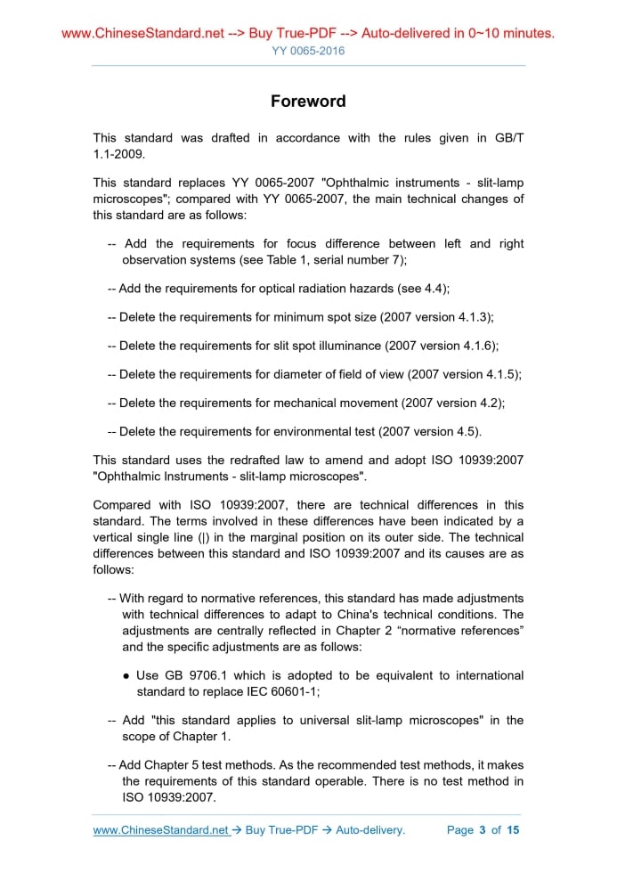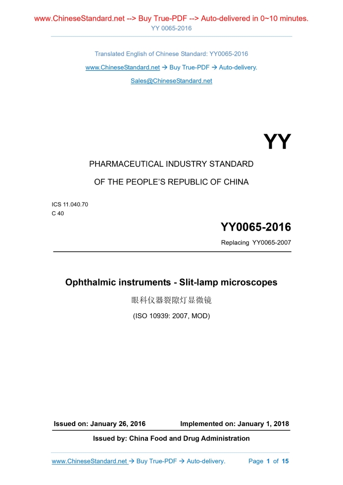 YY 0065-2016: Ophthalmic instruments - Slit-lamp microscopes---This is an excerpt. Full copy of true-PDF in English version (including equations, symbols, images, flow-chart, tables, and figures etc.), auto-downloaded/delivered in 9 seconds, can be purchased online: https://www.ChineseStandard.net/PDF.aspx/YY0065-2016YY PHARMACEUTICAL INDUSTRY STANDARD OF THE PEOPLE’S REPUBLIC OF CHINA ICS 11.040.70 C 40 Replacing YY0065-2007 Ophthalmic instruments - Slit-lamp microscopes (ISO 10939. 2007, MOD) Issued on: JANUARY 26, 2016 Implemented on: JANUARY 1, 2018 Issued by. China Food and Drug Administration Table of ContentsForeword . 3 1 Scope .. 5 2 Normative references . 5 3 Terms and definitions . 5 4 Requirements . 6 5 Test methods . 9 6 Accompanying files .. 15 7 Marks . 15 Foreword This standard was drafted in accordance with the rules given in GB/T 1.1-2009. This standard replaces YY 0065-2007 "Ophthalmic instruments - slit-lamp microscopes"; compared with YY 0065-2007, the main technical changes of this standard are as follows. -- Add the requirements for focus difference between left and right observation systems (see Table 1, serial number 7); -- Add the requirements for optical radiation hazards (see 4.4); -- Delete the requirements for minimum spot size (2007 version 4.1.3); -- Delete the requirements for slit spot illuminance (2007 version 4.1.6); -- Delete the requirements for diameter of field of view (2007 version 4.1.5); -- Delete the requirements for mechanical movement (2007 version 4.2); -- Delete the requirements for environmental test (2007 version 4.5). This standard uses the redrafted law to amend and adopt ISO 10939.2007 "Ophthalmic Instruments - slit-lamp microscopes". Compared with ISO 10939.2007, there are technical differences in this standard. The terms involved in these differences have been indicated by a vertical single line (|) in the marginal position on its outer side. The technical differences between this standard and ISO 10939.2007 and its causes are as follows. -- With regard to normative references, this standard has made adjustments with technical differences to adapt to China's technical conditions. The adjustments are centrally reflected in Chapter 2 “normative references” and the specific adjustments are as follows. ● Use GB 9706.1 which is adopted to be equivalent to international standard to replace IEC 60601-1; -- Add "this standard applies to universal slit-lamp microscopes" in the scope of Chapter 1. -- Add Chapter 5 test methods. As the recommended test methods, it makes the requirements of this standard operable. There is no test method in ISO 10939.2007. Ophthalmic instruments - Slit-lamp microscopes1 ScopeThis standard, together with ISO 15004-1 and ISO 15004-2.2007, specifies the requirements and test methods for slit-lamp microscopes. This standard applies to universal slit-lamp microscopes. This standard does not apply to slit-lamp microscope accessories, such as camera equipment and lasers. If there are differences, this standard takes precedence over ISO 15004-1 and ISO 15004-2.2007.2 Normative referencesThe following documents are essential for the application of this document. For dated references, only the dated version applies to this document. For undated references, the latest edition (including all amendments) applies to this document. GB 9706.1 Medical electrical equipment - Part 1. General requirements for safety (GB 9706.1-2007, IEC 60601-1.1988, IDT) ISO 15004-1 Ophthalmic instruments - Fundamental requirements and test methods - Part 1. General requirements applicable to all ophthalmic instruments ISO 15004-2.2007 Ophthalmic instruments - Fundamental requirements and test methods - Part 2. Light hazard protection3 Terms and definitionsThe following terms and definitions apply to this document. 3.1 Slit-lamp microscope It is an instrument that consists of microscope and rotating illumination system which is capable of producing slit image. e) At the highest visual angular magnification, the resolution of field-of-view center shall be at least 1800Nlp/mm (N is numerical aperture). 4.3.2 High eye point eyepiece If the manufacturer claims to be high eye point eyepiece, the distance between the exit pupil of observation system and the closest part of eyepiece shall be no less than 17mm. 4.4 Optical radiation hazard of slit-lamp microscopes Slit-lamp microscopes shall meet the requirements of ISO 15004-2.2007 for light hazard protection. Slit-lamp microscopes shall be classified as Class-1 instruments or Class-2 instruments according to ISO 15004-2.2007 Chapter 4. ISO 15004-2.2007 applied to slit-lamp microscopes is as follows. a) For Class-1 slit-lamp microscopes. 1) 5.1, 5.2 and 5.4 of ISO 15004-2.2007 apply. 2) The test methods of 6.1, 6.2, 6.4 and 6.5 of ISO 15004-2.2007 apply. 3) If it is determined to be Class-1 instruments, there are no more requirements; if it is determined not to belong to Class-1 instruments, more requirements specified in b) shall apply. b) For Class-2 slit-lamp microscopes. 1) 5.1, 5.3 and 5.5 of ISO 15004-2.2007 apply. 2) The test methods of 6.1, 6.2, 6.3, 6.4, 6.5 and 6.6 of ISO 15004-2.2007 apply. 3) ISO 15004-2.2007 Chapter 7 applies. If the intended use of slit-lamp microscopes includes the use of an accessory 90D lens, measure the related exposure of cornea and lens. The 90D lens (such as Volk lens) shall be placed at 7mm position behind the focal plane of slit-lamp with the largest illuminated area. Exposure measurement is taken at the minimum dimension point of the illuminated area 7mm behind the 90D lens.5 Test methods5.1 Overview microscope) to focus reticle, and the image is clear. Measure the maximum amount of movement between the two after changing the magnification. The result shall meet the requirements of No. 4 in Table 1. 5.6 Errors of the focal plane of lighting system with respect to mechanical axis of rotation Place the reticle with adjustable front-to-back distance on object