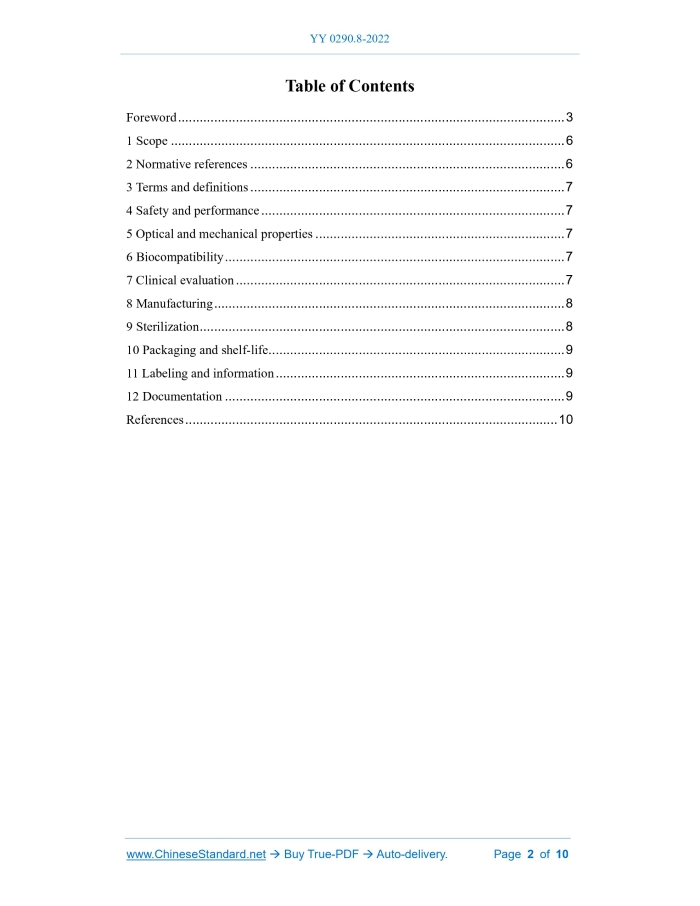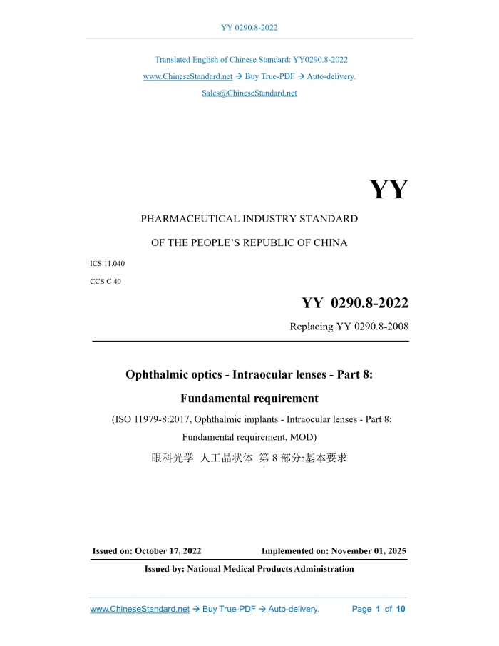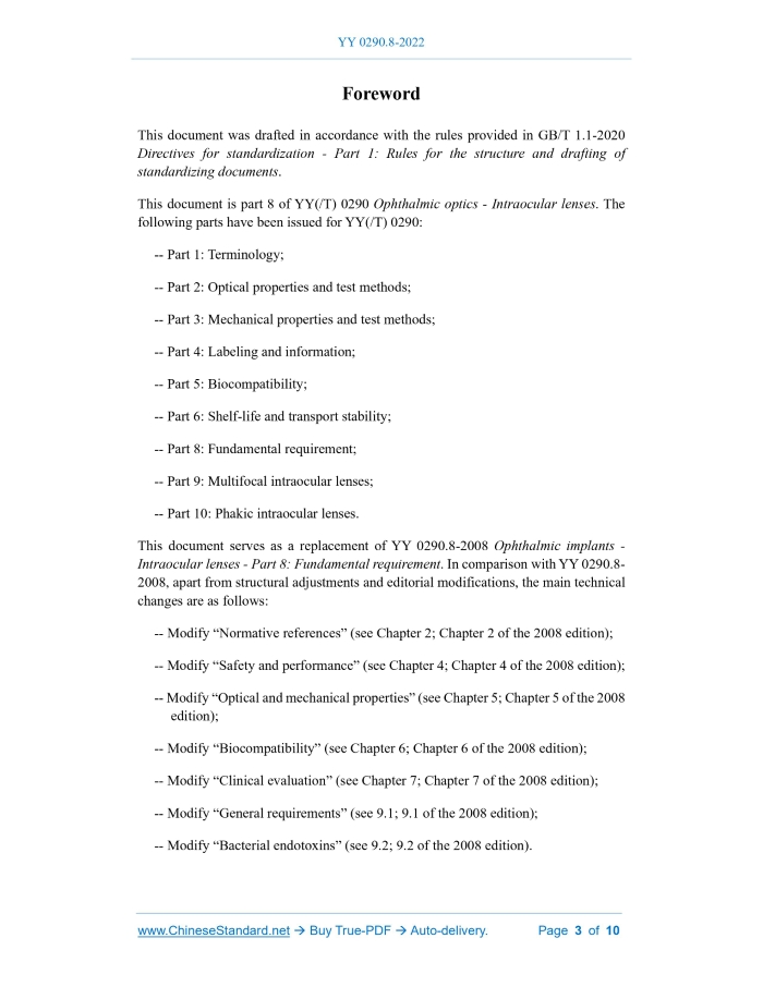 Similar standardsYY 0290.8-2022: Ophthalmic optics - Intraocular lenses - Part 8: Fundamental requirement---This is an excerpt. Full copy of true-PDF in English version (including equations, symbols, images, flow-chart, tables, and figures etc.), auto-downloaded/delivered in 9 seconds, can be purchased online: https://www.ChineseStandard.net/PDF.aspx/YY0290.8-2022YY PHARMACEUTICAL INDUSTRY STANDARD OF THE PEOPLE’S REPUBLIC OF CHINA ICS 11.040 CCS C 40 Replacing YY 0290.8-2008 Ophthalmic optics - Intraocular lenses - Part 8: Fundamental requirement (ISO 11979-8:2017, Ophthalmic implants - Intraocular lenses - Part 8: Fundamental requirement, MOD) ISSUED ON: OCTOBER 17, 2022 IMPLEMENTED ON: NOVEMBER 01, 2025 Issued by: National Medical Products Administration Table of ContentsForeword ... 3 1 Scope ... 6 2 Normative references ... 6 3 Terms and definitions ... 7 4 Safety and performance ... 7 5 Optical and mechanical properties ... 7 6 Biocompatibility ... 7 7 Clinical evaluation ... 7 8 Manufacturing ... 8 9 Sterilization ... 8 10 Packaging and shelf-life ... 9 11 Labeling and information ... 9 12 Documentation ... 9 References ... 10ForewordThis document was drafted in accordance with the rules provided in GB/T 1.1-2020 Directives for standardization - Part 1: Rules for the structure and drafting of standardizing documents. This document is part 8 of YY(/T) 0290 Ophthalmic optics - Intraocular lenses. The following parts have been issued for YY(/T) 0290: -- Part 1: Terminology; -- Part 2: Optical properties and test methods; -- Part 3: Mechanical properties and test methods; -- Part 4: Labeling and information; -- Part 5: Biocompatibility; -- Part 6: Shelf-life and transport stability; -- Part 8: Fundamental requirement; -- Part 9: Multifocal intraocular lenses; -- Part 10: Phakic intraocular lenses. This document serves as a replacement of YY 0290.8-2008 Ophthalmic implants - Intraocular lenses - Part 8: Fundamental requirement. In comparison with YY 0290.8- 2008, apart from structural adjustments and editorial modifications, the main technical changes are as follows: -- Modify “Normative references” (see Chapter 2; Chapter 2 of the 2008 edition); -- Modify “Safety and performance” (see Chapter 4; Chapter 4 of the 2008 edition); -- Modify “Optical and mechanical properties” (see Chapter 5; Chapter 5 of the 2008 edition); -- Modify “Biocompatibility” (see Chapter 6; Chapter 6 of the 2008 edition); -- Modify “Clinical evaluation” (see Chapter 7; Chapter 7 of the 2008 edition); -- Modify “General requirements” (see 9.1; 9.1 of the 2008 edition); -- Modify “Bacterial endotoxins” (see 9.2; 9.2 of the 2008 edition). Ophthalmic optics - Intraocular lenses - Part 8: Fundamental requirement1 ScopeThis document specifies fundamental requirements for all types of intraocular lenses intended for surgical implantation into the anterior segment of the human eye. This document does not apply to corneal implants and transplants.2 Normative referencesThe following documents are referred to in the text in such a way that some or all of their content constitutes requirements of this document. For dated references, only the version corresponding to that date is applicable to this document; for undated references, the latest version (including all amendments) is applicable to this document. YY/T 0287, Medical devices - Quality management systems - Requirements for regulatory purposes (YY/T 0287-2017, ISO 13485:2016, IDT) YY/T 0290.1, Ophthalmic optics - Intraocular lenses - Part 1: Terminology (YY/T 0290.1-2021, ISO 11979-1:2018, MOD) YY 0290.2, Ophthalmic optics - Intraocular lenses - Part 2: Optical properties and test methods (YY 0290.2-2021, ISO 11979-2:2014, MOD) YY 0290.3, Ophthalmic optics - Intraocular lenses - Part 3: Mechanical properties and test methods (YY 0290.3-2018, ISO 11979-3:2012, MOD) YY/T 0290.4, Ophthalmic optics - Intraocular lenses - Part 4: Labeling and information (YY/T 0290.4-2008, ISO 11979-4:2000, IDT) YY 0290.5, Ophthalmic implants - Intraocular lenses - Part 5: Biocompatibility (YY 0290.5-2008, ISO 11979-5:2006, MOD) YY/T 0290.6, Ophthalmic optics - Intraocular lenses - Part 6: Shelf-life and transport stability (YY/T 0290.6-2021, ISO 11979-6:2014, MOD) YY 0290.10, Intraocular lenses - Part 10: Phakic intraocular lenses (YY 0290.10- 2009, ISO 11979-10:2006, MOD) YY/T 0316, Medical devices - Application of risk management to medical devices (YY/T 0316-2016, ISO 14971:2007, rectified, IDT) YY/T 0640, Non-active surgical implants - General requirements (YY/T 0640-2016, ISO 14630:2012, IDT) Pharmacopoeia of the People’s Republic of China3 Terms and definitionsFor the purposes of this document, the terms and definitions given in YY/T 0290.1 apply.4 Safety and performanceThe safety and performance of an intraocular lens shall be demonstrated by pre-clinical and clinical evaluation, including suitable risk in accordance with YY/T 0316. In cases where a test method referenced in YY 0290 is not suitable for a certain design or a certain application, an alternative test method devised by the manufacturer shall be validated, justified and documented.5 Optical and mechanical propertiesThe manufacturer shall ensure that the intraocular lens conforms to applicable requirements in YY 0290.2, YY 0290.3 and YY 0290.10. The manufacturer shall record and justify any deviations from the above standards.6 BiocompatibilityThe manufacturer shall have documented evidence that demonstrates the intraocular lens to be biocompatible by assessment in accordance with YY 0290.5. Manufacturers can take into consideration previous experience and data when determining the extent of further biocompatibility testing.7 Clinical evaluationThe clinical evaluation shall be carried out in accordance with the relevant provisions of the clinical evaluation of medical devices in our country. Note: The first step in the clinical evaluation is a review of the available literature (published