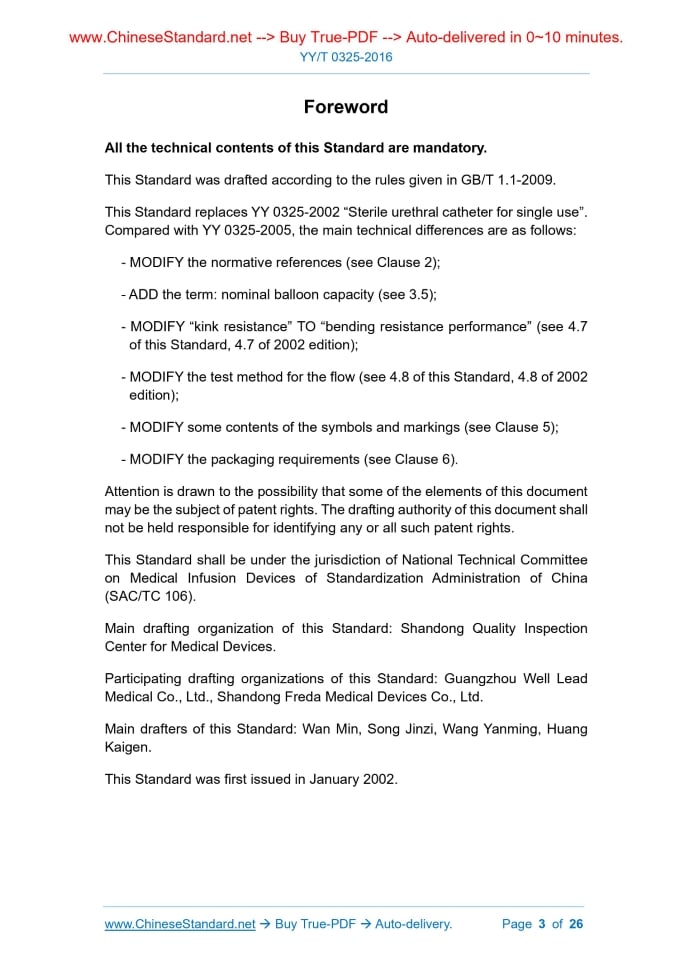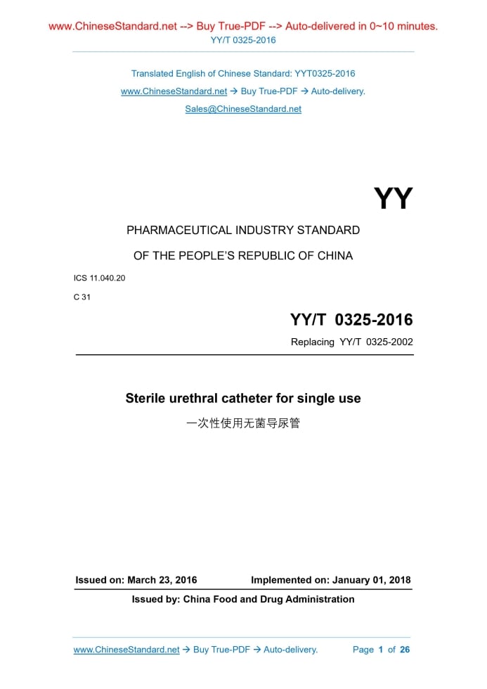 YY 0325-2016: Sterile urethral catheter for single use Delivery: 9 seconds. True-PDF full-copy in English & invoice will be downloaded + auto-delivered via email. See step-by-step procedure Status: Obsolete YY 0325: Historical versions