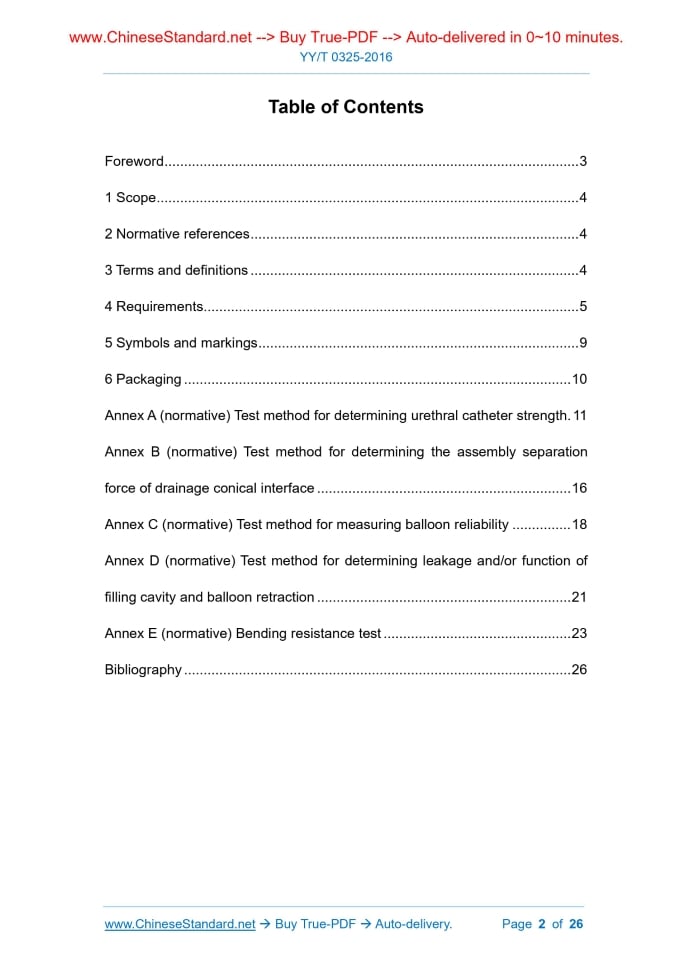 YY 0325-2016: Sterile urethral catheter for single use---This is an excerpt. Full copy of true-PDF in English version (including equations, symbols, images, flow-chart, tables, and figures etc.), auto-downloaded/delivered in 9 seconds, can be purchased online: https://www.ChineseStandard.net/PDF.aspx/YY0325-2016YY PHARMACEUTICAL INDUSTRY STANDARD ICS 11.040.20 C 31 Replacing YY/T 0325-2002 Sterile urethral catheter for single use Issued on: MARCH 23, 2016 Implemented on: JANUARY 01, 2018 Issued by. China Food and Drug Administration Table of ContentsForeword... 3 1 Scope... 4 2 Normative references... 4 3 Terms and definitions... 4 4 Requirements... 5 5 Symbols and markings... 9 6 Packaging... 10 Annex A (normative) Test method for determining urethral catheter strength. 11 Annex B (normative) Test method for determining the assembly separation force of drainage conical interface... 16 Annex C (normative) Test method for measuring balloon reliability... 18 Annex D (normative) Test method for determining leakage and/or function of filling cavity and balloon retraction... 21 Annex E (normative) Bending resistance test... 23 Bibliography... 26ForewordAll the technical contents of this Standard are mandatory. This Standard was drafted according to the rules given in GB/T 1.1-2009. This Standard replaces YY 0325-2002 “Sterile urethral catheter for single use”. Compared with YY 0325-2005, the main technical differences are as follows. - MODIFY the normative references (see Clause 2); - ADD the term. nominal balloon capacity (see 3.5); - MODIFY “kink resistance” TO “bending resistance performance” (see 4.7 of this Standard, 4.7 of 2002 edition); - MODIFY the test method for the flow (see 4.8 of this Standard, 4.8 of 2002 edition); - MODIFY some contents of the symbols and markings (see Clause 5); - MODIFY the packaging requirements (see Clause 6). Attention is drawn to the possibility that some of the elements of this document may be the subject of patent rights. The drafting authority of this document shall not be held responsible for identifying any or all such patent rights. This Standard shall be under the jurisdiction of National Technical Committee on Medical Infusion Devices of Standardization Administration of China (SAC/TC 106). Main drafting organization of this Standard. Shandong Quality Inspection Center for Medical Devices. Participating drafting organizations of this Standard. Guangzhou Well Lead Medical Co., Ltd., Shandong Freda Medical Devices Co., Ltd. Main drafters of this Standard. Wan Min, Song Jinzi, Wang Yanming, Huang Kaigen. This Standard was first issued in January 2002. Sterile urethral catheter for single use1 ScopeThis Standard specifies the terms and definitions, requirements, symbols and markings, packaging, etc. for sterile urethral catheter for single use. This Standard applies to sterile urethral catheter with balloon and without balloon for single use.2 Normative referencesThe following referenced documents are indispensable for the application of this document. For dated references, only the edition cited applies. For undated references, the latest edition of the referenced document (including any amendments) applies. GB/T 1962.1 Conical fittings with a 6 % (Luer) taper for syringes, needles and certain other medical equipment - Part 1.General requirement GB/T 14233.1 Test methods for infusion, transfusion, injection equipment for medical use - Part 1.Chemical analysis methods GB/T 15812.1-2005 Catheters other than intravascular catheters - Part 1. Test methods for common properties GB/T 19633.1 Packaging for terminally sterilized medical devices - Part 1. Requirements for materials, sterile barrier systems and packaging systems YY/T 0313 Medical polymer products - Requirement for package and information supplied by manufacturer YY/T 0466.1 Medical devices - Symbols to be used with medical device labels, labelling and information to be supplied - Part 1.General requirements YY/T 0615.1 Requirements for medical devices to be designated3 Terms and definitionsFor the purpose of this document, the following terms and definitions apply. 3.1Annex A(normative) Test method for determining urethral catheter strength A.1 Principle Urethral catheters with balloon may be used in situ for long periods of time. Therefore, for urethral catheters with balloon, the urethral catheter is immersed in simulated urine for 14 days before the test. For urethral catheters without balloon, this step may be omitted. A tension is applied to the junction between the tip and the shaft of the urethral catheter. For urethral catheters with side holes, tension is applied to the holes; for catheters without side holes, tension is applied between the shaft and the drainage conical interface. After remove the tension, check the urethral catheter for signs of destruction. A.2 Reagents A.2.1 Simulated urine may use either of the following two formulas. a) Simulated urine consists of the following components (pH is about 6.6). The reagents are analytical reagents. Urea 25.0 g Sodium chloride 9.0 g Anhydrous disodium phosphate 2.5 g Ammonium chloride 3.0 g Anhydrous potassium dihydrogen phosphate 2.5 g Creatinine 2.0 g Sodium sulfite, anhydrous 3.0 g Distilled water dilute to 1.0 L Warning. This solution helps the growth of microorganisms. At the end of the tests described in A.3 and C.3, there is likely to be a large amount of microorganisms. These tests shall be carried out by trained personnel. Appropriate preventive measures shall be taken when handling the soaked urethral catheter and discarding the contaminated solution. b) Simulated urine consists of the following components (pH is about 5.5 ~Annex B(normative) Test method for determining the assembly separation force of drainage conical interface B.1 Principle CONNECT the specified test connector to the drainage conical interface of the urethral catheter; APPLY an axial tension; CHECK if the connection is separated. B.2 Instrumen