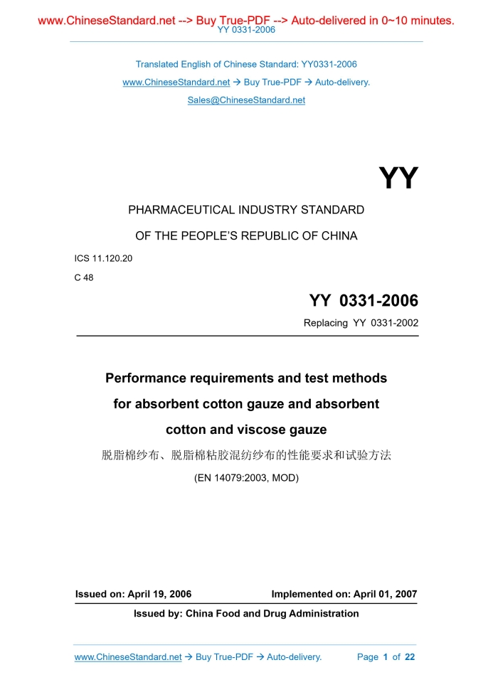 YY 0331-2006: Performance requirements and test methods for absorbent cotton gauze and absorbent cotton and viscose gauze Delivery: 9 seconds. True-PDF full-copy in English & invoice will be downloaded + auto-delivered via email. See step-by-step procedure Status: Obsolete YY 0331: Historical versions