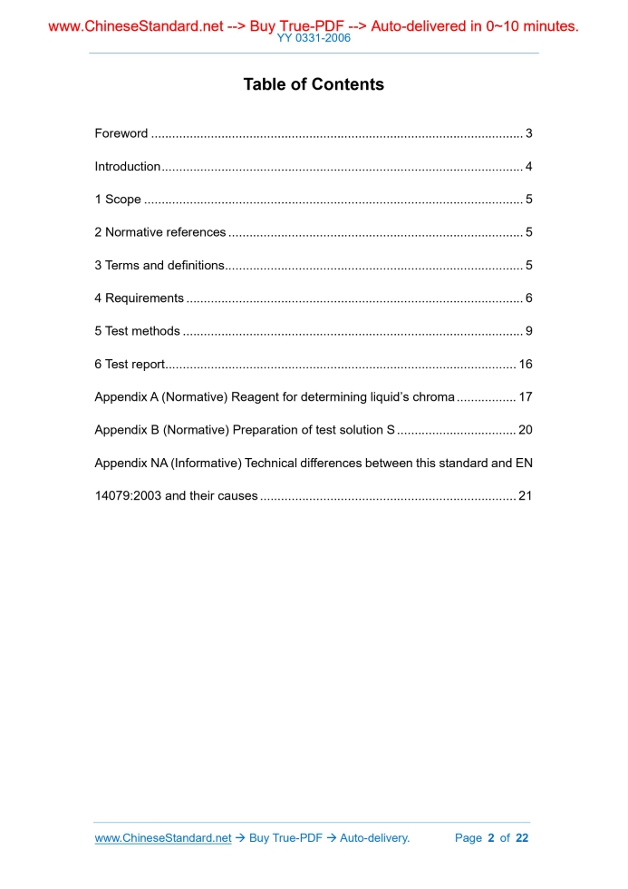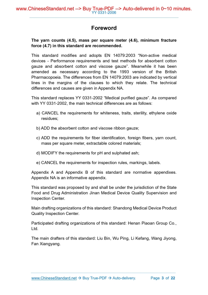 Similar standardsYY 0331-2006: Performance requirements and test methods for absorbent cotton gauze and absorbent cotton and viscose gauze---This is an excerpt. Full copy of true-PDF in English version (including equations, symbols, images, flow-chart, tables, and figures etc.), auto-downloaded/delivered in 9 seconds, can be purchased online: https://www.ChineseStandard.net/PDF.aspx/YY0331-2006 PHARMACEUTICAL INDUSTRY STANDARD ICS 11.120.20 C 48 Replacing YY 0331-2002 Performance requirements and test methods for absorbent cotton gauze and absorbent cotton and viscose gauze (EN 14079.2003, MOD) Issued on: APRIL 19, 2006 Implemented on: APRIL 01, 2007 Issued by. China Food and Drug Administration Table of ContentsForeword... 3 Introduction... 4 1 Scope... 5 2 Normative references... 5 3 Terms and definitions... 5 4 Requirements... 6 5 Test methods... 9 6 Test report... 16 Appendix A (Normative) Reagent for determining liquid’s chroma... 17 Appendix B (Normative) Preparation of test solution S... 20 Appendix NA (Informative) Technical differences between this standard and EN 14079.2003 and their causes... 21ForewordThe yarn counts (4.5), mass per square meter (4.6), minimum fracture force (4.7) in this standard are recommended. This standard modifies and adopts EN 14079.2003 “Non-active medical devices - Performance requirements and test methods for absorbent cotton gauze and absorbent cotton and viscose gauze”. Meanwhile it has been amended as necessary according to the 1993 version of the British Pharmacopoeia. The differences from EN 14079.2003 are indicated by vertical lines in the margins of the clauses to which they relate. The technical differences and causes are given in Appendix NA. This standard replaces YY 0331-2002 “Medical purified gauze”. As compared with YY 0331-2002, the main technical differences are as follows. a) CANCEL the requirements for whiteness, traits, sterility, ethylene oxide residues; b) ADD the absorbent cotton and viscose ribbon gauze; c) ADD the requirements for fiber identification, foreign fibers, yarn count, mass per square meter, extractable colored materials; d) MODIFY the requirements for pH and sulphated ash; e) CANCEL the requirements for inspection rules, markings, labels. Appendix A and Appendix B of this standard are normative appendixes. Appendix NA is an informative appendix. This standard was proposed by and shall be under the jurisdiction of the State Food and Drug Administration Jinan Medical Device Quality Supervision and Inspection Center. Main drafting organizations of this standard. Shandong Medical Device Product Quality Inspection Center. Participated drafting organizations of this standard. Henan Piaoan Group Co., Ltd. The main drafters of this standard. Liu Bin, Wu Ping, Li Kefang, Wang Jiyong, Fan Xiangyang. Performance requirements and test methods for absorbent cotton gauze and absorbent cotton and viscose gauze1 ScopeThis standard specifies the requirements and test methods for absorbent cotton gauze and absorbent cotton and viscose ribbon gauze. This standard does not relate to the drug-containing gauze.2 Normative referencesThe provisions in following documents become the provisions of this standard through reference in this standard. For the dated references, the subsequent amendments (excluding corrections) or revisions do not apply to this standard; however, parties who reach an agreement based on this standard are encouraged to study if the latest versions of these documents are applicable. For undated references, the latest edition of the referenced document applies. Pharmacopoeia of PRC3 Terms and definitionsThe following terms and definitions apply to this standard. 3.1 Absorbent cotton gauze A non-woven plain-woven cotton fabric that has been degreased, bleached or dyed, purified, which has no obvious cotton leaves, cotton seed or other impurities. 3.2 Absorbent cotton ribbon gauze A non-woven plain-woven cotton fabric that has been formed by degreasing, bleaching or dyeing, purifying the continuous woven cloth of various widths which are woven by cotton thread and have selvage. It has no obvious cotton When tested according to 5.8, the minimum fracture force per 50 mm (in Newtons) shall comply with Tables 1 and 2. 4.8 Sinking time When tested according to 5.9, the sinking time shall not exceed 10 s. 4.9 Soluble-in-ether When tested according to 5.10, the total amount of soluble-in-ether shall be not more than 0.50%. 4.10 Surfactant When tested according to 5.11, the height of the surfactant foam after 300 s shall not exceed 2 mm. 4.11 Soluble-in-water When tested according to 5.12, the total amount of soluble-in-water shall be not more than 0.50%. 4.12 Starch and dextrin When tested according to 5.13, the solution shall not appear blue, purple, reddish or light brown. 4.13 Extractable coloring matter When tested according to 5.14, the color of the liquid obtained shall not be deeper than the control solution Y5, GY6 as specified in Appendix A or the control solution as prepared as follows. add 7.0 mL of hydrochloric acid solution (hydrochloric acid which has a mass concentration of 10 g/L) to 3.0 mL of primary blue solution; use hydrochloric acid solution (hydrochloric acid which has a mass concentration of 10 g/L) to dilute 0.5 mL of the above solution to 10.0 mL. 4.14 Loss-on-drying When tested according to 5.15, the mass loss of the absorbent cotton gauze shall not exceed 8.0%; the mass loss of the absorbent cotton and viscose ribbon gauze shall not exceed 11.0%. 4.15 Sulphate ash When tested according to 5.16, the total amount of sulphated ash shall meet the requirements of Table 3. into the liquid surface. Calculate the average value of the three tests, as the test result. Check whether it meets 4.8. 5.10 Test method of soluble-in-ether In a continuous leaching device, use diethyl ether to leach 5.00 g of gauze for 4 h, at least 4 times per hour. Evaporate the ether-extract. Dry the residue at 100 °C ~ 1