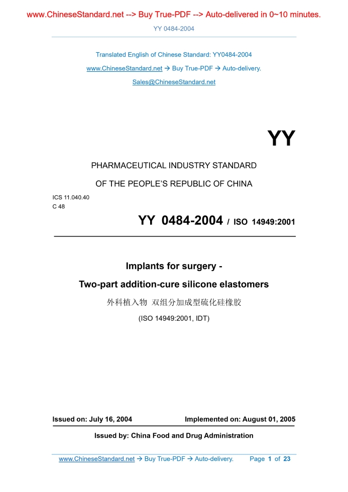 YY 0484-2004: Implants for surgery. Two-part addition-cure silicone elastomers Delivery: 9 seconds. True-PDF full-copy in English & invoice will be downloaded + auto-delivered via email. See step-by-step procedure Status: Obsolete