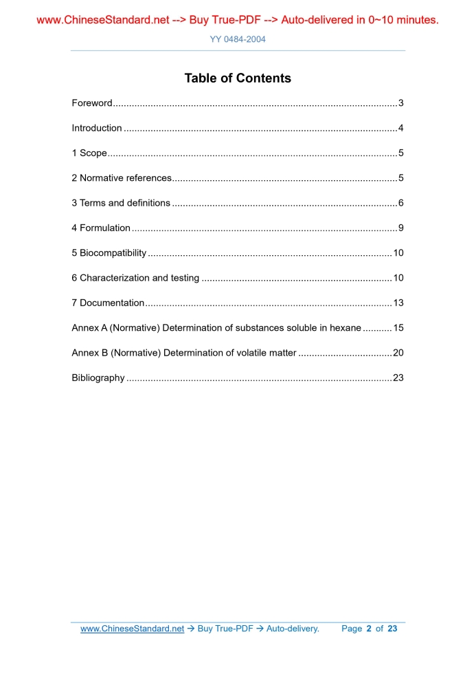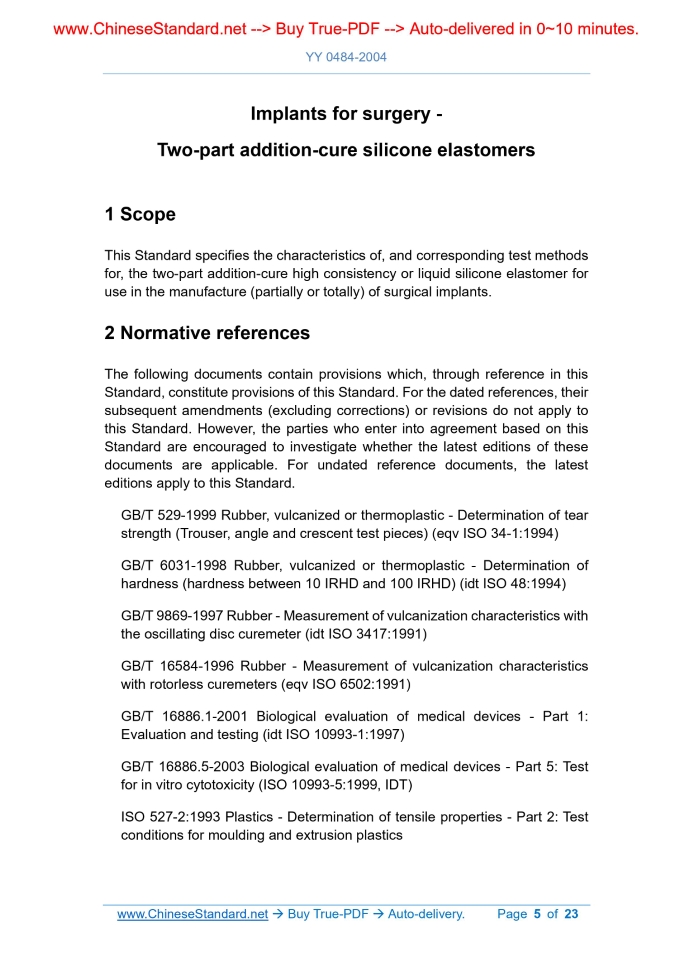 Similar standardsYY 0484-2004: Implants for surgery. Two-part addition-cure silicone elastomers---This is an excerpt. Full copy of true-PDF in English version (including equations, symbols, images, flow-chart, tables, and figures etc.), auto-downloaded/delivered in 9 seconds, can be purchased online: https://www.ChineseStandard.net/PDF.aspx/YY0484-2004YY PHARMACEUTICAL INDUSTRY STANDARD OF THE PEOPLE’S REPUBLIC OF CHINA ICS 11.040.40 C 48 YY 0484-2004 / ISO 14949.2001 Implants for surgery - Two-part addition-cure silicone elastomers (ISO 14949.2001, IDT) Issued on: JULY 16, 2004 Implemented on: AUGUST 01, 2005 Issued by. China Food and Drug Administration Table of ContentsForeword ... 3 Introduction ... 4 1 Scope ... 5 2 Normative references ... 5 3 Terms and definitions ... 6 4 Formulation ... 9 5 Biocompatibility ... 10 6 Characterization and testing ... 10 7 Documentation ... 13 Annex A (Normative) Determination of substances soluble in hexane ... 15 Annex B (Normative) Determination of volatile matter ... 20 Bibliography ... 23 Implants for surgery - Two-part addition-cure silicone elastomers1 ScopeThis Standard specifies the characteristics of, and corresponding test methods for, the two-part addition-cure high consistency or liquid silicone elastomer for use in the manufacture (partially or totally) of surgical implants.2 Normative referencesThe following documents contain provisions which, through reference in this Standard, constitute provisions of this Standard. For the dated references, their subsequent amendments (excluding corrections) or revisions do not apply to this Standard. However, the parties who enter into agreement based on this Standard are encouraged to investigate whether the latest editions of these documents are applicable. For undated reference documents, the latest editions apply to this Standard. GB/T 529-1999 Rubber, vulcanized or thermoplastic - Determination of tear strength (Trouser, angle and crescent test pieces) (eqv ISO 34-1.1994) GB/T 6031-1998 Rubber, vulcanized or thermoplastic - Determination of hardness (hardness between 10 IRHD and 100 IRHD) (idt ISO 48.1994) GB/T 9869-1997 Rubber - Measurement of vulcanization characteristics with the oscillating disc curemeter (idt ISO 3417.1991) GB/T 16584-1996 Rubber - Measurement of vulcanization characteristics with rotorless curemeters (eqv ISO 6502.1991) GB/T 16886.1-2001 Biological evaluation of medical devices - Part 1. Evaluation and testing (idt ISO 10993-1.1997) GB/T 16886.5-2003 Biological evaluation of medical devices - Part 5. Test for in vitro cytotoxicity (ISO 10993-5.1999, IDT) ISO 527-2.1993 Plastics - Determination of tensile properties - Part 2. Test conditions for moulding and extrusion plastics ......Source: Above contents are excerpted from the full-copy PDF -- translated/reviewed by: www.ChineseStandard.net / Wayne Zheng et al. Tips & Frequently Asked Questions:Question 1: How long will the true-PDF of English version of YY 0484-2004 be delivered?Answer: The full copy PDF of English version of YY 0484-2004 can be downloaded in 9 seconds, and it will also be emailed to you in 9 seconds (double mechanisms to ensure the delivery reliably), with PDF-invoice.Question 2: Can I share the purchased PDF of YY 0484-2004_English with my colleagues?Answer: Yes. The purchased PDF of YY 0484-2004_English will be deemed to be sold to your employer/organization who actually paid for it, including your colleagues and your employer's intranet.Question 3: Does the price include tax/VAT?Answer: Yes. Our tax invoice, downloaded/delivered in 9 seconds, includes all tax/VAT and complies with 100+ countries' tax regulations (tax exempted in 100+ countries) -- See Avoidance of Double Taxation Agreements (DTAs): List of DTAs signed between Singapore and 100+ countriesQuestion 4: Do you accept my currency other than USD?Answer: Yes. www.ChineseStandard.us -- YY 0484-2004 -- Click this link and select your country/currency to pay, the exact amount in your currency will be printed on the invoice. Full PDF will also be downloaded/emailed in 9 seconds.How to buy and download a true PDF of English version of YY 0484-2004?A step-by-step guide to download PDF of YY 0484-2004_EnglishStep 1: Visit website https://www.ChineseStandard.net (Pay in USD), or https://www.ChineseStandard.us (Pay in any currencies such as Euro, KRW, JPY, AUD).Step 2: Search keyword "YY 0484-2004". Step 3: Click "Add to Cart". If multiple PDFs are required, repeat steps 2 and 3 to add up to 12 PDFs to cart. Step 4: Select payment option (Via payment agents Stripe or PayPal). Step 5: Customize Tax Invoice -- Fill up your email etc. Step 6: Click "Checkout". Step 7: Make payment by credit card, PayPal, Google Pay etc. After the payment is completed and in 9 seconds, you will receive 2 emails attached with the purchased PDFs and PDF-invoice, respectively. Step 8: Optional -- Go to download PDF. Step 9: Optional -- Click Open/Download PDF to download PDFs and invoice. See screenshots for above steps: Steps 1~3 Steps 4~6 Step 7 Step 8 Step 9 |