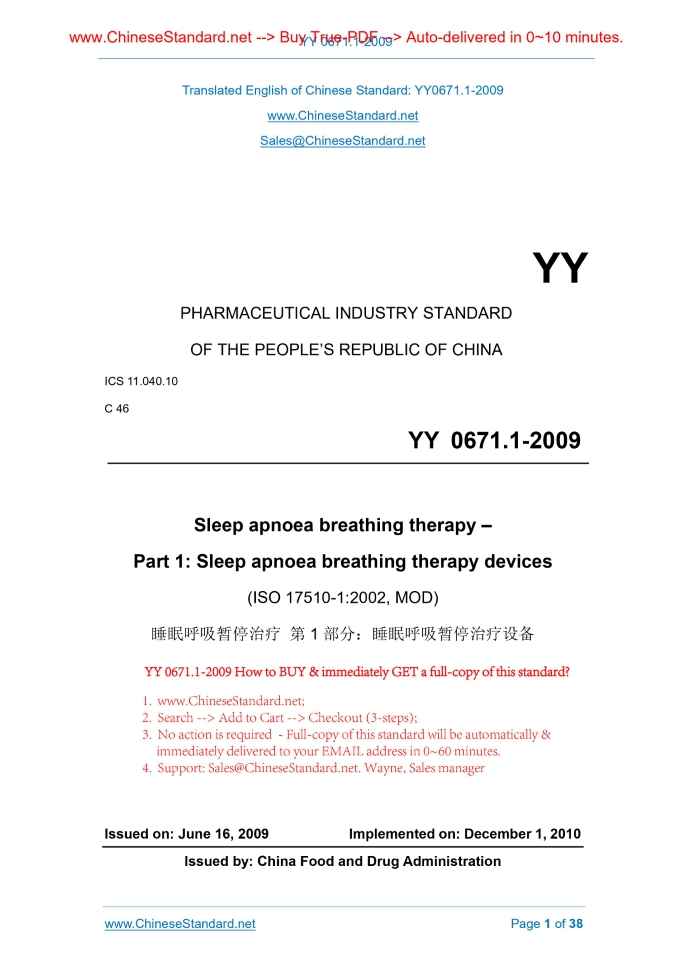 YY 0671.1-2009: Sleep apnoea breathing therapy. Prat 1: Sleep apnoea breathing therapy devices Delivery: 9 seconds. True-PDF full-copy in English & invoice will be downloaded + auto-delivered via email. See step-by-step procedure Status: Obsolete YY 0671.1: Historical versions