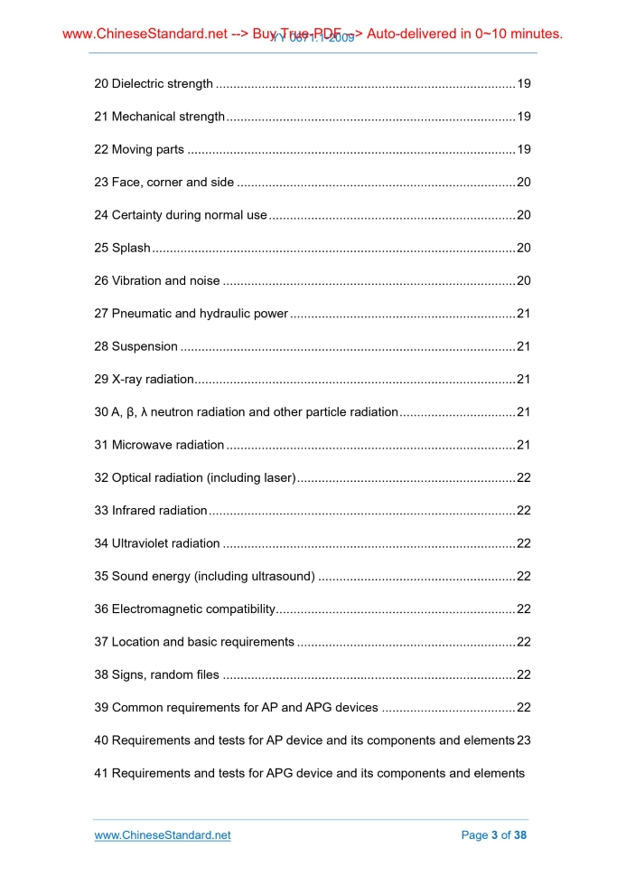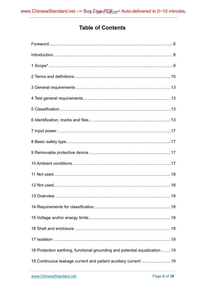 Similar standardsYY 0671.1-2009: Sleep apnoea breathing therapy. Prat 1: Sleep apnoea breathing therapy devices---This is an excerpt. Full copy of true-PDF in English version (including equations, symbols, images, flow-chart, tables, and figures etc.), auto-downloaded/delivered in 9 seconds, can be purchased online: https://www.ChineseStandard.net/PDF.aspx/YY0671.1-2009YY PHARMACEUTICAL INDUSTRY STANDARD ICS 11.040.10 C 46 Sleep apnoea breathing therapy – Part 1.Sleep apnoea breathing therapy devices (ISO 17510-1.2002, MOD) Issued on: JUNE 16, 2009 Implemented on: DECEMBER 1, 2010 Issued by. China Food and Drug Administration 3.No action is required - Full-copy of this standard will be automatically & immediately delivered to your EMAIL address in 0~60 minutes. Table of ContentsForeword... 6 Introduction... 8 1 Scope*... 9 2 Terms and definitions... 10 3 General requirements... 13 4 Test general requirements... 13 5 Classification... 13 6 Identification, marks and files... 13 7 Input power... 17 8 Basic safety type... 17 9 Removable protective device... 17 10 Ambient conditions... 17 11 Not used... 18 12 Not used... 18 13 Overview... 18 14 Requirements for classification... 18 15 Voltage and/or energy limits... 18 16 Shell and enclosure... 18 17 Isolation... 19 18 Protection earthing, functional grounding and potential equalization... 19 19 Continuous leakage current and patient auxiliary current... 19 20 Dielectric strength... 19 21 Mechanical strength... 19 22 Moving parts... 19 23 Face, corner and side... 20 24 Certainty during normal use... 20 25 Splash... 20 26 Vibration and noise... 20 27 Pneumatic and hydraulic power... 21 28 Suspension... 21 29 X-ray radiation... 21 30 Α, β, λ neutron radiation and other particle radiation... 21 31 Microwave radiation... 21 32 Optical radiation (including laser)... 22 33 Infrared radiation... 22 34 Ultraviolet radiation... 22 35 Sound energy (including ultrasound)... 22 36 Electromagnetic compatibility... 22 37 Location and basic requirements... 22 38 Signs, random files... 22 39 Common requirements for AP and APG devices... 22 40 Requirements and tests for AP device and its components and elements 23 41 Requirements and tests for APG device and its components and elements ... 23 42 Over-temperature... 23 43* Fire protection... 23 44 Overflow, liquid spill, leak, moisture, liquid injection, cleaning, disinfection, sterilization and compatibility... 24 45 Pressure vessel and pressured parts... 24 46 Not used... 24 47 Static charge... 24 48 Biocompatibility... 25 49 Power supply interruption... 25 50 Accuracy of work data... 25 51 Hazardous output prevention... 25 52 Abnormal operation and fault status... 26 53 Ambient test... 26 54 Overview... 26 55 Shell and enclosure... 27 56 Components and elements... 27 57 Network power parts, components and wiring... 30 58 Protective ground - terminals and connections... 30 59 Structure and wiring... 30 Annex... 30 Annex A (Informative) Basic principles... 31 Annex B (Informative) Glossary... 37 Bibliography... 38ForewordYY 0671 Sleep apnoea breathing therapy consists of the following parts. -- Part 1.Sleep apnoea breathing therapy devices; -- Part 2.Masks and application accessories. This Part is the first part of YY 0671. The modification of this Part uses the International Standard ISO 17510-1.2002 Sleep apnoea breathing therapy -- Part 1.Sleep apnoea breathing therapy devices. The main difference between this Part and ISO 17510-1.2002 is as follows. This Part modified Clause 2 “Normative references” of ISO 17510-1.2002 to sub-clause 1.101, Clause 3 “Terms and definitions” to Clause 2, so as to be consistent with the common standard number. This Part is a special standard based on GB 9706.1-2007 Medical electrical equipment - Part 1.General requirements for safety (a general standard). It shall be used together with GB 9706.1-2007. Clause 36 Electromagnetic compatibility of this Part shall be implemented concurrently with YY 0505-2005 (IEC 60601-1-2.2001, IDT) Medical electrical equipment - Part 1-2.General requirements for safety - Collateral standards. Electromagnetic compatibility - Requirements and tests. Clause 56 of this Part referred to EN 556 Sterilization of medical devices. Requirements for medical devices to be designated "STERILE", PrEN 737-6.1998 Medical gas pipeline systems - Part 6.Dimensions of probes for terminal units for compressed medical gases and vacuum, EN 739 Low-pressure hose assemblies for use with medical gases, EN ISO 8185 Humidifiers for medical use - General requirements for humidification systems, EN ISO 9360-1 Anaesthetic and respiratory equipment -- Heat and moisture exchangers (HMEs) for humidifying respired gases in humans -- Part 1.HMEs for use with minimum tidal volumes of 250 ml. It shall be implemented concurrently with these standards after they are converted to national or industry standards. It shall be explained in the preparation instructions. Annex AA and Annex BB of this Part are informative. This Part was proposed by a... ......Source: Above contents are excerpted from the full-copy PDF -- translated/reviewed by: www.ChineseStandard.net / Wayne Zheng et al. |