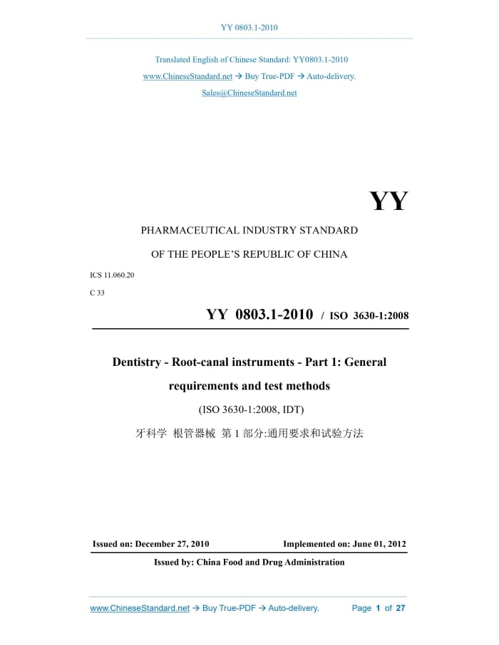 YY 0803.1-2010: Dentistry. Root-canal instruments. Part 1: General requirements and test methods Delivery: 9 seconds. True-PDF full-copy in English & invoice will be downloaded + auto-delivered via email. See step-by-step procedure Status: Obsolete YY 0803.1: Historical versions