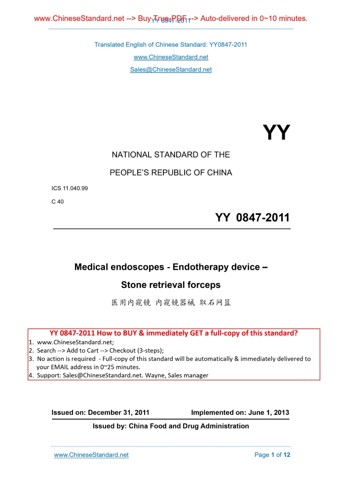 YY 0847-2011: Medical endoscopes - Endotherapy device - Stone retrieval forceps---This is an excerpt. Full copy of true-PDF in English version (including equations, symbols, images, flow-chart, tables, and figures etc.), auto-downloaded/delivered in 9 seconds, can be purchased online: https://www.ChineseStandard.net/PDF.aspx/YY0847-2011YY NATIONAL STANDARD OF THE PEOPLE’S REPUBLIC OF CHINA ICS 11.040.99 C 40 Medical endoscopes - Endotherapy device – Stone retrieval forceps Issued on: DECEMBER 31, 2011 Implemented on: JUNE 1, 2013 Issued by. China Food and Drug Administration Table of ContentsForeword ... 3 1 Scope ... 4 2 Normative references ... 4 3 Terms and definitions ... 5 4 Requirements ... 5 5 Test methods ... 9 6 Inspection rules ... 12ForewordThis Standard was drafted in accordance with the rules given in GB/T 1.1-2009. Please note that some content of this document may involve patents. The issuing agency of this document does not undertake the responsibility for the identification of these patents. This Standard was proposed by China Food and Drug Administration. This Standard shall be under the jurisdiction of National Medical Optical Instrument Standardization Technical Committee (SAC/TC103/SC1). The drafting organizations of this Standard. Supervising and Testing Center of Hangzhou Zhejiang Institute of State Food and Drug Administration, and Zhejiang Institute for the Control of Medical Device. Main drafters of this Standard. Zhang Qinyuan, Jia Xiaohang, Yan Qinglai, He Tao and Qi Weiming. Medical endoscopes - Endotherapy device – Stone retrieval forceps1 ScopeThis Standard specifies the scope, terms and definitions, requirements and test methods of stone retrieval forceps. This Standard is applicable to stone retrieval forceps that is used for endoscopic surgery as an independent product.2 Normative referencesThe following referenced documents are indispensable for the application of this document. For dated references, only the edition cited applies. For undated references, the latest edition of the referenced document (including any amendments) applies. GB/T 1962.1-2001 Conical fittings with a 6% (Luer) taper for syringes, needles and certain other medical equipment - Part 1. General requirement GB/T 1962.2-2001 Conical fittings with a 6% (Luer) taper for syringes, needles and certain other medical equipment - Part 2. Lock fittings GB 4234-2003 Stainless steel for surgical implants GB/T 14233.1-2008 Test methods for infusion transfusion injection equipment for medical use - Part 1. Chemical analysis methods GB/T 14233.2-2005 Test methods for infusion, transfusion, injection equipment for medical use - Part 2. Biological test methods GB/T 16886.1 Biological evaluation of medical devices - Part 1. Evaluation and testing within a risk management process YY/T 0149-2006 Medical instruments of stainless steel - Test methods of corrosion resistance YY 0294.1-2005 Surgical instruments - Metallic materials - Part 1. Stainless steel YY/T 1052-2004 Marking requirements for surgical instruments3 Terms and definitionsThe following terms and definitions are applicable to this document. 3.1 Wire basket A mesh basket that is used for taking stone, foreign matter or tissue sample. 3.2 Stone retrieval forceps An endotherapy device that works with designated endoscope, which is mainly composed of handle, slender guiding-rope and guiding-duct, and wire basket on the head. It traps the stone, foreign matter or tissue sample via wire basket’s circle; and firmly catches the stone, foreign matter or tissue sample through contraction of wire basket. 3.3 Insertion portion A part of stone retrieval forceps which can be inserted into human nature orifice, surgical incision, endoscope’s device channel or endotherapy device’s channel. 3.4 Maximum insertion portion width The maximum external width of insertion portion. 3.5 Working length The maximum length of insertion portion of stone retrieval forceps. 3.6 Endotherapy device A medical device, which is used in endoscopic surgery, goes into human nature orifice or surgical incision through the same or different channel with endoscope, so as to realize examination, diagnosis or treatment. Note 1. Endotherapy device includes some devices that lead the endotherapy device to insert. It also includes some devices that are used under observation of endoscope and go from human opening which is different from the endoscope, for safety purpose.4 Requirements4.1 Material used in the part of contacting with patients 4.1.1 Requirements for chemical composition Material used in the part of contacting with patients shall be clearly indicated in any possible form by the manufacturer. Metal material shall be marked with trademark and/or code as well as the material’s chemical composition requirements. Metal material’s chemical composition shall be verified by experiment. 4.1.2 Biocompatibility For material used in the part of contacting with patients, it shall conduct biological safety evaluation according to principles and requirements in GB/T 16886.1, so as to prove that it has good biocompatibility. Biological evaluation shall consider the results of biological test. The selection of test items are conducted according to the guideline of GB/T 16886.1. Relevant parts of GB/T 16886 are preferred for all the tests. For material that has previously been proved as applicable, if it can prove that the following manufacturing process is insufficient to produce any biological safety hazards, then it may be exempted from repeated biological test. Note 1. When device’s material in design has demonstrable history of using in specific application OR any obtainable material’s and/or device’s information from other aspects, it shall be regarded that the material has been proved as applicable. Note 2. If metal material uses medical metal material that is suitable in application scope of national or industrial standard, it may be exempted from repeated biolo