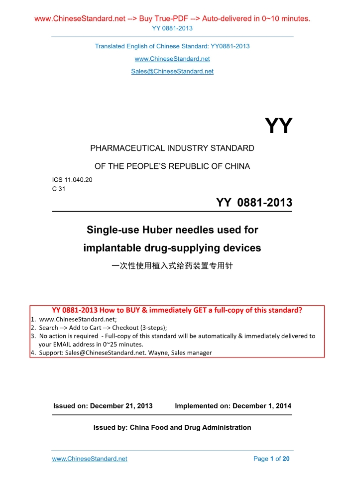 YY 0881-2013: Single-use Huber neeldes used for implantable drug-supplying devices Delivery: 9 seconds. True-PDF full-copy in English & invoice will be downloaded + auto-delivered via email. See step-by-step procedure Status: Obsolete