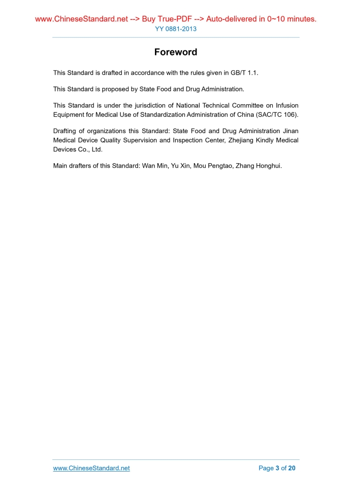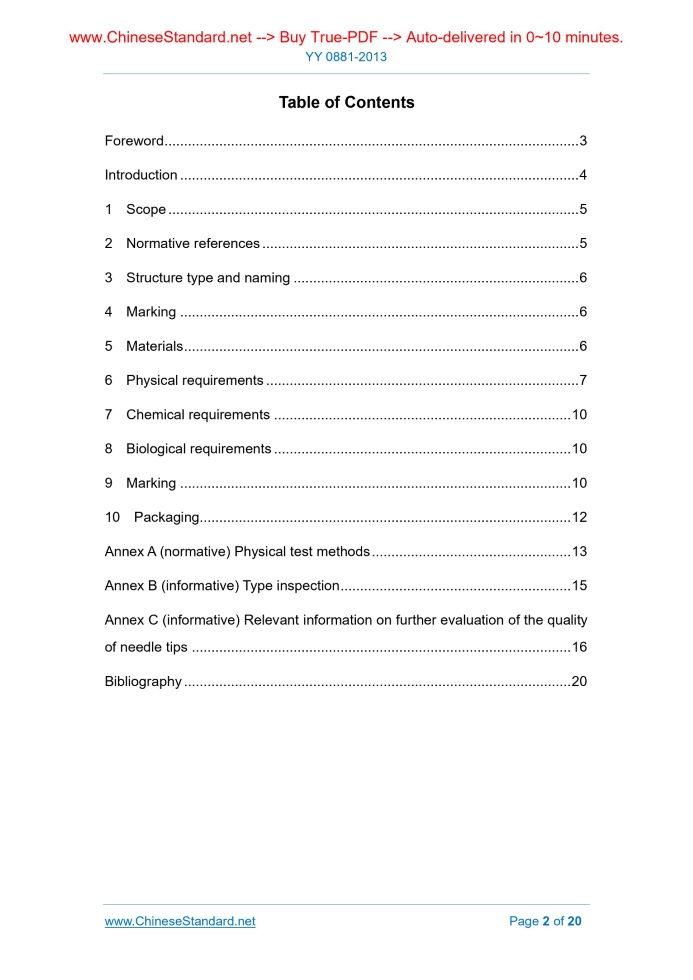 YY 0881-2013: Single-use Huber neeldes used for implantable drug-supplying devices---This is an excerpt. Full copy of true-PDF in English version (including equations, symbols, images, flow-chart, tables, and figures etc.), auto-downloaded/delivered in 9 seconds, can be purchased online: https://www.ChineseStandard.net/PDF.aspx/YY0881-2013YY PHARMACEUTICAL INDUSTRY STANDARD OF THE PEOPLE’S REPUBLIC OF CHINA ICS 11.040.20 C 31 Single-use Huber needles used for implantable drug-supplying devices Issued on: DECEMBER 21, 2013 Implemented on: DECEMBER 1, 2014 Issued by. China Food and Drug Administration Table of ContentsForeword ... 3 Introduction ... 4 1 Scope ... 5 2 Normative references ... 5 3 Structure type and naming ... 6 4 Marking ... 6 5 Materials ... 6 6 Physical requirements ... 7 7 Chemical requirements ... 10 8 Biological requirements ... 10 9 Marking ... 10 10 Packaging... 12 Annex A (normative) Physical test methods ... 13 Annex B (informative) Type inspection ... 15 Annex C (informative) Relevant information on further evaluation of the quality of needle tips ... 16 Bibliography ... 20ForewordThis Standard is drafted in accordance with the rules given in GB/T 1.1. This Standard is proposed by State Food and Drug Administration. This Standard is under the jurisdiction of National Technical Committee on Infusion Equipment for Medical Use of Standardization Administration of China (SAC/TC 106). Drafting of organizations this Standard. State Food and Drug Administration Jinan Medical Device Quality Supervision and Inspection Center, Zhejiang Kindly Medical Devices Co., Ltd. Main drafters of this Standard. Wan Min, Yu Xin, Mou Pengtao, Zhang Honghui.IntroductionAfter the implantable drug-supplying device as specified in YY 0332 implants subcutaneously, it needs to use a Huber needle to puncture and inject into its injection seat, through which the drug will be infused into the body’s fluid circulation system or specific parts. Experiments show that using traditional intravenous infusion needle or hypodermic needle to puncture the injection seat of the drug-supplying device will easily produce debris, which will bring not only harm to the human body when falling into the human body, but also bad effects on the device life and performance. The configuration of the Huber needle specified in this Standard can significantly reduce the amount of debris produced during the puncture process. The implantable drug-supplying device is divided into two types, i.e. hypodermic needle and infusion needle, according to the use. At present, the structural feature of all Huber needles for subcutaneous puncture is that there is a bending angle between the needle tip and the needle tubing axis, so that the first bevel of the needle tip is parallel to the needle tubing axis, and the edge becomes a “side hole”, to reduce debris produced during the puncture process. There is a kind of Huber needle on the market, its composition is as same as the composition of the hypodermic needle; this kind of needle not only has a bending angle on the needle tip, but also the needle tubing is bent into 90° to make it became the infusion needle. Considering that the needle is clinically difficult to puncture, the committee does not advocate such a design, so that this type of Huber needle is not included in the schematic diagram given in this Standard. In addition to the examples given by the standard, there are many types of Huber infusion needles seen on the market, such as that with anti-acupuncture protection device, injection seat and other components. The product with these components may refer to the relevant infusion, injection device standards. This Standard does not repeat the requirements for these components. Not easy to produce falling debris during the puncture process is a widely-concerned requirement. However, due to the absence of reference material for puncture debris test, it is not possible to develop a test method for evaluating the puncture debris performance of the needle tip. Nonetheless, C.2 of this Standard recommends a reference method for evaluating puncture debris. The standardized test method in the future, if any, will be added to this Standard. Single-use Huber needles used for implantable drug-supplying devices1 ScopeThis Standard specifies the requirements for single-use Huber needles used for implantable drug-supplying devices (including infusion needles and hypodermic needles) to ensure the compatibility of implantable drug-supplying devices and infusion and injection devices. This Standard provides guidance on the performance and quality specifications of materials used for Huber needles. This Standard does not involve the anti-acupuncture safety requirements for Huber needles.2 Normative referencesThe following documents are indispensable for the application of this document. For dated references, only the dated edition applies to this document. For undated references, the latest edition (including all amendments) applies to this document. GB/T 1962.1 Conical fittings with a 6 % (Luer) taper for syringes, needles and certain other medical equipment - Part 1. General requirement GB/T 1962.2 Conical fittings with a 6 % (Luer) taper for syringes, needles and certain other medical equipment - Part 2. Lock fittings GB 8368 Infusion sets for single use - gravity feed GB 15811 Sterile hypodermic needles for single use GB 18457 Stainless steel needle tubing for the manufacture of medical devices GB 18671 Intravenous needles for single use YY 0286.4-2006 Special infusion sets - Part 4. Single-use infusion equipment for use with pressure infusion apparatus YY/T 0296 Hypodermic needles for single use - Color coding for identification 6.7 Needle tip 6.7.1 The needle tip of the Huber needle shall have a bending angle facing the direction of the cutting edge (which is approximately equal to the first bevel angle α of the needle tip), so that the first bevel is parallel to the needle t