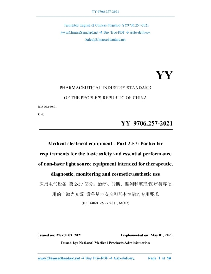 YY 9706.257-2021: Medical electrical equipment - Part 2-57: Particular requirements for the basic safety and essential performance of non-laser light source equipment intended for therapeutic, diagnostic, monitoring and cosmetic/aesthetic use Delivery: 9 seconds. True-PDF full-copy in English & invoice will be downloaded + auto-delivered via email. See step-by-step procedure Status: Valid