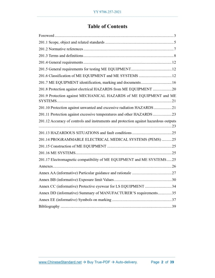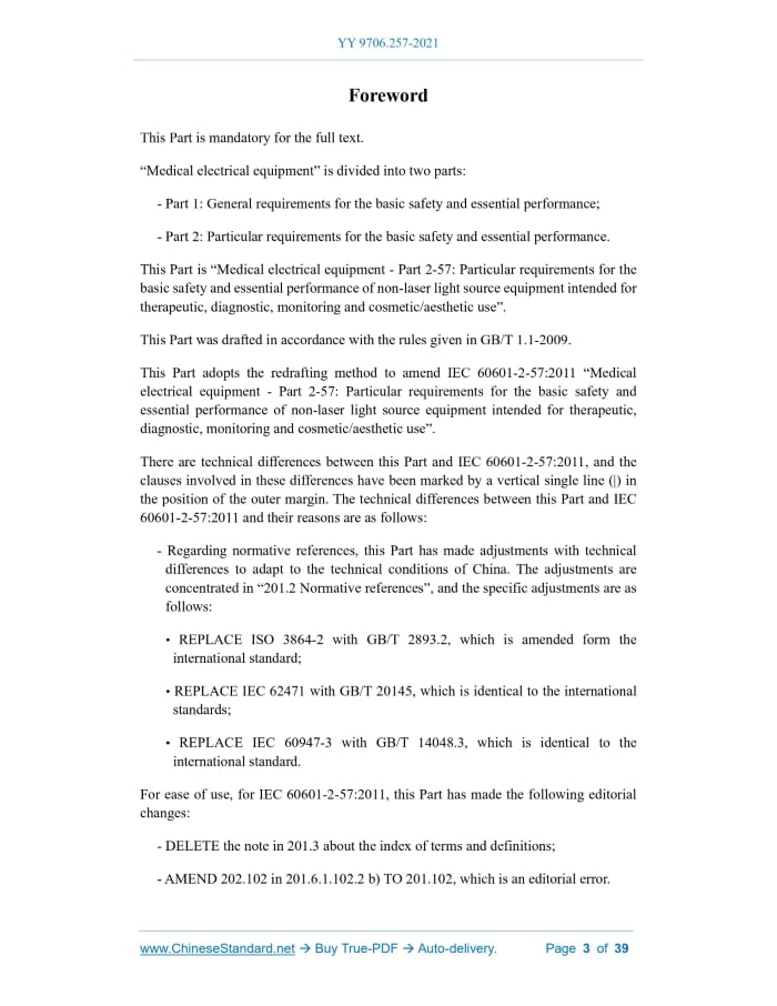 Similar standardsYY 9706.257-2021: Medical electrical equipment - Part 2-57: Particular requirements for the basic safety and essential performance of non-laser light source equipment intended for therapeutic, diagnostic, monitoring and cosmetic/aesthetic use---This is an excerpt. Full copy of true-PDF in English version (including equations, symbols, images, flow-chart, tables, and figures etc.), auto-downloaded/delivered in 9 seconds, can be purchased online: https://www.ChineseStandard.net/PDF.aspx/YY9706.257-2021 YY PHARMACEUTICAL INDUSTRY STANDARD ICS 01.040.01 C 40 Medical electrical equipment - Part 2-57.Particular requirements for the basic safety and essential performance of non-laser light source equipment intended for therapeutic, diagnostic, monitoring and cosmetic/aesthetic use (IEC 60601-2-57.2011, MOD) Issued on. MARCH 09, 2021 Implemented on. MAY 01, 2023 Issued by. National Medical Products Administration Table of ContentsForeword... 3 201.1 Scope, object and related standards... 5 201.2 Normative references... 7 201.3 Terms and definitions... 8 201.4 General requirements... 12 201.5 General requirements for testing ME EQUIPMENT... 12 201.6 Classification of ME EQUIPMENT and ME SYSTEMS... 12 201.7 ME EQUIPMENT identification, marking and documents... 16 201.8 Protection against electrical HAZARDS from ME EQUIPMENT... 20 201.9 Protection against MECHANICAL HAZARDS of ME EQUIPMENT and ME SYSTEMS... 21 201.10 Protection against unwanted and excessive radiation HAZARDS... 21 201.11 Protection against excessive temperatures and other HAZARDS... 23 201.12 Accuracy of controls and instruments and protection against hazardous outputs ... 23 201.13 HAZARDOUS SITUATIONS and fault conditions... 25 201.14 PROGRAMMABLE ELECTRICAL MEDICAL SYSTEMS (PEMS)... 25 201.15 Construction of ME EQUIPMENT... 25 201.16 ME SYSTEMS... 25 201.17 Electromagnetic compatibility of ME EQUIPMENT and ME SYSTEMS... 25 Annexes... 26 Annex AA (informative) Particular guidance and rationale... 27 Annex BB (informative) Exposure limit Values... 30 Annex CC (informative) Protective eyewear for LS EQUIPMENT... 34 Annex DD (informative) Summary of MANUFACTURER’S requirements... 35 Annex EE (informative) Symbols on marking... 37 Bibliography... 39ForewordThis Part is mandatory for the full text. “Medical electrical equipment” is divided into two parts. - Part 1.General requirements for the basic safety and essential performance; - Part 2.Particular requirements for the basic safety and essential performance. This Part is “Medical electrical equipment - Part 2-57.Particular requirements for the basic safety and essential performance of non-laser light source equipment intended for therapeutic, diagnostic, monitoring and cosmetic/aesthetic use”. This Part was drafted in accordance with the rules given in GB/T 1.1-2009. This Part adopts the redrafting method to amend IEC 60601-2-57.2011 “Medical electrical equipment - Part 2-57.Particular requirements for the basic safety and essential performance of non-laser light source equipment intended for therapeutic, diagnostic, monitoring and cosmetic/aesthetic use”. There are technical differences between this Part and IEC 60601-2-57.2011, and the clauses involved in these differences have been marked by a vertical single line (|) in the position of the outer margin. The technical differences between this Part and IEC 60601-2-57.2011 and their reasons are as follows. - Regarding normative references, this Part has made adjustments with technical differences to adapt to the technical conditions of China. The adjustments are concentrated in “201.2 Normative references”, and the specific adjustments are as follows. • REPLACE ISO 3864-2 with GB/T 2893.2, which is amended form the international standard; • REPLACE IEC 62471 with GB/T 20145, which is identical to the international standards; • REPLACE IEC 60947-3 with GB/T 14048.3, which is identical to the international standard. For ease of use, for IEC 60601-2-57.2011, this Part has made the following editorial changes. - DELETE the note in 201.3 about the index of terms and definitions; - AMEND 202.102 in 201.6.1.102.2 b) TO 201.102, which is an editorial error. Attention is drawn to the possibility that some of the elements of this document may be the subject of patent rights. The issuing authority shall not be held responsible for identifying any or all such patent rights. This Part was proposed by the National Medical Products Administration. This Part shall be under the jurisdiction of Sub-Technical Committee on Medical Optics and Instrument of Standardization Administration of China (SAC/TC 103/SC 1). Drafting organization of this Part. Zhejiang Institute of Medical Device Testing. Main drafters of this Part. Ye Yueshun, Li Min, Du Kun, Fang Chunzi. Medical electrical equipment - Part 2-57.Particular requirements for the basic safety and essential performance of non-laser light source equipment intended for therapeutic, diagnostic, monitoring and cosmetic/aesthetic use 201.1 Scope, object and related standards Clause 1 of the general standard applies, except as follows. 201.2 Normative references The following referenced documents are indispensable for the application of this document. For dated references, only the edition cited applies. For undated references, the latest edition of the referenced document (including any amendments) applies. 201.3 Terms and definitions For the purposes of this document, the terms and definitions given in GB 9706.1, apply, except as follows. Replacement. 201.4 General requirements Clause 4 of the general standard applies. 201.5 General requirements for testing ME EQUIPMENT Clause 5 of the general standard applies. 201.6 Classification of ME EQUIPMENT and ME SYSTEMS Clause 6 of the general standard applies, except as follows. 201.7 ME EQUIPMENT identification, marking and documents Clause 7 of the general standard applies, except as follows. 201.8 Protection agains