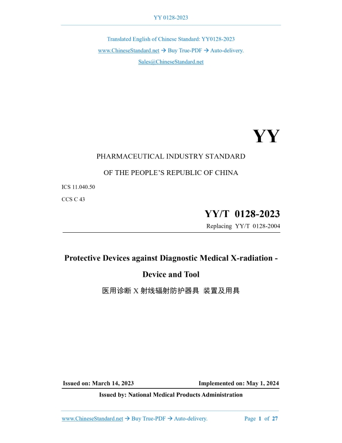 YY/T 0128-2023: Protective devices against diagnostic medical X-radiation - Device and tool Delivery: 9 seconds. True-PDF full-copy in English & invoice will be downloaded + auto-delivered via email. See step-by-step procedure Status: Valid YY/T 0128: Historical versions
