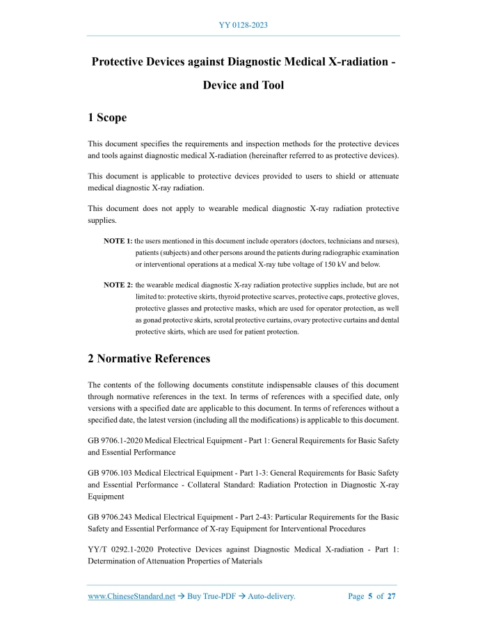 Similar standardsYY/T 0128-2023: Protective devices against diagnostic medical X-radiation - Device and tool---This is an excerpt. Full copy of true-PDF in English version (including equations, symbols, images, flow-chart, tables, and figures etc.), auto-downloaded/delivered in 9 seconds, can be purchased online: https://www.ChineseStandard.net/PDF.aspx/YYT0128-2023YY PHARMACEUTICAL INDUSTRY STANDARD ICS 11.040.50 CCS C 43 YY/T 0128-2023 Replacing YY/T 0128-2004 Protective Devices against Diagnostic Medical X-radiation - Device and Tool Issued on. MARCH 14, 2023 Implemented on. MAY 1, 2024 Issued by. National Medical Products Administration Table of ContentsForeword... 3 1 Scope... 5 2 Normative References... 5 3 Terms and Definitions... 6 4 Requirements... 7 5 Inspection Methods... 13 Appendix A (normative) Some Commonly Used Protective Devices and Basic Requirements... 18 Appendix B (informative) General Guidelines and Preparation Instructions... 23 Bibliography... 271 ScopeThis document specifies the requirements and inspection methods for the protective devices and tools against diagnostic medical X-radiation (hereinafter referred to as protective devices). This document is applicable to protective devices provided to users to shield or attenuate medical diagnostic X-ray radiation. This document does not apply to wearable medical diagnostic X-ray radiation protective supplies.2 Normative ReferencesThe contents of the following documents constitute indispensable clauses of this document through normative references in the text. In terms of references with a specified date, only versions with a specified date are applicable to this document. In terms of references without a specified date, the latest version (including all the modifications) is applicable to this document. GB 9706.1-2020 Medical Electrical Equipment - Part 1.General Requirements for Basic Safety and Essential Performance GB 9706.103 Medical Electrical Equipment - Part 1-3.General Requirements for Basic Safety and Essential Performance - Collateral Standard. Radiation Protection in Diagnostic X-ray Equipment GB 9706.243 Medical Electrical Equipment - Part 2-43.Particular Requirements for the Basic Safety and Essential Performance of X-ray Equipment for Interventional Procedures YY/T 0292.1-2020 Protective Devices against Diagnostic Medical X-radiation - Part 1. Determination of Attenuation Properties of Materials YY 9706.102 Medical Electrical Equipment - Part 1-2.General Requirements for Basic Safety and Essential Performance - Collateral Standard. Electromagnetic Compatibility - Requirements and Tests IEC/TR 60788 Medical Electrical Equipment - Glossary of Defined Terms3 Terms and DefinitionsThe terms and definitions defined in GB 9706.1-2020, GB 9706.103, GB 9706.243, YY/T 0292.1-2020 and IEC/TR 60788, and the following are applicable to this document. 3.1 x-ray attenuation material A uniformly distributed material mainly composed of one or more elements with an atomic number higher than 47. 3.2 lead attenuation material A uniformly distributed material mainly composed of lead element, and does not contain other elements with an atomic number higher than 47. 3.6 effective shielding area The area formed by the X-ray attenuation material with a lead equivalent value reaching a specified lead equivalent class. 3.7 protective shield A constituent unit of the protective device that is made of hard X-ray attenuation material and provides protection to the users. 3.8 protective curtain A constituent unit in protective device made of an inner layer of soft X-ray attenuation material and an outer layer of waterproof knitted fabric or other waterproof soft materials, which provides protection to the users. 3.12 table mounted type A description of the functional characteristic of a protective device capable of being fixed at the bedside where a fluoroscopy-guided interventional operation equipment performs by its own connector.4 Requirements4.1 Materials and Composition The key materials and main components constituting the protective device. 4.2 Structure and Basic Mechanical Functions The structure and basic mechanical functions of the protective device. 4.3 Protective Performance Indicators 4.3.1 Lead equivalent class The lead equivalent of the protective device shall be no less than its lead equivalent class. The lead equivalent class of the protective device. 4.4 Mobility and Stability of Movement 4.4.1 Mobile protective device When the mobile protective device moves under the condition of normal use, the external force required to move the mobile protective device on a hard and flat horizontal surface shall not be greater than 200 N, unless the instruction manual states that multiple people are required to push it. 4.5 Visible Light Transmittance At the light wavelength of 550 nm, the transmittance of the transparent part of the protective shield required for visual observation shall not be less than 80%. 4.6 Safety 4.6.1 Protection against mechanical hazards for passive protective devices 4.6.1.4 Protection against splash hazard For mobile or suspended protective devices, if the protective shield or part of the protective shield uses lead glass with an area greater than or equal to 0.24 m2, then, the lead glass shall be pasted with anti-splash film on both sides or use laminated lead glass. 4.6.2 Safety requirements for active protective devices 4.7 Appearance5 Inspection Methods5.1 Materials and Composition Conduct visual inspection of the protective device and check the bill of materials, which shall comply with the stipulations of 4.1. 5.2 Structure and Basic Mechanical Functions Conduct the inspection through visual inspection and / or by means of the following gauges or methods. 5.3 Protective Performance Indicators 5.3.1 Lead equivalent class 5.3.1.2 Test method Adopt the X-ray radiation beams that comply with the radiation mass specified in 5.3.1.1, under the configuration of wide beam conditions specified in 4.3 