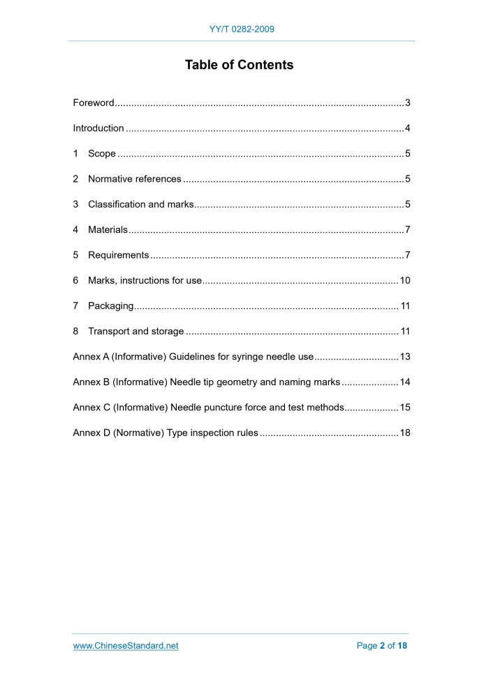YY/T 0282-2009: Syringe needle---This is an excerpt. Full copy of true-PDF in English version (including equations, symbols, images, flow-chart, tables, and figures etc.), auto-downloaded/delivered in 9 seconds, can be purchased online: https://www.ChineseStandard.net/PDF.aspx/YYT0282-2009YY PHARMACEUTICAL INDUSTRY STANDARD ICS 11.040.20 C 31 Replacing YY/T 0282-1995, YY 91019-1999, YY 91020-1999, YY/T 91140-1999 Syringe needle 注射针 Issued on: JUNE 16, 2009 Implemented on: OCTOBER 1, 2010 Issued by. China Food and Drug Administration Table of ContentsForeword... 3 Introduction... 4 1 Scope... 5 2 Normative references... 5 3 Classification and marks... 5 4 Materials... 7 5 Requirements... 7 6 Marks, instructions for use... 10 7 Packaging... 11 8 Transport and storage... 11 Annex A (Informative) Guidelines for syringe needle use... 13 Annex B (Informative) Needle tip geometry and naming marks... 14 Annex C (Informative) Needle puncture force and test methods... 15 Annex D (Normative) Type inspection rules... 18 Syringe needle1 ScopeThis Standard specifies the requirements for injection liquid, vaccine, anesthetic or intravenous infusion, blood transfusion needles with nominal diameters of 0.4mm ~ 1.6mm, used for human body subcutaneous, intradermal, muscle, oral and other parts.2 Normative referencesThe provisions in following documents become the provisions of this Standard through reference in this Standard. For dated references, the subsequent amendments (excluding corrigendum) or revisions do not apply to this Standard, however, parties who reach an agreement based on this Standard are encouraged to study if the latest versions of these documents are applicable. For undated references, the latest edition of the referenced document applies. GB/T 191, Packaging and storage marks GB/T 1962.1, Conical fittings with a 6% (Luer) taper for syringes, needles and certain other medical equipment - Part 1.General requirement GB/T 1962.2, Conical fittings with a 6% (Luer) taper for syringes, needles and certain other medical equipment - Part 2.Lock fittings GB/T 18457, Stainless steel needle tubing for the manufacture of medical devices3 Classification and marks3.1 Structure type The structure type and part name of syringe needle are shown in Figure 1. The specifications of syringe needle product are represented in nominal diameter of needle × needle tube length and wall type and edge angle. The needle tube sizes are in mm. Tube wall type. normal wall in RW, thin wall in TW Edge angle. long bevel angle in LB, short bevel angle in SB Marking example. A syringe needle with tube nominal outer diameter of 0.7 mm, tube length of 32 mm, short bevel angle, thin wall is marked as. 0.7 × 32 TW SB NOTE. When tube wall is normal and edge angle is long bevel angle, it shall not be marked.4 MaterialsThe materials used to make syringe needle shall meet the requirements in Clause 5.5 Requirements5.1 Needle seat 5.1.1 Needle seat conical connector shall be consistent with requirements of GB/T1962.1 or GB/T1962.2. 5.1.2 With normal or corrected vision observation, the outer surface of the needle seat shall be smooth; there shall be no cracks, defects; the coating shall not fall off; the mark shall be clear. 5.2 Needle tube 5.2.1 Rigidity When testing according to the method specified in GB/T 18457, the needle deflection value shall not exceed the provisions of Table 2. NOTE. Needle material can also be tested if necessary. d) volume (length × width × height); e) product registration certificate number, the implementation standard number; f) production lot number or production date; g) "fragile", "afraid of rain", "up" and other words or pictorial signs in line with the relevant provisions of GB/T 191. 6.2 Instructions for use There shall be at least the following information in the instructions for use. a) product name b) license number for medical device manufacturer, product registration certificate number and implementation standard number; c) scope of application, main structure and product performance; d) use methods, precautions; e) other instructions and necessary warning information; f) storage conditions.7 Packaging7.1 Small package materials and design shall ensure that the quality of built-in products is not compromised during normal storage and transport. 7.2 Each or several syringe needles shall be packed in a small package, with a certificate and instructions for use. NOTE. If medium-size packaging is used, the instructions for use shall be put into the package.8 Transport and storage8.1 Transport Syringe needle in the transport shall prevent heavy pressure, direct sunlight and rain and snow dip. 8.2 Storage b) pressure sensor measuring range. 0~50 N, accuracy of ± 0.5% (full scale). C.3 Simulated skin material The simulated skin material shall meet the following requirements. a) material. polyurethane film; b) thickness. 0.35mm ± 0.05mm; c) hardness. Shore A85 ± 10; d) exposed area. (after clamping) equal to Φ10 mm. C.4 Testing program The testing shall be carried out according to the following steps. a) place the testing needle and simulated skin at 22°C ± 2°C for at least 24 h and test at the same temperature; b) measure the device according to Figure C.1; clamp an appropriately dimensioned simulated skin c on the jig without any significant tensile or compressive forces on the simulated skin; c) install the testing needle on equipment a, its axis perpendicular to the plane of the simulated skin c and the tip pointing to the center of the circular puncture area; d) set the moving speed to 100 mm/min; e) start the testing device; f) during the puncture-on-membrane process, measure the maximum peak force. NOTE. Do not use punctured membranes that have been punctured in a circular puncture area. C.5 Conformity assessment When the maximum peak force measured is less than or equal to the value specified in Table C.1, the piercing force of the testing needle shall meet the requirements. 