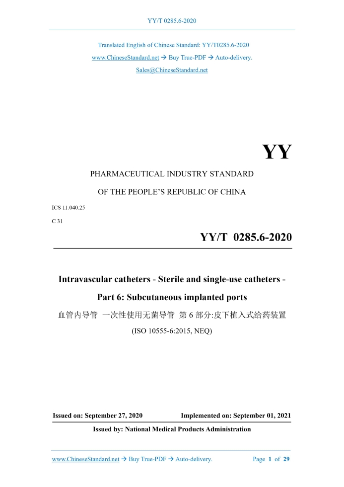 YY/T 0285.6-2020: Intravascular catheters - Sterile and single-use catheters - Part 6: Subcutaneous implanted ports Delivery: 9 seconds. True-PDF full-copy in English & invoice will be downloaded + auto-delivered via email. See step-by-step procedure Status: Valid