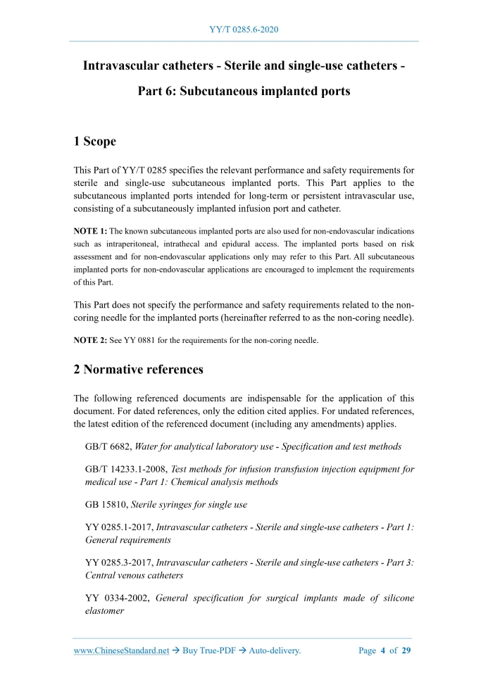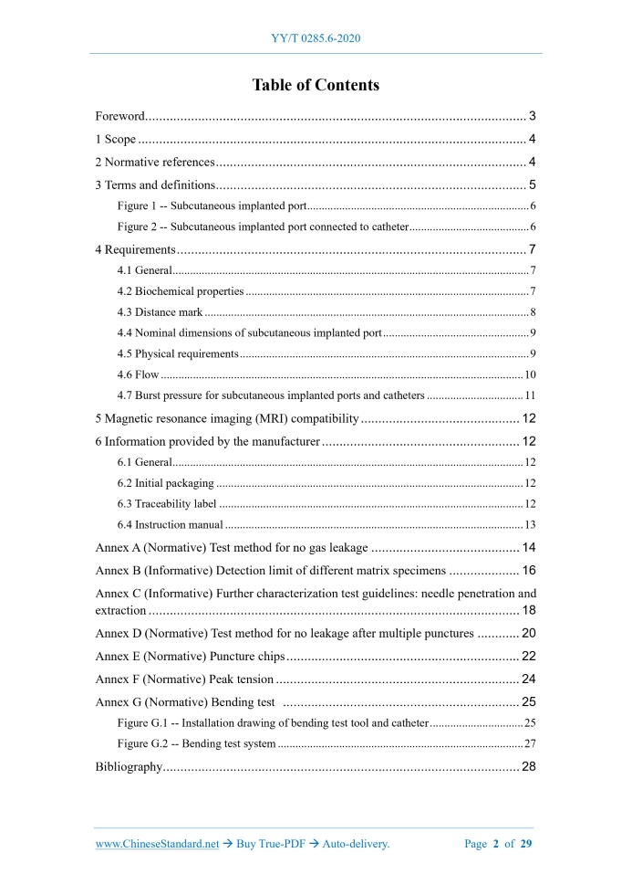 Similar standardsYY/T 0285.6-2020: Intravascular catheters - Sterile and single-use catheters - Part 6: Subcutaneous implanted ports---This is an excerpt. Full copy of true-PDF in English version (including equations, symbols, images, flow-chart, tables, and figures etc.), auto-downloaded/delivered in 9 seconds, can be purchased online: https://www.ChineseStandard.net/PDF.aspx/YYT0285.6-2020 PHARMACEUTICAL INDUSTRY STANDARD OF THE PEOPLE’S REPUBLIC OF CHINA ICS 11.040.25 C 31 Intravascular catheters - Sterile and single-use catheters - Part 6: Subcutaneous implanted ports (ISO 10555-6:2015, NEQ) ISSUED ON: SEPTEMBER 27, 2020 IMPLEMENTED ON: SEPTEMBER 01, 2021 Issued by: National Medical Products Administration Table of ContentsForeword ... 3 1 Scope ... 4 2 Normative references ... 4 3 Terms and definitions... 5 Figure 1 -- Subcutaneous implanted port ... 6 Figure 2 -- Subcutaneous implanted port connected to catheter ... 6 4 Requirements ... 7 4.1 General ... 7 4.2 Biochemical properties ... 7 4.3 Distance mark ... 8 4.4 Nominal dimensions of subcutaneous implanted port ... 9 4.5 Physical requirements ... 9 4.6 Flow ... 10 4.7 Burst pressure for subcutaneous implanted ports and catheters ... 11 5 Magnetic resonance imaging (MRI) compatibility ... 12 6 Information provided by the manufacturer ... 12 6.1 General ... 12 6.2 Initial packaging ... 12 6.3 Traceability label ... 12 6.4 Instruction manual ... 13 Annex A (Normative) Test method for no gas leakage ... 14 Annex B (Informative) Detection limit of different matrix specimens ... 16 Annex C (Informative) Further characterization test guidelines: needle penetration and extraction ... 18 Annex D (Normative) Test method for no leakage after multiple punctures ... 20 Annex E (Normative) Puncture chips ... 22 Annex F (Normative) Peak tension ... 24 Annex G (Normative) Bending test ... 25 Figure G.1 -- Installation drawing of bending test tool and catheter ... 25 Figure G.2 -- Bending test system ... 27 Bibliography... 28 Intravascular catheters - Sterile and single-use catheters - Part 6: Subcutaneous implanted ports1 ScopeThis Part of YY/T 0285 specifies the relevant performance and safety requirements for sterile and single-use subcutaneous implanted ports. This Part applies to the subcutaneous implanted ports intended for long-term or persistent intravascular use, consisting of a subcutaneously implanted infusion port and catheter. NOTE 1: The known subcutaneous implanted ports are also used for non-endovascular indications such as intraperitoneal, intrathecal and epidural access. The implanted ports based on risk assessment and for non-endovascular applications only may refer to this Part. All subcutaneous implanted ports for non-endovascular applications are encouraged to implement the requirements of this Part. This Part does not specify the performance and safety requirements related to the non- coring needle for the implanted ports (hereinafter referred to as the non-coring needle). NOTE 2: See YY 0881 for the requirements for the non-coring needle.2 Normative referencesThe following referenced documents are indispensable for the application of this document. For dated references, only the edition cited applies. For undated references, the latest edition of the referenced document (including any amendments) applies. GB/T 6682, Water for analytical laboratory use - Specification and test methods GB/T 14233.1-2008, Test methods for infusion transfusion injection equipment for medical use - Part 1: Chemical analysis methods GB 15810, Sterile syringes for single use YY 0285.1-2017, Intravascular catheters - Sterile and single-use catheters - Part 1: General requirements YY 0285.3-2017, Intravascular catheters - Sterile and single-use catheters - Part 3: Central venous catheters YY 0334-2002, General specification for surgical implants made of silicone elastomer Pharmacopoeia of the People's Republic of China, Edition 20153 Terms and definitionsFor the purposes of this document, the terms and definitions defined in YY 0285.1-2017 as well as the followings apply. 3.1 catheter single or multi-lumen tubing that allows its end to enter a point in the body 3.2 connection a system that connects the catheter to the subcutaneous implanted port 3.3 effective surface area the area that can be pierced by the needle 3.4 flushing volume the volume of the solution required to completely replace one solution with another in subcutaneous implanted ports and catheters 3.5 non-coring needle the needle that is not prone to chipping when puncturing the septum NOTE: Chips are debris that can be created when the needle pierces the septum. 3.6 outlet tube a cannula connected to a catheter at the port outlet 3.7 priming volume the total volume of space that subcutaneous implanted ports and catheters can be filled with solution 3.8 priming volume of the subcutaneous implanted port the total volume of the subcutaneous implanted port that can be filled with the solution, wherein the space consists of the reservoir and the outlet tube 3.9 priming volume of the catheter the total volume of space in the effective length of catheter that can be filled with solution4 Requirements4.1 General Unless otherwise specified in this Part, subcutaneous implanted ports and catheters shall comply with the requirements of YY 0285.1-2017. 4.2 Biochemical properties 4.2.1 Biocompatibility 4.2.1.1 General The subcutaneous implanted port shall be free of biological hazards (source). NOTE 1: See GB/T 16886.1 for biological evaluation. NOTE 2: Prove that the implant material meets the corresponding standards (such as YY 0334, ISO 5832, YY/T 1557 and YY/T 0660) is helpful to support the biological evaluation requirements of GB/T 16886.1. 4.2.1.2 Bacterial endotoxin Inject no more than 10mL of water for bacterial endotoxin test from each set of subcutaneous implanted ports. Extract at (37±1)°C for (1±0.1)h. Carry out the test according to the bacterial endotoxin inspection method in