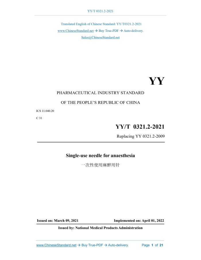 YY/T 0321.2-2021: Single-use needle for anaesthesia Delivery: 9 seconds. True-PDF full-copy in English & invoice will be downloaded + auto-delivered via email. See step-by-step procedure Status: Valid YY/T 0321.2: Historical versions