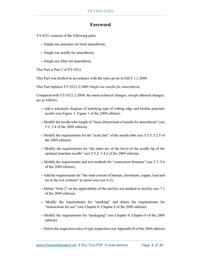 Similar standardsYY/T 0321.2-2021: Single-use needle for anaesthesia---This is an excerpt. Full copy of true-PDF in English version (including equations, symbols, images, flow-chart, tables, and figures etc.), auto-downloaded/delivered in 9 seconds, can be purchased online: https://www.ChineseStandard.net/PDF.aspx/YYT0321.2-2021YY PHARMACEUTICAL INDUSTRY STANDARD OF THE PEOPLE’S REPUBLIC OF CHINA ICS 11.040.20 C 31 Replacing YY 0321.2-2009 Single-use needle for anaesthesia ISSUED ON: MARCH 09, 2021 IMPLEMENTED ON: APRIL 01, 2022 Issued by: National Medical Products Administration Table of ContentsForeword ... 3 1 Scope ... 5 2 Normative references ... 5 3 Classification and labeling ... 6 4 Materials ... 9 5 Physical properties ... 9 6 Chemical properties ... 15 7 Biological properties ... 15 8 Marking ... 16 9 Packaging ... 17 10 Transportation and storage ... 17 Appendix A (Normative) Flow test method ... 18 Appendix B (Normative) Particle content test method ... 19 Appendix C (Normative) Preparation method of test solution for chemical properties ... 20 References ... 21ForewordYY 0321 consists of the following parts: -- Single-use puncture set local anaesthesia; -- Single-use needle for anaesthesia; -- Single-use filter for anaesthesia. This Part is Part 2 of YY 0321. This Part was drafted in accordance with the rules given in GB/T 1.1-2009. This Part replaces YY 0321.2-2009 Single-use needle for anaesthesia. Compared with YY 0321.2-2009, the main technical changes, except editorial changes, are as follows: -- Add a schematic diagram of matching type of cutting edge and lumbar puncture needle (see Figure 1; Figure 1 of the 2009 edition); -- Modify the needle tube length of “basic dimensions of needle for anaesthesia” (see 5.1; 3.4 of the 2009 edition); -- Modify the requirements for the “scale line” of the needle tube (see 5.3.5; 5.2.5 of the 2009 edition); -- Modify the requirements for “the inner arc of the bevel of the needle tip of the epidural puncture needle” (see 5.5.2; 5.4.2 of the 2009 edition); -- Modify the requirements and test methods for “connection firmness” (see 5.7; 5.6 of the 2009 edition); -- Add the requirements for “the total content of barium, chromium, copper, lead and tin in the test solution” in metal ions (see 6.2); -- Delete “Note 2” on the applicability of the sterility test method in sterility (see 7.1 of the 2009 edition); -- Modify the requirements for “marking” and delete the requirements for “instructions for use” (see Chapter 8; Chapter 8 of the 2009 edition); -- Modify the requirements for “packaging” (see Chapter 9; Chapter 9 of the 2009 edition); -- Delete the inspection rules of type inspection (see Appendix D of the 2009 edition). Please note that some of the contents of this document may involve patents. The issuing organization of this document is not responsible for identifying these patents. This Part was proposed by National Medical Products Administration. This Part shall be under the jurisdiction of National Technical Committee 95 on Injector for Medical Purpose of Standardization Administration of China (SAC/TC 95). Drafting organization of this Part: Zhejiang FERT Medical Device Co., Ltd., Shanghai SA Medical Technology Co., Ltd., Shanghai Medical Device Testing Institute, Jiangxi HONGDA Medical Equipment Group Ltd., Henan Tuoren Medical Device Co., Ltd., Kangdelai Zhejiang Medical Devices Co., Ltd., B.braun Medical (Shanghai) International Trading Co., Ltd. Chief drafting staffs of this Part: Su Weidong, Sun Hongrong, Hua Songhe, Xiong Rongrong, Liu Yanhong, Zhang Qian, Zhang Yan. The previous versions of the standard – which are replaced by this Part – are: -- YY 0321.2-2000, YY 0321.2-2009. Single-use needle for anaesthesia1 ScopeThis Part of YY 0321 specifies the classification and labeling, materials, physical properties, chemical properties, biological properties, marking, packaging, transportation and storage of single-use needle for anaesthesia with a nominal outer diameter of 0.4 mm ~ 2.1 mm. This Part applies to single-use needle for anaesthesia for puncture and drug injection during human epidural nerve block (referred to as epidural anesthesia), subarachnoid space block (referred to as lumbar anesthesia), combined epidural and lumbar anesthesia, and local anesthesia of nerve block.2 Normative referencesThe following referenced documents are indispensable for the application of this document. For dated references, only the edition cited applies to this document. For undated references, the latest edition (including any amendment) applies to this document. GB/T 1962.1, Conical fittings with a 6% (Luer) taper for syringes, needles and certain other medical equipment - Part 1: General requirement GB/T 1962.2, Conical fittings with a 6% (Luer) taper for syringes, needles and certain other medical equipment - Part 2: Lock fittings GB/T 6682, Water for analytical laboratory use - Specification and test methods GB/T 14233.1-2008, Test methods for infusion, transfusion, injection equipment for medical use - Part 1: Chemical analysis methods GB/T 14233.2, Test methods for infusion, transfusion, injection equipment for medical use - Part 2: Biological test methods GB/T 16886.1, Biological evaluation of medical devices - Part 1: Evaluation and testing within a risk management process GB/T 18457, Stainless steel needle tubing for the manufacture of medical devices YY/T 0313, Medical polymer products - Requirement for package and information supplied by manufacturer YY/T 0466.1, Medical devices - Symbols to be used with medical device labels, labelling and information to be supplied - Part 1: General requirements3 Classification and labeling3.1 Classification Single-use needle for anaesthesia (hereinafter referred to as needle for anaesthesia) can be divided into the following categories: a) epidural puncture needle; b) lumbar puncture needle; c) combined anesthesia trocar; d) nerve block puncture