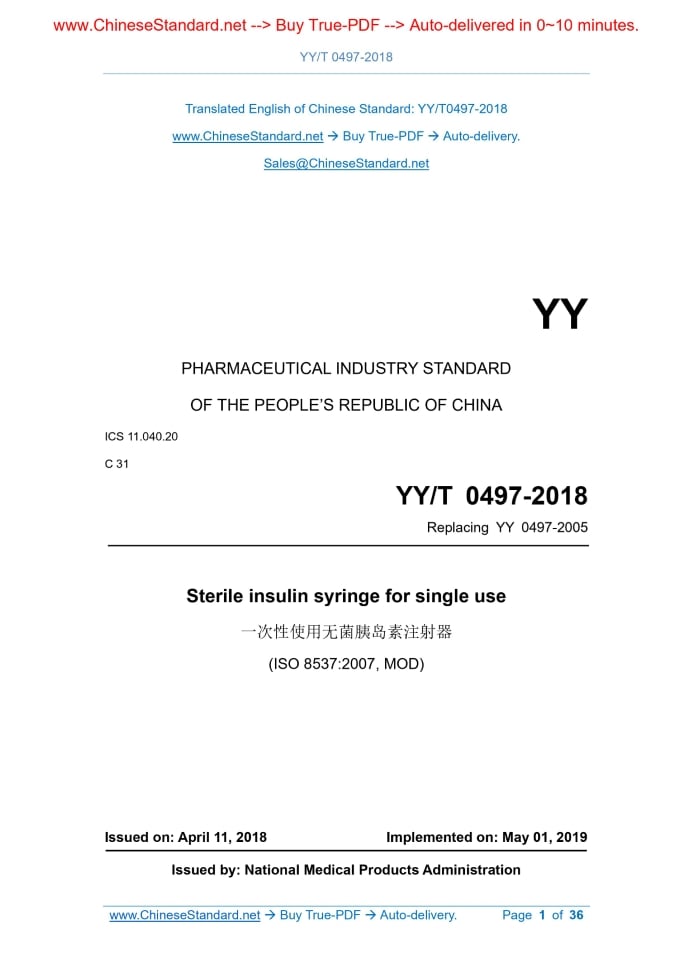 YY/T 0497-2018: Sterile insulin syringe for single use Delivery: 9 seconds. True-PDF full-copy in English & invoice will be downloaded + auto-delivered via email. See step-by-step procedure Status: Valid YY/T 0497: Historical versions