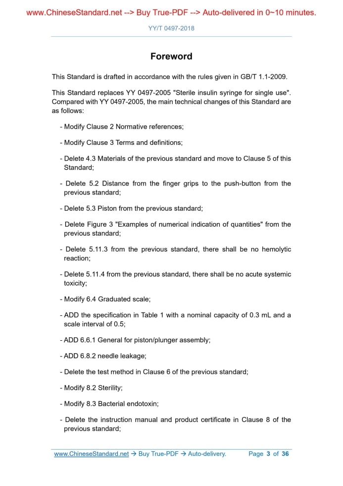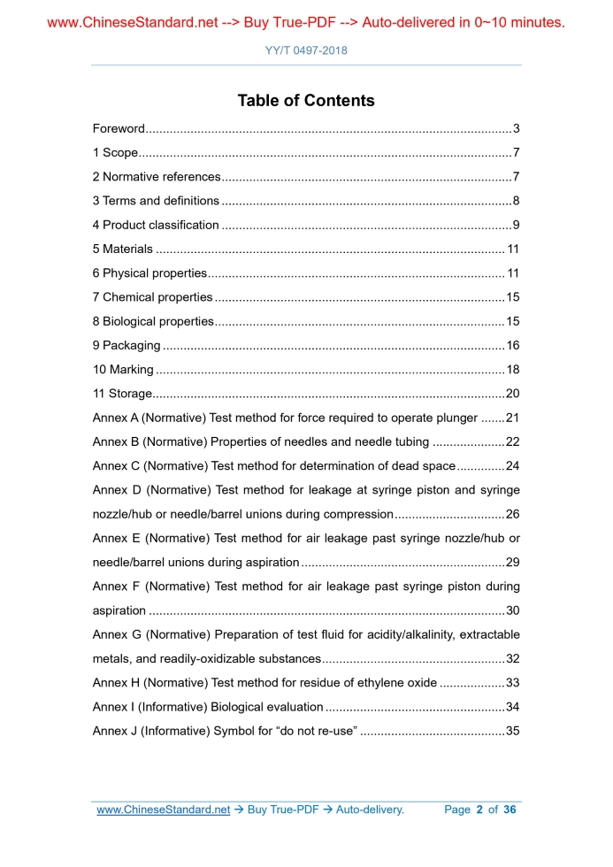 Similar standardsYY/T 0497-2018: Sterile insulin syringe for single use---This is an excerpt. Full copy of true-PDF in English version (including equations, symbols, images, flow-chart, tables, and figures etc.), auto-downloaded/delivered in 9 seconds, can be purchased online: https://www.ChineseStandard.net/PDF.aspx/YYT0497-2018YY PHARMACEUTICAL INDUSTRY STANDARD ICS 11.040.20 C 31 Replacing YY 0497-2005 Sterile insulin syringe for single use (ISO 8537.2007, MOD) Issued on. APRIL 11, 2018 Implemented on. MAY 01, 2019 Issued by. National Medical Products Administration Table of ContentsForeword... 3 1 Scope... 7 2 Normative references... 7 3 Terms and definitions... 8 4 Product classification... 9 5 Materials... 11 6 Physical properties... 11 7 Chemical properties... 15 8 Biological properties... 15 9 Packaging... 16 10 Marking... 18 11 Storage... 20 Annex A (Normative) Test method for force required to operate plunger... 21 Annex B (Normative) Properties of needles and needle tubing... 22 Annex C (Normative) Test method for determination of dead space... 24 Annex D (Normative) Test method for leakage at syringe piston and syringe nozzle/hub or needle/barrel unions during compression... 26 Annex E (Normative) Test method for air leakage past syringe nozzle/hub or needle/barrel unions during aspiration... 29 Annex F (Normative) Test method for air leakage past syringe piston during aspiration... 30 Annex G (Normative) Preparation of test fluid for acidity/alkalinity, extractable metals, and readily-oxidizable substances... 32 Annex H (Normative) Test method for residue of ethylene oxide... 33 Annex I (Informative) Biological evaluation... 34 Annex J (Informative) Symbol for “do not re-use”... 35ForewordThis Standard is drafted in accordance with the rules given in GB/T 1.1-2009. This Standard replaces YY 0497-2005 "Sterile insulin syringe for single use". Compared with YY 0497-2005, the main technical changes of this Standard are as follows. - Modify Clause 2 Normative references; - Modify Clause 3 Terms and definitions; - Delete 4.3 Materials of the previous standard and move to Clause 5 of this Standard; - Delete 5.2 Distance from the finger grips to the push-button from the previous standard; - Delete 5.3 Piston from the previous standard; - Delete Figure 3 "Examples of numerical indication of quantities" from the previous standard; - Delete 5.11.3 from the previous standard, there shall be no hemolytic reaction; - Delete 5.11.4 from the previous standard, there shall be no acute systemic toxicity; - Modify 6.4 Graduated scale; - ADD the specification in Table 1 with a nominal capacity of 0.3 mL and a scale interval of 0.5; - ADD 6.6.1 General for piston/plunger assembly; - ADD 6.8.2 needle leakage; - Delete the test method in Clause 6 of the previous standard; - Modify 8.2 Sterility; - Modify 8.3 Bacterial endotoxin; - Delete the instruction manual and product certificate in Clause 8 of the previous standard; - ADD the requirement in 9.1 that “Syringes of types 1, 3, 5 and 7 use the packaging material of one side of the dialysis paper and the other side of the plastic material”; - Delete "License number according to regulations", "Sterilization method, sterilization validity period, sterilization certificate" in Clause 8 of the previous standard; - Adjust Annex A in the previous standard into Annex B and modify it; - ADD Annex A "Test method for force required to operate plunger"; - Adjust Annex B in the previous standard into Annex G and modify the preparation method of readily-oxidizable substances; - Adjust Annex C in the previous standard into Annex D and modify it; - Delete Annex D of the previous standard; - Delete Annex E of the previous standard; - ADD Annex E "Test method for air leakage past syringe nozzle/hub or needle/barrel unions during aspiration"; - Adjust Annex F in the previous standard into Annex I and modify it; - ADD Annex F "Test method for air leakage past syringe piston during aspiration"; - Adjust Annex G in the previous standard into Annex J and modify it; - Delete Annex H of the previous standard; - ADD Annex H "Test method for residue of ethylene oxide". This Standard uses the redraft law to modify and adopt ISO 8537.2007 "Sterile single-use syringes, with or without needle, for insulin". The technical differences between this Standard and ISO 8537.2007 and their reasons are as follows. - As for the normative references, this Standard has made adjustments with technical differences, to adapt to the technical conditions of China. The adjustments are specifically reflected in Clause 2 “Normative references”. The specific adjustments are as follows. Replace ISO 9626 with GB/T 18457 which modifies and adopts the international standard (see 6.8.2); Replace ISO 594-1 with GB/T 1962.1 identical to the international standard (see 6.7.1); Replace ISO 7864 with GB 15811 not equivalent to the international standard (see 6.8.1 and 6.8.2); ADD reference to GB 15810 (see 6.4.1.2); ADD reference to GB/T 6682 (see 7.4); ADD reference to GB/T 14233.2 (see 8.2); ADD reference to GB 18278.1 (see 8.2); ADD reference to GB 18279.1 (see 8.2); ADD reference to GB 18280.1 (see 8.2); ADD reference to YY/T 0466.1 (10.3.4). - ADD "Clause 5 Materials", to regulate the requirements of materials; - ADD the requirement in 6.4.2 that for the 1.0 mL and 2.0 mL syringes, numbers can be marked at every 5 units of graduated capacity lines; - Modify the requirement of "content of extractable metals"; - ADD "7.3 Readily-oxidizable substances"; - ADD "7.4 Residue of ethylene oxide"; - ADD "Clause 8 Biological properties", to regulate the biological requirements of products; - ADD the requirement in 9.1 that “Syringes of types 1, 3, 5 and 7 use the packaging material of one side of the dialysis paper and the other side of the plastic material”; - Modify the packaging requirements; - Modify the marking requirements; - Modify Annex A of ISO 8537.2007 and move to Annex G of this Stan