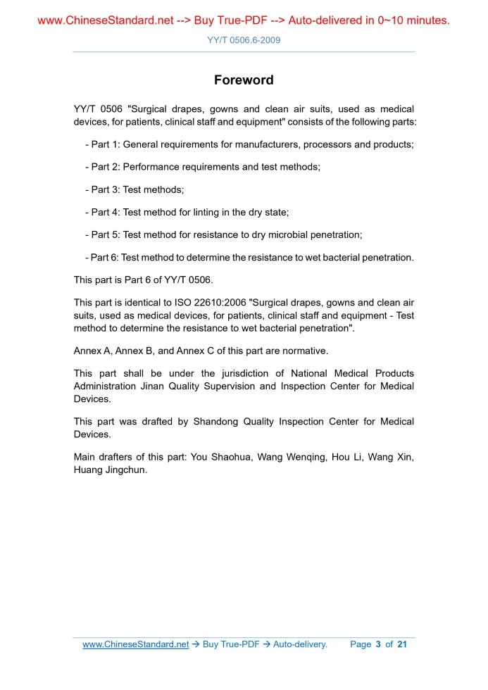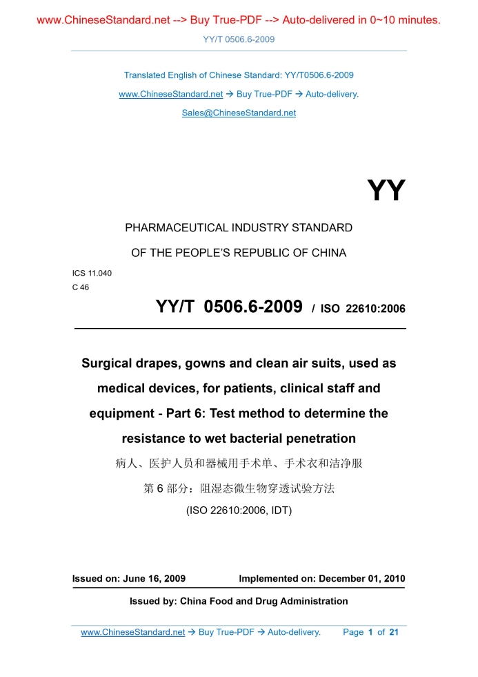 YY/T 0506.6-2009: Surigical drapes, gowns and clean air suits, used as medical devices, for patients, clinical staff and equipment. Part 6: Test method to determine the resistance to wet bacterial penetration Delivery: 9 seconds. True-PDF full-copy in English & invoice will be downloaded + auto-delivered via email. See step-by-step procedure Status: Valid