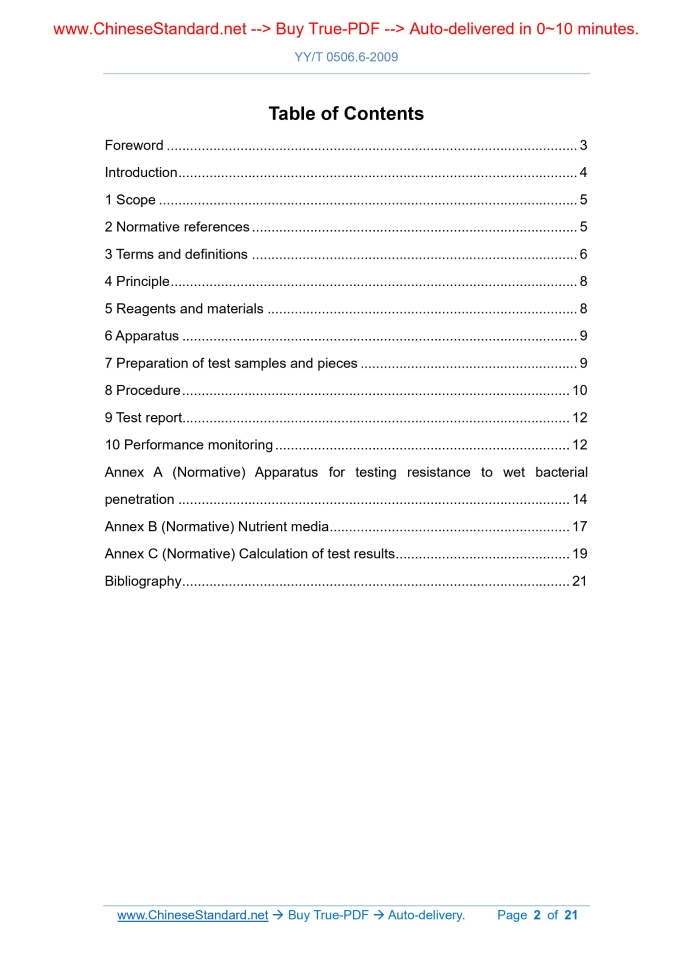 Similar standardsYY/T 0506.6-2009: Surigical drapes, gowns and clean air suits, used as medical devices, for patients, clinical staff and equipment. Part 6: Test method to determine the resistance to wet bacterial penetration---This is an excerpt. Full copy of true-PDF in English version (including equations, symbols, images, flow-chart, tables, and figures etc.), auto-downloaded/delivered in 9 seconds, can be purchased online: https://www.ChineseStandard.net/PDF.aspx/YYT0506.6-2009 Surigical drapes, gowns and clean air suits, used as medical devices, for patients, clinical staff and equipment. Part 6. Test method to determine the resistance to wet bacterial penetration ICS 11.040 C46 People's Republic of China Pharmaceutical Industry Standard YY/T 0506-6-2009/ISO 22610..2006 Surgical sheets for patients, medical staff and instruments, Surgical gowns and clean clothes Part 6. Test method for penetration of moisture-resistant microorganisms (ISO 22610..2006, IDT) 2009-06-16 released 2010--12-01 implementation Issued by the State Food and Drug Administration ForewordYY/T 0506 "Surgical sheets, surgical gowns and clean clothes for patients, medical staff and instruments" consists of the following parts. --- Part 1. General requirements for manufacturers, treatment plants and products; --- Part 2. Performance requirements and performance levels; --- Part 3. Test methods; --- Part 4. Dry flocculation test method; --- Part 5. Test method for blocking penetration of dry microorganisms; --- Part 6. Test method for penetration of moisture-resistant microorganisms. This part is the sixth part of YY/T 0506. This part is equivalent to ISO 22610..2006 "Surgical drapes, surgical gowns and clean clothes for patients, medical staff and instruments to block wet bacteria Penetration testing method ". Appendix A, Appendix B and Appendix C of this part are normative appendices. This part is under the jurisdiction of the Jinan Medical Device Quality Supervision and Inspection Center of the State Food and Drug Administration. This part was drafted by Shandong Medical Device Product Quality Inspection Center. The main drafters of this section. You Shaohua, Wang Wenqing, Hou Li, Wang Xin, Huang Jingchun. YY/T 0506-6-2009/ISO 22610..2006introductionThere are many examples showing that in the wet state, the liquid can carry bacteria to migrate to and pass through the barrier material. For example, skin flora The wet penetration of the cover material. The European Medical Device Guidelines clearly state that manufacturers are responsible for preventing device-related infectious diseases. Users recommend products that require coordinated and approved international test methods. The test methods described in this section use microbiological techniques and are therefore expected to be performed only in professional laboratories competent for such work. Note. Due to the complexity of this method, it is not suitable for routine quality control. YY/T 0506-6-2009/ISO 22610..2006 Surgical sheets for patients, medical staff and instruments, Surgical gowns and clean clothes Part 6. Test method for penetration of moisture-resistant microorganisms Warning. The use of this part of YY 0506 may involve hazardous materials, operations and equipment. This section does not cover all of the standard uses safe question. Before using this part, establish the corresponding safety and health operation specifications and determine the adaptability defined by the regulations is the user of this part Responsibility.1 ScopeThis part of YY/T 0506 specifies a test method and related test equipment (see Appendix A), which can be used to determine the material in the The ability to resist the penetration of bacteria in liquids during mechanical friction.2 Normative referencesThe clauses in the following documents become the clauses of this part by citing this part of YY/T 0506. For all cited documents with dates, All subsequent amendments (not including errata content) or revisions are not applicable to this section, however, agreement is encouraged based on this section The parties concerned study whether the latest versions of these documents are available. For the cited documents without date, the latest version applies to this section. GB/T 397.2. Tear performance of textile fabrics Part 2. Determination of tear strength of tongue-shaped specimens (GB/T 397.1- 2009, ISO 13937-2..2000, IDT) GB/T 39233.1 Tensile properties of textile fabrics Part 1. Determination of breaking strength and breaking elongation strip method (GB/T 3923.1-197, neq, ISO 13934-1..1994) GB 6529 Standard atmosphere for humidity control and testing of textiles (GB/T 6529-2008, ISO 139..2005, MOD) GB/T 8629 Home washing and drying procedures for textile testing (GB/T 8269-2001, eqv ISO 6330..2000) GB 18278 Sterilization confirmation and routine control of medical and health care products require industrial wet heat sterilization (GB 18278-2000, idt (ISO 11134..1994) GB/T 19633 Packaging for terminally sterilized medical devices (GB/T 1963-2005, ISO 11607..1997, IDT) YY/T 0287 is used in medical device quality management system for regulatory requirements (Y/T 0287-2003, ISO 13485..2003, IDT) GB/T 20367 Sterilization of medical and health care products Confirmation and routine control requirements of humid heat sterilization in medical and health care institutions (GB/T 20367-2006, ISO 13683..1997, IDT) ISO 15797 Textiles, Industrial Cleaning and Cleaning Procedures for Textile Workwear Testing3 Terms and definitionsThe following terms and definitions apply to this part of YY/T 0506. 3.1 Petri dish containing sterile nutrient agar medium. Note. See Appendix B for the composition of the nutrient medium. 3.2 The material used to prepare the fungus slices. YY/T 0506-6-2009/ISO 22610..2006 3.3 Materials used to cover patients, instruments, or specific surfaces, such as surgical drapes, to prevent fine skin bacteria and/or other non-sterile The bacteria reached the surgical wo