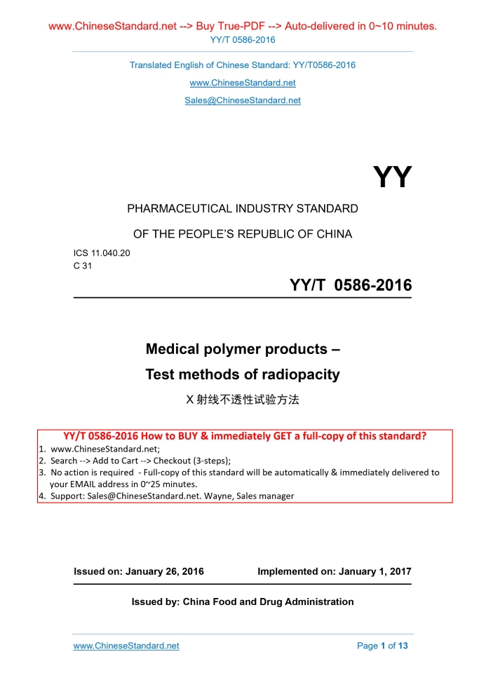 YY/T 0586-2016: Medical polymer products - Test methods of radiopacity Delivery: 9 seconds. True-PDF full-copy in English & invoice will be downloaded + auto-delivered via email. See step-by-step procedure Status: Valid YY/T 0586: Historical versions