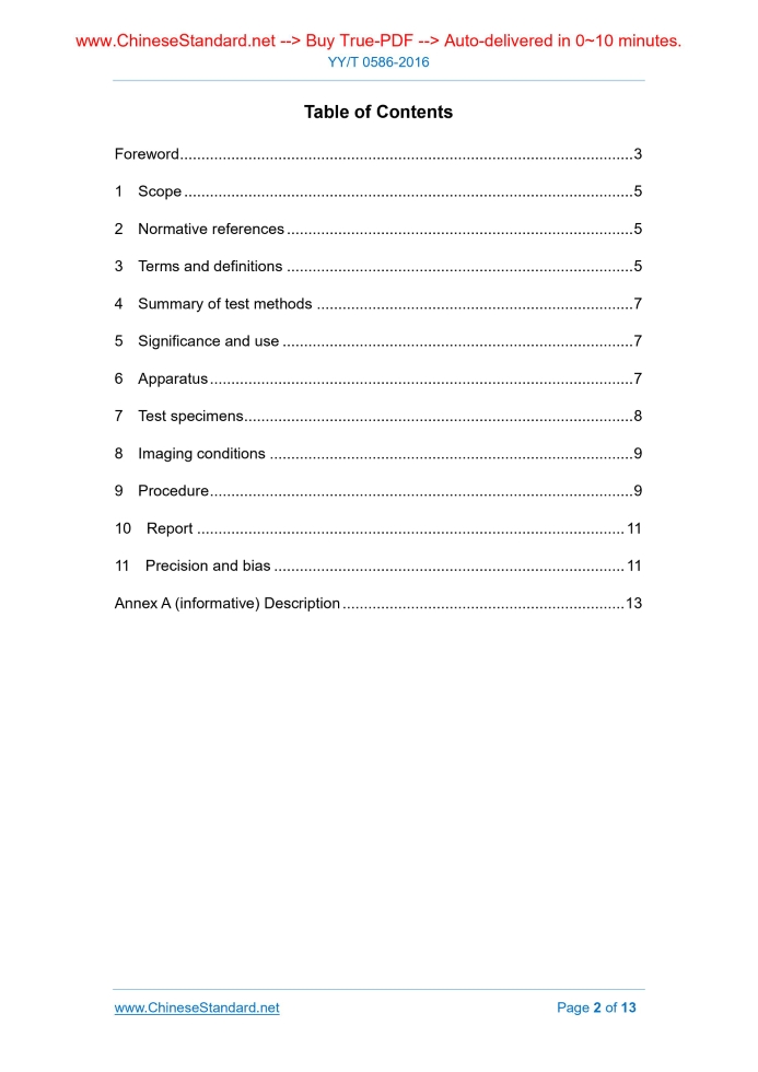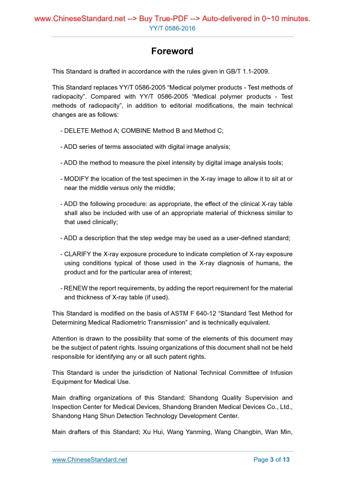 Similar standardsYY/T 0586-2016: Medical polymer products - Test methods of radiopacity---This is an excerpt. Full copy of true-PDF in English version (including equations, symbols, images, flow-chart, tables, and figures etc.), auto-downloaded/delivered in 9 seconds, can be purchased online: https://www.ChineseStandard.net/PDF.aspx/YYT0586-2016YY PHARMACEUTICAL INDUSTRY STANDARD ICS 11.040.20 C 31 Medical polymer products – Test methods of radiopacity Issued on. JANUARY 26, 2016 Implemented on. JANUARY 1, 2017 Issued by. China Food and Drug Administration Table of ContentsForeword... 3 1 Scope... 5 2 Normative references... 5 3 Terms and definitions... 5 4 Summary of test methods... 7 5 Significance and use... 7 6 Apparatus... 7 7 Test specimens... 8 8 Imaging conditions... 9 9 Procedure... 9 10 Report... 11 11 Precision and bias... 11 Annex A (informative) Description... 13ForewordThis Standard is drafted in accordance with the rules given in GB/T 1.1-2009. This Standard replaces YY/T 0586-2005 “Medical polymer products - Test methods of radiopacity”. Compared with YY/T 0586-2005 “Medical polymer products - Test methods of radiopacity”, in addition to editorial modifications, the main technical changes are as follows. - DELETE Method A; COMBINE Method B and Method C; - ADD series of terms associated with digital image analysis; - ADD the method to measure the pixel intensity by digital image analysis tools; - MODIFY the location of the test specimen in the X-ray image to allow it to sit at or near the middle versus only the middle; - ADD the following procedure. as appropriate, the effect of the clinical X-ray table shall also be included with use of an appropriate material of thickness similar to that used clinically; - ADD a description that the step wedge may be used as a user-defined standard; - CLARIFY the X-ray exposure procedure to indicate completion of X-ray exposure using conditions typical of those used in the X-ray diagnosis of humans, the product and for the particular area of interest; - RENEW the report requirements, by adding the report requirement for the material and thickness of X-ray table (if used). This Standard is modified on the basis of ASTM F 640-12 “Standard Test Method for Determining Medical Radiometric Transmission” and is technically equivalent. Attention is drawn to the possibility that some of the elements of this document may be the subject of patent rights. Issuing organizations of this document shall not be held responsible for identifying any or all such patent rights. This Standard is under the jurisdiction of National Technical Committee of Infusion Equipment for Medical Use. Main drafting organizations of this Standard. Shandong Quality Supervision and Inspection Center for Medical Devices, Shandong Branden Medical Devices Co., Ltd., Shandong Hang Shun Detection Technology Development Center. Main drafters of this Standard; Xu Hui, Wang Yanming, Wang Changbin, Wan Min, Zhang Haijun. The previous version of the standard replaced by this Standard is as follows. - YY/T 0586-2005. Medical polymer products – Test methods of radiopacity1 ScopeThe test methods in this Standard cover the determination of the radiopacity of materials and products utilizing X-ray based techniques, including fluoroscopy, angiography, CT (computed tomography) and DEXA (dual energy X-ray absorptiometry), also known as DXA. The results of these measurements are an indication of the likelihood of locating the product within the human body. Radiopacity is determined by qualitatively comparing image(s) of a test specimen and a user-defined standard, with or without the use of a body mimic, or quantitatively determining the specific difference in optical density or pixel intensity between the image of a test specimen and the image of a user-defined standard, with or without the use of a body mimic. NOTE. As a method standard, this Standard does not specify the acceptance criteria for X-ray detectability, but for ease of use, Annex A recommends the acceptance criteria.2 Normative referencesThe following documents are indispensable for the application of this document. For dated references, only the dated edition applies to this document. For undated references, the latest edition (including all amendments) applies to this document. GB 3880.1-2006 Wrought aluminium and aluminium alloy plates, sheets and strips for general engineering - Part 1.Technical conditions of delivery3 Terms and definitionsThe following terms and definitions apply to this document. 3.1 body mimic A piece of material, a phantom, a cadaver or an animal utilized to mimic the appropriate X-ray attenuation through a particular part of the human body. 3.3 grayscale range The number of levels in pixel intensity resolved in the digital image. NOTE. This is normally 256 levels in an 8-bit grayscale image. 3.4 optical density The range of values of optical density as measured by a densitometer; in this test method, the expected range is 0.50 to 1.50. 3.5 optical density difference The difference in optical density units between two regions or objects in an image, reported to at least two digits to the right of the decimal point. 3.6 pixel intensity The grayscale level of a pixel between 0 and 255, as determined by the digital analysis program.4 Summary of test methodsThe test specimen is placed so it sits at or near the middle of the X-ray image area in the X-ray imaging system. X-ray images are made at specified voltages, times, and currents that are typical of those used in the X-ray diagnosis of humans5 Significance and use5.1 These methods are intended to determine whether a polymer product (a material, product, or part of a product) has the degree of radiopacity desired for its application as a medical device in the human body. 5.2 These methods allow for both qualitative and quantitative evaluation in different comparative situations.6 Apparatus6.1 X-ray imaging system 6.2 X-ray film or digital im