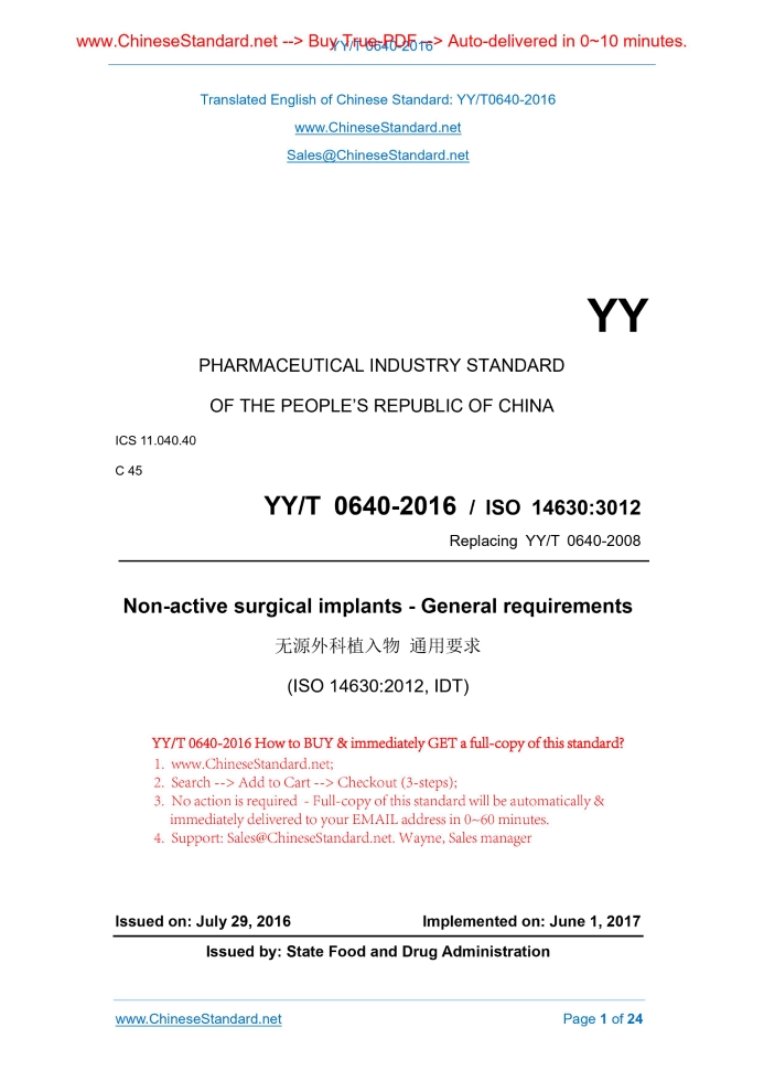 YY/T 0640-2016: Non-active surgical implants--General requirements Delivery: 9 seconds. True-PDF full-copy in English & invoice will be downloaded + auto-delivered via email. See step-by-step procedure Status: Valid YY/T 0640: Historical versions