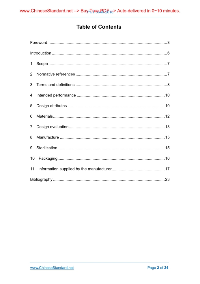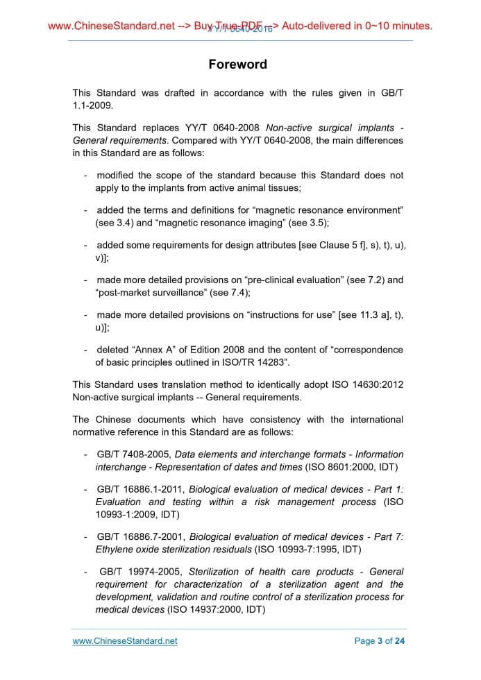Similar standardsYY/T 0640-2016: Non-active surgical implants--General requirements---This is an excerpt. Full copy of true-PDF in English version (including equations, symbols, images, flow-chart, tables, and figures etc.), auto-downloaded/delivered in 9 seconds, can be purchased online: https://www.ChineseStandard.net/PDF.aspx/YYT0640-2016YY PHARMACEUTICAL INDUSTRY STANDARD OF THE PEOPLE’S REPUBLIC OF CHINA ICS 11.040.40 C 45 YY/T 0640-2016 / ISO 14630:3012 Replacing YY/T 0640-2008 Non-active surgical implants - General requirements (ISO 14630:2012, IDT) ISSUED ON: JULY 29, 2016 IMPLEMENTED ON: JUNE 1, 2017 Issued by: State Food and Drug Administration 3. No action is required - Full-copy of this standard will be automatically & immediately delivered to your EMAIL address in 0~60 minutes. Table of ContentsForeword ... 3 Introduction ... 6 1 Scope ... 7 2 Normative references ... 7 3 Terms and definitions ... 8 4 Intended performance ... 10 5 Design attributes ... 10 6 Materials ... 12 7 Design evaluation ... 13 8 Manufacture ... 15 9 Sterilization ... 15 10 Packaging ... 16 11 Information supplied by the manufacturer ... 17 Bibliography ... 23ForewordThis Standard was drafted in accordance with the rules given in GB/T 1.1-2009. This Standard replaces YY/T 0640-2008 Non-active surgical implants - General requirements. Compared with YY/T 0640-2008, the main differences in this Standard are as follows: - modified the scope of the standard because this Standard does not apply to the implants from active animal tissues; - added the terms and definitions for “magnetic resonance environment” (see 3.4) and “magnetic resonance imaging” (see 3.5); - added some requirements for design attributes [see Clause 5 f], s), t), u), v)]; - made more detailed provisions on “pre-clinical evaluation” (see 7.2) and “post-market surveillance” (see 7.4); - made more detailed provisions on “instructions for use” [see 11.3 a], t), u)]; - deleted “Annex A” of Edition 2008 and the content of “correspondence of basic principles outlined in ISO/TR 14283”. This Standard uses translation method to identically adopt ISO 14630:2012 Non-active surgical implants -- General requirements. The Chinese documents which have consistency with the international normative reference in this Standard are as follows: - GB/T 7408-2005, Data elements and interchange formats - Information interchange - Representation of dates and times (ISO 8601:2000, IDT) - GB/T 16886.1-2011, Biological evaluation of medical devices - Part 1: Evaluation and testing within a risk management process (ISO 10993-1:2009, IDT) - GB/T 16886.7-2001, Biological evaluation of medical devices - Part 7: Ethylene oxide sterilization residuals (ISO 10993-7:1995, IDT) - GB/T 19974-2005, Sterilization of health care products - General requirement for characterization of a sterilization agent and the development, validation and routine control of a sterilization process for medical devices (ISO 14937:2000, IDT) - YY/T 0297-1997, Clinical investigation of medical devices (ISO 14155:1996, IDT) - YY 0970-2013, Sterilization of single-use medical devices incorporating materials of animal origin - Validation and routine control of sterilization by liquid sterilants (ISO 14160:1998, IDT) - YY/T 0316-2008, Medical devices - Application of risk management to medical devices (ISO 14971:2007, IDT) - YY/T 0567.1-2013, Aseptic processing of health care products - Part 1: General requirements (ISO 13408-1:2008, IDT) - YY/T 0802-2010, Sterilization of medical devices - Information to be provided by the manufacturer for the processing of resterilizable medical devices (ISO 17664:2004, IDT) - YY/T 0771.1-2009, Medical devices utilizing animal tissues and their derivatives - Part 1: Application of risk management (ISO 22442-1:2007, IDT) - YY/T 0771.2-2009, Medical devices utilizing animal tissues and their derivatives Part 2: Controls on sourcing, collection and handling (ISO 22442-2:2007, IDT) - YY/T 0771.3-2009, Medical devices utilizing animal tissues and their derivatives - Part 1: Application of risk management (ISO 22442-3:2007, IDT) Attention is drawn to the possibility that some of the elements of this Standard may be the subject of patent rights. The issuing authority shall not be held responsible for identifying any or all such patent rights. This Standard was proposed by State Food and Drug Administration. This Standard shall be under the jurisdiction of National Technical Committee on Surgical Implants and Orthopedic Instruments of Standardization Administration of China (SAC/TC 110). The drafting organizations of this Standard: Tianjin Medical Device Quality Supervision and Inspection Center, State Food and Drug Administration Medical Device Technical Review Center. Main drafters of this Standard: Ma Chunbao, Li Jia, Li Libin, Qi Baofen, Liu Bin, Min Yue, Sun Jiayi. Version of standard substituted by this Standard is:IntroductionThis Standard provides a method of addressing the fundamental principles outlined in ISO/TR 14283 as they apply to non-active surgical implants. It also provides a method for demonstrating compliance with the relevant essential requirements as outlined in the general terms in Annex 1 of the European Council Directive 93/42/EEC of 14 June 1993 concerning medical devices as they apply to non-active surgical implants, hereafter referred to as implants. It might also help manufacturers comply with the requirements of other regulatory bodies. There are three levels of standards dealing with non-active surgical implants and related instrumentation. For the implants themselves, they are as follows, with level 1 being the highest. - Level 1: General requirements for non-active surgical implants. - Level 2: Particular requirements for families of non-active surgical implants. - Level 3: Specific requirements for types of non-active surgical implants. Level 1 standards, such as this Standard and Reference [4], contain requiremen