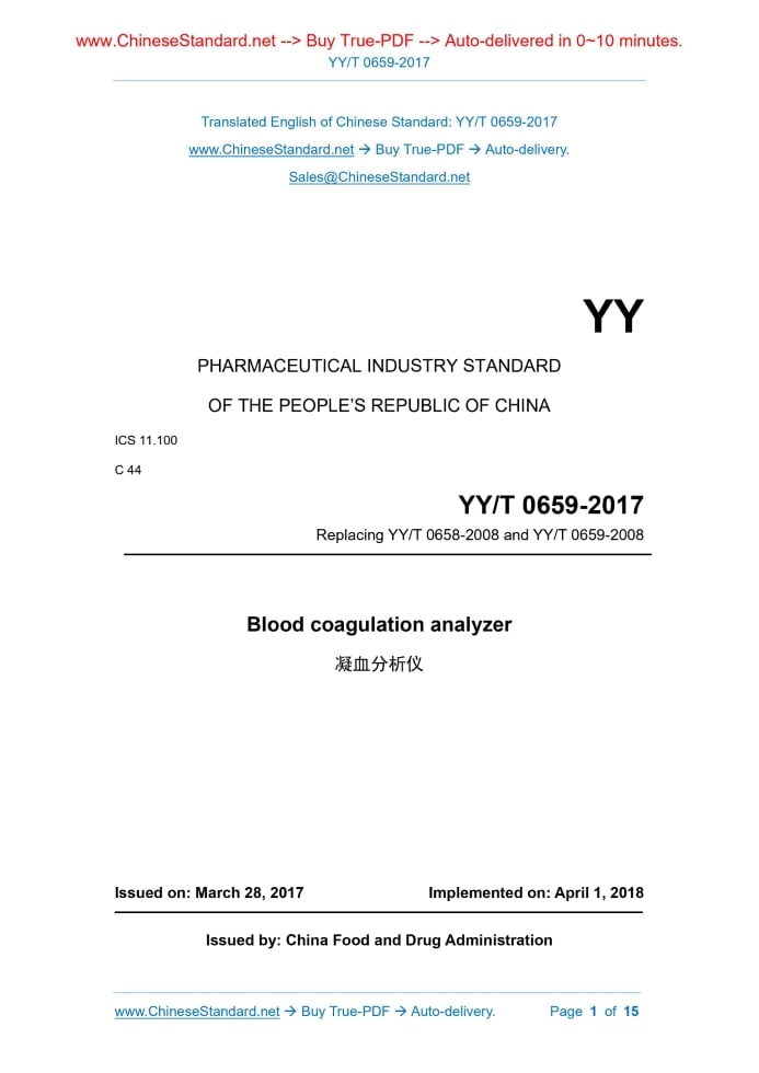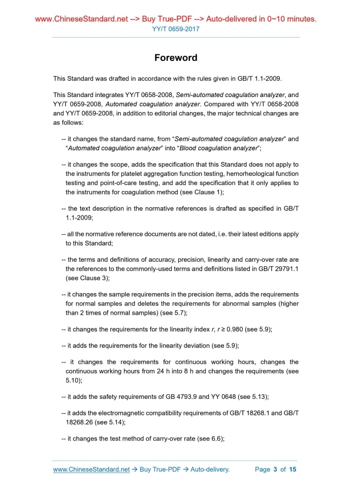 YY/T 0659-2017: Blood coagulation analyzer---This is an excerpt. Full copy of true-PDF in English version (including equations, symbols, images, flow-chart, tables, and figures etc.), auto-downloaded/delivered in 9 seconds, can be purchased online: https://www.ChineseStandard.net/PDF.aspx/YYT0659-2017YY PHARMACEUTICAL INDUSTRY STANDARD OF THE PEOPLE’S REPUBLIC OF CHINA ICS 11.100 C 44 Replacing YY/T 0658-2008 and YY/T 0659-2008 Blood coagulation analyzer Issued on: MARCH 28, 2017 Implemented on: APRIL 1, 2018 Issued by. China Food and Drug Administration Table of ContentsForeword ... 3 1 Scope ... 5 2 Normative references ... 5 3 Terms and definitions ... 6 4 Product classification ... 8 5 Technical requirements ... 8 6 Test methods ... 10 7 Labelling, marking and instructions for use ... 14 8 Packaging, transportation and storage ... 15ForewordThis Standard was drafted in accordance with the rules given in GB/T 1.1-2009. This Standard integrates YY/T 0658-2008, Semi-automated coagulation analyzer, and YY/T 0659-2008, Automated coagulation analyzer. Compared with YY/T 0658-2008 and YY/T 0659-2008, in addition to editorial changes, the major technical changes are as follows. -- it changes the standard name, from “Semi-automated coagulation analyzer” and “Automated coagulation analyzer” into “Blood coagulation analyzer”; -- it changes the scope, adds the specification that this Standard does not apply to the instruments for platelet aggregation function testing, hemorheological function testing and point-of-care testing, and add the specification that it only applies to the instruments for coagulation method (see Clause 1); -- the text description in the normative references is drafted as specified in GB/T 1.1-2009; -- all the normative reference documents are not dated, i.e. their latest editions apply to this Standard; -- the terms and definitions of accuracy, precision, linearity and carry-over rate are the references to the commonly-used terms and definitions listed in GB/T 29791.1 (see Clause 3); -- it changes the sample requirements in the precision items, adds the requirements for normal samples and deletes the requirements for abnormal samples (higher than 2 times of normal samples) (see 5.7); -- it changes the requirements for the linearity index r, r ≥ 0.980 (see 5.9); -- it adds the requirements for the linearity deviation (see 5.9); -- it changes the requirements for continuous working hours, changes the continuous working hours from 24 h into 8 h and changes the requirements (see 5.10); -- it adds the safety requirements of GB 4793.9 and YY 0648 (see 5.13); -- it adds the electromagnetic compatibility requirements of GB/T 18268.1 and GB/T 18268.26 (see 5.14); -- it changes the test method of carry-over rate (see 6.6); Blood coagulation analyzer1 ScopeThis Standard specifies the terms and definitions, product classification, technical requirements, testing methods, labelling, marking, instructions for use, packaging, transportation and storage for blood coagulation analyzers. This Standard applies to blood coagulation analyzers which are used clinically for the analysis of coagulation-anticoagulation and fibrinolysis-antifibrinolysis of patients’ blood. This Standard does not apply to the instruments for platelet aggregation function testing, hemorheological function testing and point-of-care testing.2 Normative referencesThe following referenced documents are indispensable for the application of this document. For dated references, only the edition dated applies to this document. For undated references, the latest edition of the referenced documents (including all amendments) applies to this document. GB/T 191, Packaging – Pictorial marking for handling of goods GB 4793.1, Safety requirements for electrical equipment for measurement, control, and laboratory use – Part 1. General requirements GB 4793.9, Safety requirements for electrical equipment for measurement, control and laboratory use – Part 9. Particular requirements for automatic and semi- automatic laboratory equipment for analysis and other purposes GB/T 14710, Environmental requirement and test methods for medical electrical equipment GB/T 18268.1, Electrical equipment for measurement, control and laboratory use – EMC requirements – Part 1. General requirements GB/T 18268.26, Electrical equipment for measurement, control and laboratory use – EMC requirements – Part 26. Particular requirements – In vitro diagnostic (IVD) medical equipment GB/T 29791.1, In vitro diagnostic medical devices – Information supplied by the manufacturer(labelling) – Part 1. Terms, definitions and general requirements4 Product classification4.1 Automation degree classification Semi-automated and full-automated. 4.2 Channel type classification (semi-automated) Single-channel, double-channel and multiple-channel.5 Technical requirements5.1 Preheating time Preheating time shall be less than 30 min. 5.2 Temperature control 5.2.1 The temperature of the reaction system in the testing part and the thermostat part at the incubation location shall be controlled at 37.0°C ± 1.0°C. 5.2.2 The temperature of the reagent cooling location shall not be higher than 20°C. 5.3 Testing items and reporting units The testing items shall at least include the determination of prothrombin time (PT), activated partial thromboplastin time (APTT), fibrinogen (FIB) and thrombin time (TT). PT, APTT and TT are reported in s. The determination result of PT shall also be reported using the international normalized ratio (INR). The reporting unit of FIB is g/L or mg/dL. The reporting unit of coagulation factor activity (for full-automated analyzers) is U/L or %. 5.4 Channel difference (applicable to semi-automated analyzers) The maximum difference between the results obtained from different channels is ≤ 10%. 5.5 Carry-over rate (applicable to full-automated analyzer) 5.5.1 The carry-over rate of sample concentration. the carry-over