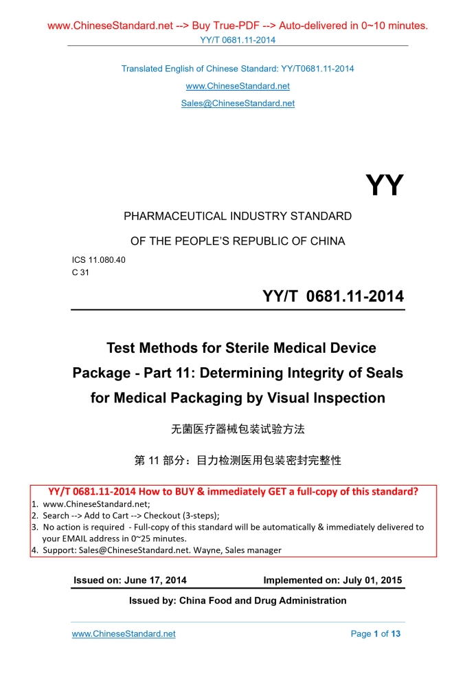 YY/T 0681.11-2014: Test methods for sterile medical device package. Part 11: Determining integrity of seals for medical packaging by visual inspection Delivery: 9 seconds. True-PDF full-copy in English & invoice will be downloaded + auto-delivered via email. See step-by-step procedure Status: Valid