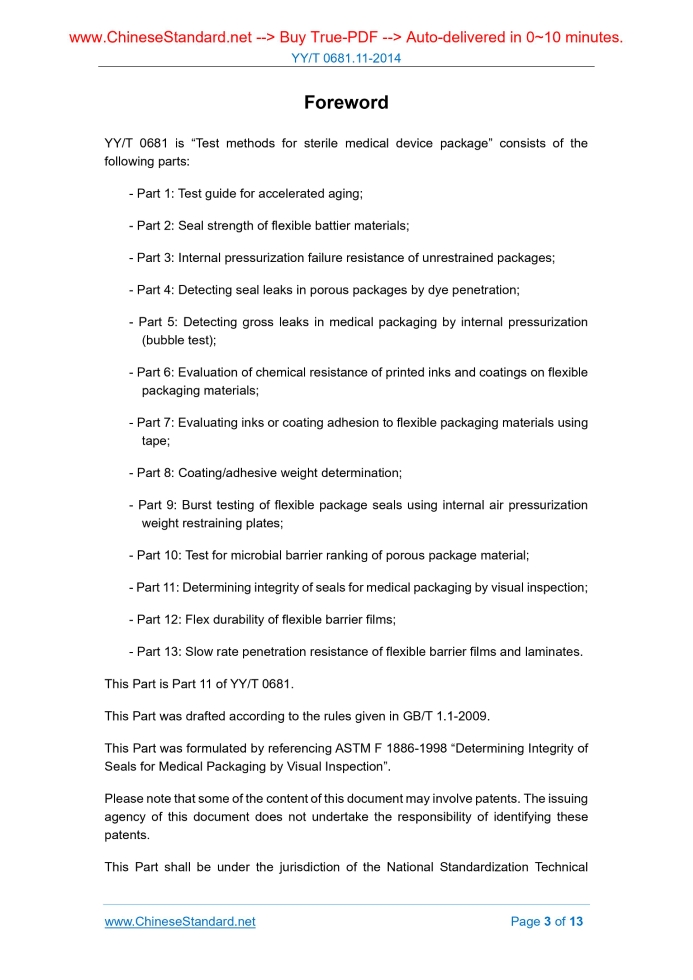 Similar standardsYY/T 0681.11-2014: Test methods for sterile medical device package. Part 11: Determining integrity of seals for medical packaging by visual inspection---This is an excerpt. Full copy of true-PDF in English version (including equations, symbols, images, flow-chart, tables, and figures etc.), auto-downloaded/delivered in 9 seconds, can be purchased online: https://www.ChineseStandard.net/PDF.aspx/YYT0681.11-2014 YY PHARMACEUTICAL INDUSTRY STANDARD OF THE PEOPLE’S REPUBLIC OF CHINA ICS 11.080.40 C 31 Test Methods for Sterile Medical Device Package - Part 11. Determining Integrity of Seals for Medical Packaging by Visual Inspection Issued on: JUNE 17, 2014 Implemented on: JULY 01, 2015 Issued by. China Food and Drug Administration Table of ContentsForeword ... 3 Introduction ... 5 1 Scope ... 6 2 Normative references ... 6 3 Terms and definitions ... 6 4 Summary of test method ... 7 5 Significance and use ... 7 6 Apparatus ... 7 7 Procedure ... 7 Appendix A ... 9 Appendix B ... 11 Bibliography ... 13ForewordYY/T 0681 is “Test methods for sterile medical device package” consists of the following parts. - Part 1. Test guide for accelerated aging; - Part 2. Seal strength of flexible battier materials; - Part 3. Internal pressurization failure resistance of unrestrained packages; - Part 4. Detecting seal leaks in porous packages by dye penetration; - Part 5. Detecting gross leaks in medical packaging by internal pressurization (bubble test); - Part 6. Evaluation of chemical resistance of printed inks and coatings on flexible packaging materials; - Part 7. Evaluating inks or coating adhesion to flexible packaging materials using tape; - Part 8. Coating/adhesive weight determination; - Part 9. Burst testing of flexible package seals using internal air pressurization weight restraining plates; - Part 10. Test for microbial barrier ranking of porous package material; - Part 11. Determining integrity of seals for medical packaging by visual inspection; - Part 12. Flex durability of flexible barrier films; - Part 13. Slow rate penetration resistance of flexible barrier films and laminates. This Part is Part 11 of YY/T 0681. This Part was drafted according to the rules given in GB/T 1.1-2009. This Part was formulated by referencing ASTM F 1886-1998 “Determining Integrity of Seals for Medical Packaging by Visual Inspection”. Please note that some of the content of this document may involve patents. The issuing agency of this document does not undertake the responsibility of identifying these patents. This Part shall be under the jurisdiction of the National Standardization Technical Test Methods for Sterile Medical Device Package - Part 11. Determining Integrity of Seals for Medical Packaging by Visual Inspection1 ScopeThe test method specified in this Part of YY/T 0681 covers the determination of channels in the package seal down to a width of 75 μm with a 60 % ~ 100 % probability (see Appendix B). This test method is applicable to flexible and rigid packages with at least one transparent side, so that the seal area may be clearly viewed.2 Normative referencesThe following documents are essential to the application of this document. For the dated documents, only the versions with the dates indicated are applicable to this document; for the undated documents, only the latest version (including all the amendments) are applicable to this document. ASTM F 17 Standard terminology relating to flexible barrier packaging3 Terms and definitionsThe following terms and definitions apply to this document. 3.1 Channel Any unimpaired pathway across the entire width of the intended seal. 3.2 Sterile package integrity Property of the package seal and material, which ensures that it presents a microbial Bibliography [1] ASTM E 691 Practical for Conducting an Interlaboratory Study to Determine the Precision of a Test Method ......Source: Above contents are excerpted from the full-copy PDF -- translated/reviewed by: www.ChineseStandard.net / Wayne Zheng et al. Tips & Frequently Asked Questions:Question 1: How long will the true-PDF of English version of YY/T 0681.11-2014 be delivered?Answer: The full copy PDF of English version of YY/T 0681.11-2014 can be downloaded in 9 seconds, and it will also be emailed to you in 9 seconds (double mechanisms to ensure the delivery reliably), with PDF-invoice.Question 2: Can I share the purchased PDF of YY/T 0681.11-2014_English with my colleagues?Answer: Yes. The purchased PDF of YY/T 0681.11-2014_English will be deemed to be sold to your employer/organization who actually paid for it, including your colleagues and your employer's intranet.Question 3: Does the price include tax/VAT?Answer: Yes. Our tax invoice, downloaded/delivered in 9 seconds, includes all tax/VAT and complies with 100+ countries' tax regulations (tax exempted in 100+ countries) -- See Avoidance of Double Taxation Agreements (DTAs): List of DTAs signed between Singapore and 100+ countriesQuestion 4: Do you accept my currency other than USD?Answer: Yes. www.ChineseStandard.us -- YY/T 0681.11-2014 -- Click this link and select your country/currency to pay, the exact amount in your currency will be printed on the invoice. Full PDF will also be downloaded/emailed in 9 seconds.How to buy and download a true PDF of English version of YY/T 0681.11-2014?A step-by-step guide to download PDF of YY/T 0681.11-2014_EnglishStep 1: Visit website https://www.ChineseStandard.net (Pay in USD), or https://www.ChineseStandard.us (Pay in any currencies such as Euro, KRW, JPY, AUD).Step 2: Search keyword "YY/T 0681.11-2014". Step 3: Click "Add to Cart". If multiple PDFs are required, repeat steps 2 and 3 to add up to 12 PDFs to cart. Step 4: Select payment option (Via payment agents Stripe or PayPal). Step 5: Customize Tax Invoice -- Fill up your email etc. Step 6: Click "Checkout". Step 7: Make payment by credit card, PayPal, Google Pay etc. After the payment is completed and in 9 seconds, you will receive 2