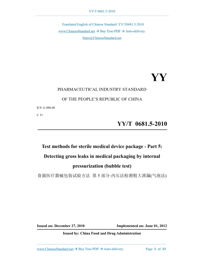 YY/T 0681.5-2010: Test methods for sterile medical device package. Part 5: Detecting gross leaks in medical packaging by internal pressurization (bubble test) Delivery: 9 seconds. True-PDF full-copy in English & invoice will be downloaded + auto-delivered via email. See step-by-step procedure Status: Valid