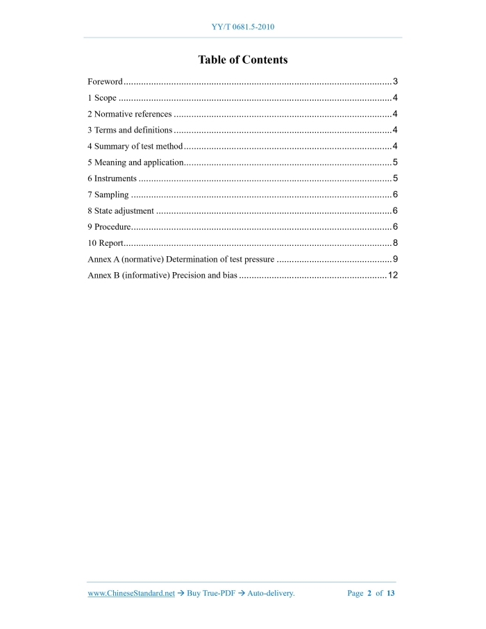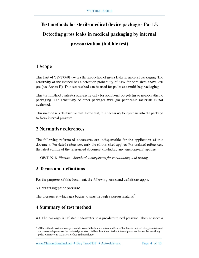 Similar standardsYY/T 0681.5-2010: Test methods for sterile medical device package. Part 5: Detecting gross leaks in medical packaging by internal pressurization (bubble test)---This is an excerpt. Full copy of true-PDF in English version (including equations, symbols, images, flow-chart, tables, and figures etc.), auto-downloaded/delivered in 9 seconds, can be purchased online: https://www.ChineseStandard.net/PDF.aspx/YYT0681.5-2010 YY PHARMACEUTICAL INDUSTRY STANDARD OF THE PEOPLE’S REPUBLIC OF CHINA ICS 11.080.40 C 31 Test methods for sterile medical device package - Part 5: Detecting gross leaks in medical packaging by internal pressurization (bubble test) ISSUED ON: DECEMBER 27, 2010 IMPLEMENTED ON: JUNE 01, 2012 Issued by: China Food and Drug Administration Table of ContentsForeword ... 3 1 Scope ... 4 2 Normative references ... 4 3 Terms and definitions ... 4 4 Summary of test method ... 4 5 Meaning and application ... 5 6 Instruments ... 5 7 Sampling ... 6 8 State adjustment ... 6 9 Procedure ... 6 10 Report ... 8 Annex A (normative) Determination of test pressure ... 9 Annex B (informative) Precision and bias ... 12 Test methods for sterile medical device package - Part 5: Detecting gross leaks in medical packaging by internal pressurization (bubble test)1 ScopeThis Part of YY/T 0681 covers the inspection of gross leaks in medical packaging. The sensitivity of the method has a detection probability of 81% for pore sizes above 250 μm (see Annex B). This test method can be used for pallet and multi-bag packaging. This test method evaluates sensitivity only for spunbond polyolefin or non-breathable packaging. The sensitivity of other packages with gas permeable materials is not evaluated. This method is a destructive test. In the test, it is necessary to inject air into the package to form internal pressure.2 Normative referencesThe following referenced documents are indispensable for the application of this document. For dated references, only the edition cited applies. For undated references, the latest edition of the referenced document (including any amendments) applies. GB/T 2918, Plastics - Standard atmospheres for conditioning and testing3 Terms and definitionsFor the purposes of this document, the following terms and definitions apply. 3.1 breathing point pressure The pressure at which gas begins to pass through a porous material2.4 Summary of test method4.1 The package is inflated underwater to a pre-determined pressure. Then observe a 2 All breathable materials are permeable to air. Whether a continuous flow of bubbles is emitted at a given internal air pressure depends on the material pore size. Bubble flow identified at internal pressures below the breathing point pressure can indicate a defect in the package. continuous stream of bubbles showing a broken package. 4.2 The sensitivity of this test method depends on the differential pressure and the method of pressurization. Determination of the test pressure for each packaging material and size is key to obtaining reproducible results (see Annex A for procedures for determining the test pressure). Improper pressurization of the packaging will significantly reduce the sensitivity of the test method. Increasing the differential pressure will increase the test sensitivity. But inflating to too high a pressure can cause the seal to crack or air bubbles to be ejected from the breathable material to be confused with defective air bubbles. This could lead to erroneous conclusions about the existence of defects. A pressure limiting valve can be used in the line with pressure monitoring device (this helps to stabilize the test pressure). It helps prevent excessive pressure on the package (see Figure 1). 4.3 Two different test methods are given for breathable and non-breathable materials. The main difference between the two methods (as described in Annex A) is that the soak-through times are given for breathable materials.5 Meaning and application5.1 This internal pressurization test method provides a test method for detecting gross leaks on a package that would render it non-sterile. Gross leaks on the packaging will not guarantee product sterility. This internal pressure test method provides a practical way to check for gross leaks on packaging. 5.2 This test method is useful for the inspection of unusual packaging materials and pack sizes in a laboratory environment. 5.3 This test method can be applied to very large or long packages. Such packages are not suitable for use with any other testing apparatus for testing package integrity. 5.4 This test method may be used as a means of evaluating package integrity. Since heat-sealed packaging is designed to provide a contamination-free and sterile environment for the product, packaging integrity is critical to consumer safety.6 Instruments6.1 Pressure-applying system (as shown in Figure 1): it has a pressure monitoring instrument and a pressure limiting valve, which can provide an air pressure of 0~5 kPa. 6.2 Package piercer (such as a small slotted screwdriver or other suitable device): so that the air source and pressure monitoring device can be inserted. 6.3 Water container: suitable for submerging the test sample for about 2.5 cm. sample. The perforation shall be located in the center of the package as much as possible. The hole size shall be able to allow insertion of the air source and pressure monitor and minimize air leakage. If necessary, seal the insertion site with tape and a rubber pad as an occluder at the perforation site. 9.1.2 Insert the air source and pressure monitor into the test sample. Submerge the package approximately 2.5 cm under water. Apply air to the package. NOTE 2: Using a limiter that keeps the package at the proper depth will facilitate testing. 9.1.3 Adjust gas and pressure limiting valves if necessary. Slowly inflate the package to a pressure greater than or equal to the minimum test pressure determined in accordance with Annex A. If necessary, ad