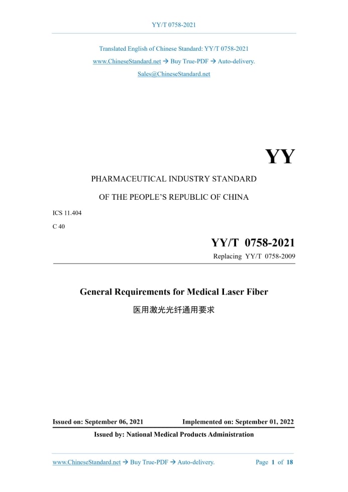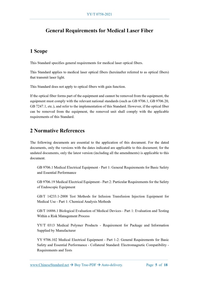 Similar standardsYY/T 0758-2021: General requirements for medical laser fiber---This is an excerpt. Full copy of true-PDF in English version (including equations, symbols, images, flow-chart, tables, and figures etc.), auto-downloaded/delivered in 9 seconds, can be purchased online: https://www.ChineseStandard.net/PDF.aspx/YYT0758-2021PHARMACEUTICAL INDUSTRY STANDARD OF THE PEOPLE’S REPUBLIC OF CHINA ICS 11.404 C 40 Replacing YY/T 0758-2009 General Requirements for Medical Laser Fiber ISSUED ON: SEPTEMBER 06, 2021 IMPLEMENTED ON: SEPTEMBER 01, 2022 Issued by: National Medical Products Administration Table of ContentsForeword ... 3 1 Scope ... 5 2 Normative References ... 5 3 Terms and Definitions ... 6 4 Structural Composition and Classification ... 6 5 Requirements ... 7 6 Test Methods ... 11 7 Packaging, Marking, Instructions, Transportation and Storage ... 18 General Requirements for Medical Laser Fiber1 ScopeThis Standard specifies general requirements for medical laser optical fibers. This Standard applies to medical laser optical fibers (hereinafter referred to as optical fibers) that transmit laser light. This Standard does not apply to optical fibers with gain function. If the optical fiber forms part of the equipment and cannot be removed from the equipment, the equipment must comply with the relevant national standards (such as GB 9706.1, GB 9706.20, GB 7247.1, etc.), and refer to the implementation of this Standard. However, if the optical fiber can be removed from the equipment, the removed unit shall comply with the applicable requirements of this Standard.2 Normative ReferencesThe following documents are essential to the application of this document. For the dated documents, only the versions with the dates indicated are applicable to this document; for the undated documents, only the latest version (including all the amendments) is applicable to this document. GB 9706.1 Medical Electrical Equipment - Part 1: General Requirements for Basic Safety and Essential Performance GB 9706.19 Medical Electrical Equipment - Part 2: Particular Requirements for the Safety of Endoscopic Equipment GB/T 14233.1-2008 Test Methods for Infusion Transfusion Injection Equipment for Medical Use - Part 1: Chemical Analysis Methods GB/T 16886.1 Biological Evaluation of Medical Devices - Part 1: Evaluation and Testing Within a Risk Management Process YY/T 0313 Medical Polymer Products - Requirement for Package and Information Supplied by Manufacturer YY 9706.102 Medical Electrical Equipment - Part 1-2: General Requirements for Basic Safety and Essential Performance - Collateral Standard: Electromagnetic Compatibility - Requirements and Tests ISO 11146 (all parts) Lasers and Laser-Related Equipment – Test Methods for Laser Beam Widths, Divergence Angles and Beam Propagation Ratios China Pharmacopeia 20203 Terms and DefinitionsFor the purposes of this Document, the following terms and definitions apply. 3.1 Medical laser fiber A product that uses optical fiber as the propagation medium to transmit laser energy. 3.2 Fiber applicator The applied parts that are directly formed by the end of the optical fiber cable. 3.3 Additional applicator Applied parts that are connected to the end of the optical fiber cable. NOTE: Such as handpieces, microcontrollers, etc. 3.5 Optical fiber cable The part of an optical fiber that is used to transmit laser light; it is generally composed of a core, a cladding, and a coating. NOTE: The coating layer includes buffer layer and protective layer. 3.5 Connector A component that connects an optical fiber to a laser device. 3.6 Tensile strength The maximum tensile force that the material can withstand.4 Structural Composition and Classification4.1 Structural composition Medical laser fiber is mainly composed of connector, fiber transmission body, application end and protective cap. 4.2 Product classification The manufacturer shall give the nominal value and tolerance of the core diameter (or diameter of fiber bundle), and the tolerance shall not exceed ±10%. If the fiber core diameter (or diameter of fiber bundle) at the input end and the output end of the fiber are inconsistent, the nominal value and tolerance shall be given respectively, and the tolerance should not exceed ±10%. 5.3 Optical properties 5.3.1 Maximum transmission power (or energy) of optical fiber The manufacturer shall give the nominal value of the maximum transmission power (or energy) of the optical fiber during the specified working time when the optical fiber transmits the specified wavelength; and the measured value shall be no less than the nominal value. 5.3.2 Divergence angle If the fiber applicator of the optical fiber is a flush-cut optical fiber, the manufacturer shall provide the nominal value (or range) and tolerance of the output divergence angle of the optical fiber terminal, and the tolerance shall not exceed ±20%. 5.3.3 Optical fiber transmission efficiency 5.3.3.1 When the optical fiber is placed straight, the transmission efficiency of the corresponding wavelength shall be no less than the value specified by the manufacturer. 5.3.3.2 The transmission efficiency of the reusable optical fiber can still reach the manufacturer's specified value after the insertion and removal test. 5.3.4 Disinfection and sterilization Disposable non-sterile optical fibers and reusable optical fibers are subjected to a disinfection and sterilization test according to the method specified in the instructions. After the test, the optical fiber transmission efficiency can still reach the manufacturer's specified value. 5.4 Mechanical properties 5.4.1 Tensile strength of optical fiber The tensile strength of the joint between the optical fiber cable and the connector, and the joint between the optical fiber cable and the applicator shall be no less than the specified value of the manufacturer. After the tensile test, the optical fiber shall be intact without damage. 5.4.2 Minimum bending working radius of op