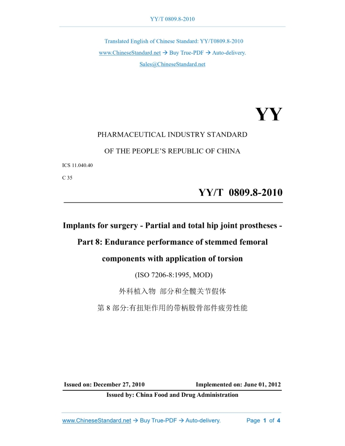 YY/T 0809.8-2010: Implants for surgery. Partial and total hip joint prostheses. Part 8: Endurance performance of stemmed femoral components with application of torsion Delivery: 9 seconds. True-PDF full-copy in English & invoice will be downloaded + auto-delivered via email. See step-by-step procedure Status: Obsolete