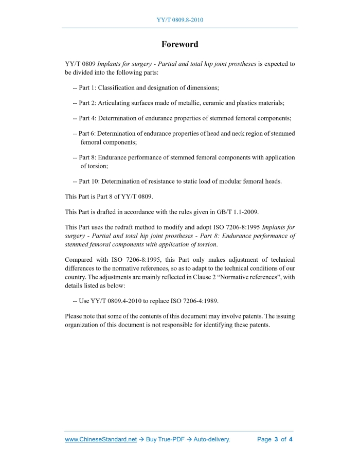 Similar standardsYY/T 0809.8-2010: Implants for surgery. Partial and total hip joint prostheses. Part 8: Endurance performance of stemmed femoral components with application of torsion---This is an excerpt. Full copy of true-PDF in English version (including equations, symbols, images, flow-chart, tables, and figures etc.), auto-downloaded/delivered in 9 seconds, can be purchased online: https://www.ChineseStandard.net/PDF.aspx/YYT0809.8-2010 YY PHARMACEUTICAL INDUSTRY STANDARD OF THE PEOPLE’S REPUBLIC OF CHINA ICS 11.040.40 C 35 Implants for surgery - Partial and total hip joint prostheses - Part 8: Endurance performance of stemmed femoral components with application of torsion (ISO 7206-8:1995, MOD) ISSUED ON: DECEMBER 27, 2010 IMPLEMENTED ON: JUNE 01, 2012 Issued by: China Food and Drug Administration Table of ContentsForeword ... 3 1 Scope ... 4 2 Normative references ... 4 3 Test conditions ... 4 4 Endurance performance ... 4ForewordYY/T 0809 Implants for surgery - Partial and total hip joint prostheses is expected to be divided into the following parts: -- Part 1: Classification and designation of dimensions; -- Part 2: Articulating surfaces made of metallic, ceramic and plastics materials; -- Part 4: Determination of endurance properties of stemmed femoral components; -- Part 6: Determination of endurance properties of head and neck region of stemmed femoral components; -- Part 8: Endurance performance of stemmed femoral components with application of torsion; -- Part 10: Determination of resistance to static load of modular femoral heads. This Part is Part 8 of YY/T 0809. This Part is drafted in accordance with the rules given in GB/T 1.1-2009. This Part uses the redraft method to modify and adopt ISO 7206-8:1995 Implants for surgery - Partial and total hip joint prostheses - Part 8: Endurance performance of stemmed femoral components with application of torsion. Compared with ISO 7206-8:1995, this Part only makes adjustment of technical differences to the normative references, so as to adapt to the technical conditions of our country. The adjustments are mainly reflected in Clause 2 “Normative references”, with details listed as below: -- Use YY/T 0809.4-2010 to replace ISO 7206-4:1989. Please note that some of the contents of this document may involve patents. The issuing organization of this document is not responsible for identifying these patents. Implants for surgery - Partial and total hip joint prostheses - Part 8: Endurance performance of stemmed femoral components with application of torsion1 ScopeThis Part of YY/T 0809 specifies the endurance performance of stemmed femoral components of partial and total hip joint prostheses under specified laboratory conditions by a method that includes the application of torsion. This Part does not apply to the following: a) prostheses for special clinical cases; b) prostheses for which the centerline of the stem is three-dimensionally curved and does not lie in any plane in which the axis of the neck lies.2 Normative referencesThe following referenced documents are indispensable for the application of this document. For dated references, only the edition cited applies. For undated references, the latest edition of the referenced document (including any amendments) applies. YY/T 0809.4-2010, Implants for surgery - Partial and total hip joint prostheses - Part 4: Determination of endurance properties of stemmed femoral components (ISO 7206-4:2002, MOD)3 Test conditionsThe femoral component shall be tested in its ready-for-use condition. ......Source: Above contents are excerpted from the full-copy PDF -- translated/reviewed by: www.ChineseStandard.net / Wayne Zheng et al. Tips & Frequently Asked Questions:Question 1: How long will the true-PDF of English version of YY/T 0809.8-2010 be delivered?Answer: The full copy PDF of English version of YY/T 0809.8-2010 can be downloaded in 9 seconds, and it will also be emailed to you in 9 seconds (double mechanisms to ensure the delivery reliably), with PDF-invoice.Question 2: Can I share the purchased PDF of YY/T 0809.8-2010_English with my colleagues?Answer: Yes. The purchased PDF of YY/T 0809.8-2010_English will be deemed to be sold to your employer/organization who actually paid for it, including your colleagues and your employer's intranet.Question 3: Does the price include tax/VAT?Answer: Yes. Our tax invoice, downloaded/delivered in 9 seconds, includes all tax/VAT and complies with 100+ countries' tax regulations (tax exempted in 100+ countries) -- See Avoidance of Double Taxation Agreements (DTAs): List of DTAs signed between Singapore and 100+ countriesQuestion 4: Do you accept my currency other than USD?Answer: Yes. www.ChineseStandard.us -- YY/T 0809.8-2010 -- Click this link and select your country/currency to pay, the exact amount in your currency will be printed on the invoice. Full PDF will also be downloaded/emailed in 9 seconds.How to buy and download a true PDF of English version of YY/T 0809.8-2010?A step-by-step guide to download PDF of YY/T 0809.8-2010_EnglishStep 1: Visit website https://www.ChineseStandard.net (Pay in USD), or https://www.ChineseStandard.us (Pay in any currencies such as Euro, KRW, JPY, AUD).Step 2: Search keyword "YY/T 0809.8-2010". Step 3: Click "Add to Cart". If multiple PDFs are required, repeat steps 2 and 3 to add up to 12 PDFs to cart. Step 4: Select payment option (Via payment agents Stripe or PayPal). Step 5: Customize Tax Invoice -- Fill up your email etc. Step 6: Click "Checkout". Step 7: Make payment by credit card, PayPal, Google Pay etc. After the payment is completed and in 9 seconds, you will receive 2 emails attached with the purchased PDFs and PDF-invoice, respectively. Step 8: Optional -- Go to download PDF. Step 9: Optional -- Click Open/Download PDF to download PDFs and invoice. See screenshots for above steps: Steps 1~3 Steps 4~6 Step 7 Step 8 Step 9 |
