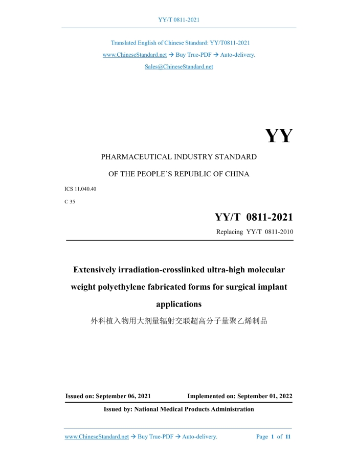 YY/T 0811-2021: Extensively irradiation-crosslinked ultra-high molecular weight polyethylene fabricated forms for surgical implant applications Delivery: 9 seconds. True-PDF full-copy in English & invoice will be downloaded + auto-delivered via email. See step-by-step procedure Status: Valid YY/T 0811: Historical versions
