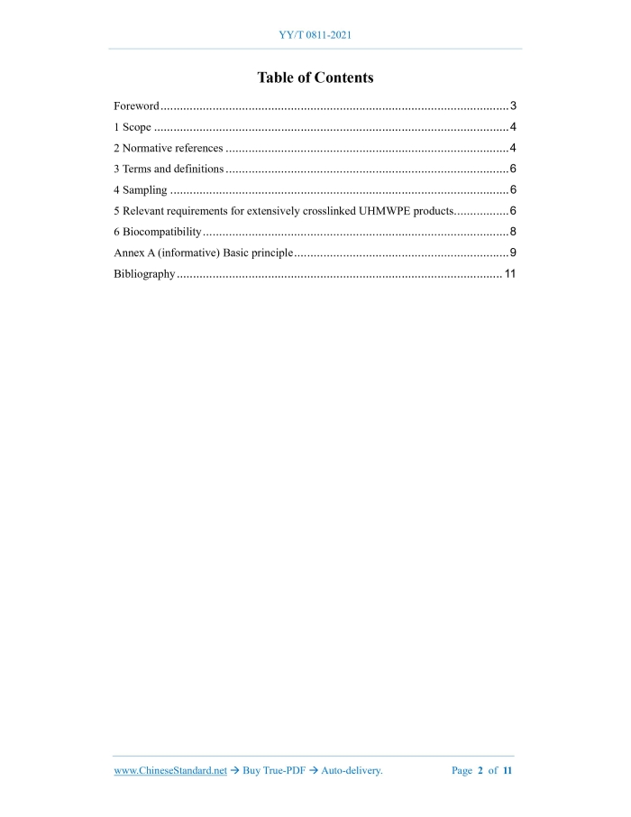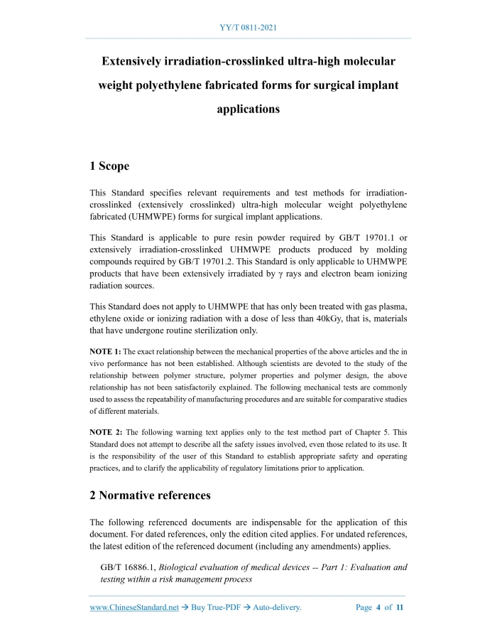 Similar standardsYY/T 0811-2021: Extensively irradiation-crosslinked ultra-high molecular weight polyethylene fabricated forms for surgical implant applications---This is an excerpt. Full copy of true-PDF in English version (including equations, symbols, images, flow-chart, tables, and figures etc.), auto-downloaded/delivered in 9 seconds, can be purchased online: https://www.ChineseStandard.net/PDF.aspx/YYT0811-2021 YY PHARMACEUTICAL INDUSTRY STANDARD ICS 11.040.40 C 35 Replacing YY/T 0811-2010 Extensively irradiation-crosslinked ultra-high molecular weight polyethylene fabricated forms for surgical implant applications Issued on. SEPTEMBER 06, 2021 Implemented on. SEPTEMBER 01, 2022 Issued by. National Medical Products Administration Table of ContentsForeword... 3 1 Scope... 4 2 Normative references... 4 3 Terms and definitions... 6 4 Sampling... 6 5 Relevant requirements for extensively crosslinked UHMWPE products... 6 6 Biocompatibility... 8 Annex A (informative) Basic principle... 9 Bibliography... 11ForewordThis Standard was drafted in accordance with the rules given in GB/T 1.1-2009. This Standard replaces YY/T 0811-2010 "Standard guide for extensively irradiation. Crosslinked ultra-high molecular weight polyethylene fabricated forms for surgical implant applications". Compared with YY/T 0811-2010, in addition to the editorial modifications, the main technical changes in this Standard are as follows. -- Add the requirements for modulus of elasticity (see Table 1 of this Edition); -- Modify the test methods for compressive modulus and thermal properties (see Table 1 of this Edition; Table 1 of Edition 2010); -- For small punching limit load, trans vinylidene index (TVI) test method, the ASTM standard is replaced by the converted industry standard (see Table 2 of this Edition; Table 1 of Edition 2010); -- Adjust the position of electron spin resonance in the standard (see 5.2.3 of this Edition; Table 1 of Edition 2010); -- Add the requirements for preclinical simulations (see 5.2.4 of this Edition). Attention is drawn to the possibility that some of the elements of this document may be the subject of patent rights. The issuing authority shall not be held responsible for identifying any or all such patent rights. This Standard was proposed by National Medical Products Administration. This Standard shall be under the jurisdiction of Subcommittee on Orthopedic Implants of National Technical Committee on Surgical Implants and Orthopedic Devices of Standardization Administration of China (SAC/TC 110/SC 1). The drafting organizations of this Standard. Tianjin Medical Device Quality Supervision and Inspection Center, Medical Device Technology Evaluation Center of the State Drug Administration, Kuajun Plastic Trading (Shanghai) Co., Ltd., Stryker (Beijing) Medical Devices Co., Ltd., Zimmer (Shanghai) Medical International Trade Co., Ltd. Main drafters of this Standard. Jing Ming, Liu Bin, Gao Jintao, Ma Chunbao, Zhu Jinqing, Yang Xiuyun, Zhang Haiming, Wang Yuhai. Version of standard substituted by this Standard is. -- YY/T 0811-2010. Extensively irradiation-crosslinked ultra-high molecular weight polyethylene fabricated forms for surgical implant applications1 ScopeThis Standard specifies relevant requirements and test methods for irradiation- crosslinked (extensively crosslinked) ultra-high molecular weight polyethylene fabricated (UHMWPE) forms for surgical implant applications. This Standard is applicable to pure resin powder required by GB/T 19701.1 or extensively irradiation-crosslinked UHMWPE products produced by molding compounds required by GB/T 19701.2.This Standard is only applicable to UHMWPE products that have been extensively irradiated by γ rays and electron beam ionizing radiation sources. This Standard does not apply to UHMWPE that has only been treated with gas plasma, ethylene oxide or ionizing radiation with a dose of less than 40kGy, that is, materials that have undergone routine sterilization only. NOTE 1.The exact relationship between the mechanical properties of the above articles and the in vivo performance has not been established. Although scientists are devoted to the study of the relationship between polymer structure, polymer properties and polymer design, the above relationship has not been satisfactorily explained. The following mechanical tests are commonly used to assess the repeatability of manufacturing procedures and are suitable for comparative studies of different materials. NOTE 2.The following warning text applies only to the test method part of Chapter 5.This Standard does not attempt to describe all the safety issues involved, even those related to its use. It is the responsibility of the user of this Standard to establish appropriate safety and operating practices, and to clarify the applicability of regulatory limitations prior to application.2 Normative referencesThe following referenced documents are indispensable for the application of this document. For dated references, only the edition cited applies. For undated references, the latest edition of the referenced document (including any amendments) applies. GB/T 16886.1, Biological evaluation of medical devices -- Part 1.Evaluation and testing within a risk management process GB/T 16886.2, Biological evaluation of medical devices -- Part 2.Animal welfare requirements GB/T 16886.3, Biological evaluation of medical devices -- Part 3.Tests for genotoxicity, carcinogenicity and reproductive toxicity GB/T 16886.4, Biological evaluation of medical devices -- Part 4.Selection of tests for interactions with blood GB/T 16886.5, Biological evaluation of medical devices -- Part 5.Tests for in vitro cytotoxicity GB/T 16886.6, Biological evaluation of medical devices -- Part 6.Tests for local effects after implantation GB/T 16886.7, Biological evaluation of medical devices -- Part 7.Ethylene oxide sterilization residuals GB/T 16886.9, Biological evaluation of medical devices -- Part 9.Framework for identi