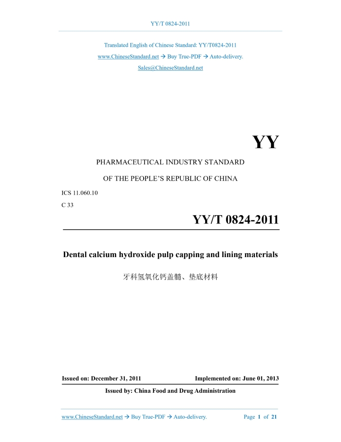 YY/T 0824-2011: Dental calcium hydroxide pulp capping and lining materials Delivery: 9 seconds. True-PDF full-copy in English & invoice will be downloaded + auto-delivered via email. See step-by-step procedure Status: Valid
