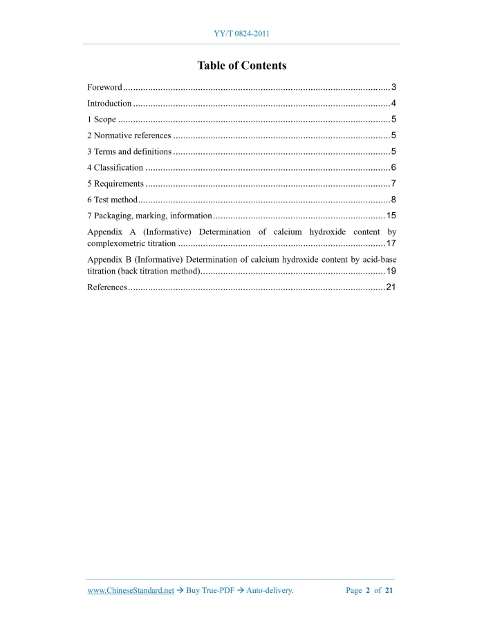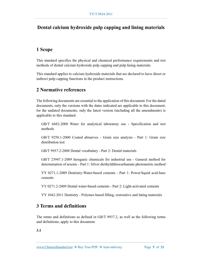 YY/T 0824-2011: Dental calcium hydroxide pulp capping and lining materials---This is an excerpt. Full copy of true-PDF in English version (including equations, symbols, images, flow-chart, tables, and figures etc.), auto-downloaded/delivered in 9 seconds, can be purchased online: https://www.ChineseStandard.net/PDF.aspx/YYT0824-2011YY PHARMACEUTICAL INDUSTRY STANDARD OF THE PEOPLE’S REPUBLIC OF CHINA ICS 11.060.10 C 33 Dental calcium hydroxide pulp capping and lining materials 牙科氢氧化钙盖髓, 垫底材料 ISSUED ON: DECEMBER 31, 2011 IMPLEMENTED ON: JUNE 01, 2013 Issued by: China Food and Drug Administration Table of ContentsForeword ... 3 Introduction ... 4 1 Scope ... 5 2 Normative references ... 5 3 Terms and definitions ... 5 4 Classification ... 6 5 Requirements ... 7 6 Test method ... 8 7 Packaging, marking, information ... 15 Appendix A (Informative) Determination of calcium hydroxide content by complexometric titration ... 17 Appendix B (Informative) Determination of calcium hydroxide content by acid-base titration (back titration method) ... 19 References ... 21 Dental calcium hydroxide pulp capping and lining materials1 ScopeThis standard specifies the physical and chemical performance requirements and test methods of dental calcium hydroxide pulp capping and pulp lining materials. This standard applies to calcium hydroxide materials that are declared to have direct or indirect pulp capping functions in the product instructions.2 Normative referencesThe following documents are essential to the application of this document. For the dated documents, only the versions with the dates indicated are applicable to this document; for the undated documents, only the latest version (including all the amendments) is applicable to this standard. GB/T 6682-2008 Water for analytical laboratory use - Specification and test methods GB/T 9258.1-2000 Coated abrasives - Grain size analysis - Part 1: Grain size distribution test GB/T 9937.2-2008 Dental vocabulary - Part 2: Dental materials GB/T 23947.1-2009 Inorganic chemicals for industrial use - General method for determination of arsenic - Part 1: Silver diethyldithiocarbamate photometric method YY 0271.1-2009 Dentistry-Water-based cements - Part 1: Power/liquid acid-base cements YY 0271.2-2009 Dental water-based cements - Part 2: Light-activated cements YY 1042-2011 Dentistry - Polymer-based filling, restorative and luting materials3 Terms and definitionsThe terms and definitions as defined in GB/T 9937.2, as well as the following terms and definitions, apply to this document. 3.1 Calcium hydroxide cement The main component is calcium hydroxide, which is a lining or pulp capping material that can react with organic chelating agents (such as salicylates). Note: Cited from GB/T 9937.2-2008. 3.2 Direct pulp capping materials Material placed directly on the exposed pulp of deep caries to protect the vitality of the pulp and promote the formation of restorative dentin. 3.3 Indirect pulp capping materials A layer of material placed on the surface of dentin very close to the pulp to isolate external stimulation and protect the pulp. 3.4 Non-setting calcium hydroxide materials Calcium hydroxide materials that cannot be cured when other lining, padding or filling materials are used on top of calcium hydroxide materials during clinical treatment operations.4 Classification4.1 According to the application, it is divided into: a) Calcium hydroxide direct pulp capping material; b) Calcium hydroxide indirect pulp capping material; c) Calcium hydroxide pulp lining material. 4.2 According to whether the material solidifies during use, it is divided into: a) Type I: Solidification type; According to the solidification mechanism, it is divided into: 1) Type 1: Materials solidified at room temperature (self-curing materials); 2) Type 2: Materials solidified by external energy (such as light-curing materials). b) Type II: Non-solidification type.5 Requirements5.1 General requirements 5.1.1 Appearance Perform the test according to 6.1. The powder shall be clean and free of impurities; the pigment distribution of the colored powder shall be uniform. The liquid shall be clear, free of foreign impurities and sediment. The paste has a uniform texture and is free of foreign impurities. The pigment distribution of the colored paste shall be uniform. If the manufacturer has other instructions for the product, the product appearance shall be consistent with the manufacturer's product instructions. 5.1.2 Acid-soluble arsenic and lead content Perform the test according to 6.2. Arsenic ≤ 2 mg/kg. Lead ≤ 100 mg/kg. 5.1.3 X-ray opacity (if the manufacturer claims that it has X-ray opacity) Test according to 6.3. If the manufacturer claims that its product has X-ray opacity, its X-ray opacity shall be at least equivalent to an aluminum plate of the same thickness as the material. It cannot be 0.5 mm lower than the aluminum plate thickness specified by the manufacturer. 5.1.4 Calcium hydroxide content The test value of calcium hydroxide content is allowed to have a relative error of ±5% with its product nominal value, that is, the testing value shall be within the range of "nominal value × (1 ± 0.05)". Tested by one of the methods specified by the manufacturer in Appendix A or Appendix B. If neither of the above two methods is applicable, the manufacturer shall provide the test method. Note: If the manufacturer's instructions give the calcium hydroxide content of one of the 6.2 Acid-soluble arsenic and lead content 6.2.1 Apparatus and reagents 6.2.1.1 Sample sieve, which has a pore size of 75 μm. 6.2.1.2 Electronic balance, which has an accuracy of 0.001 g. 6.2.1.3 Constant temperature box, which is capable of maintaining the temperature at (37 ± 1) °C. 6.2.1.4 Concentrated hydrochloric acid, 36% (mass fraction) (ρ = 1.18 g/mL). 6.2.1.5 20% (volume fraction) dilute hydrochloric acid, which is obtained by injecting 20 mL of concentrated hydrochloric acid (6