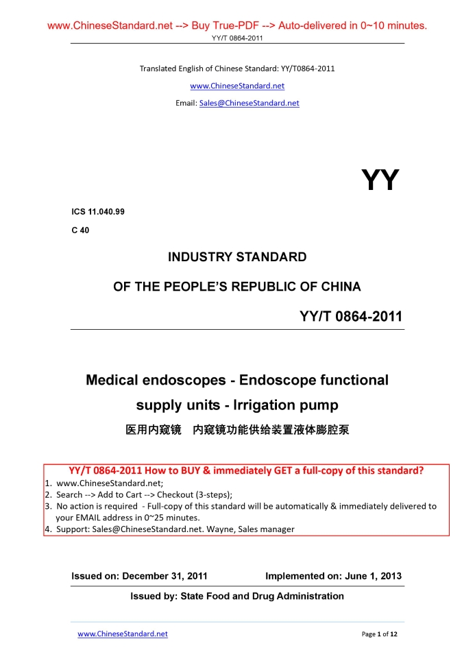 YY/T 0864-2011: Medical endoscopes - Endoscope functional supply units - Irrigation pump Delivery: 9 seconds. True-PDF full-copy in English & invoice will be downloaded + auto-delivered via email. See step-by-step procedure Status: Valid