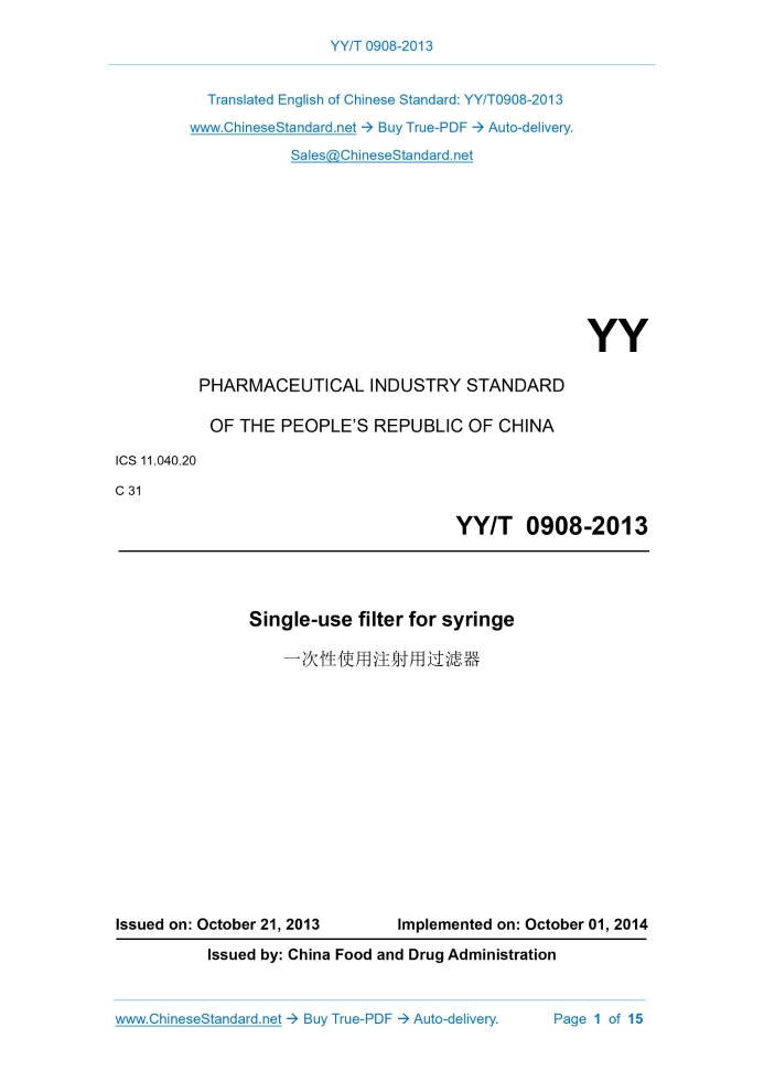 YY/T 0908-2013: Single-use filter for syringe Delivery: 9 seconds. True-PDF full-copy in English & invoice will be downloaded + auto-delivered via email. See step-by-step procedure Status: Valid