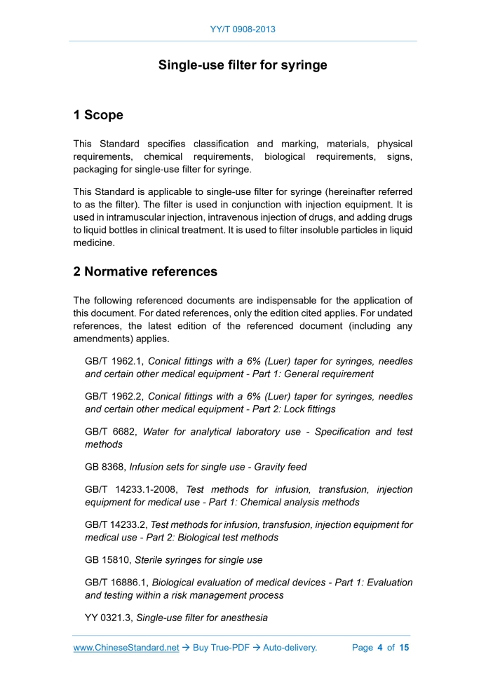 YY/T 0908-2013: Single-use filter for syringe---This is an excerpt. Full copy of true-PDF in English version (including equations, symbols, images, flow-chart, tables, and figures etc.), auto-downloaded/delivered in 9 seconds, can be purchased online: https://www.ChineseStandard.net/PDF.aspx/YYT0908-2013YY PHARMACEUTICAL INDUSTRY STANDARD OF THE PEOPLE’S REPUBLIC OF CHINA ICS 11.040.20 C 31 Single-use filter for syringe ISSUED ON: OCTOBER 21, 2013 IMPLEMENTED ON: OCTOBER 01, 2014 Issued by: China Food and Drug Administration Table of ContentsForeword ... 3 1 Scope ... 4 2 Normative references ... 4 3 Classification and marking ... 5 4 Materials ... 6 5 Physical requirements ... 6 6 Chemical requirements ... 7 7 Biological requirements ... 8 8 Signs ... 9 9 Packaging ... 10 Annex A (Normative) Physical test ... 11 Annex B (Normative) Type inspection rules ... 15 Single-use filter for syringe1 ScopeThis Standard specifies classification and marking, materials, physical requirements, chemical requirements, biological requirements, signs, packaging for single-use filter for syringe. This Standard is applicable to single-use filter for syringe (hereinafter referred to as the filter). The filter is used in conjunction with injection equipment. It is used in intramuscular injection, intravenous injection of drugs, and adding drugs to liquid bottles in clinical treatment. It is used to filter insoluble particles in liquid medicine.2 Normative referencesThe following referenced documents are indispensable for the application of this document. For dated references, only the edition cited applies. For undated references, the latest edition of the referenced document (including any amendments) applies. GB/T 1962.1, Conical fittings with a 6% (Luer) taper for syringes, needles and certain other medical equipment - Part 1: General requirement GB/T 1962.2, Conical fittings with a 6% (Luer) taper for syringes, needles and certain other medical equipment - Part 2: Lock fittings GB/T 6682, Water for analytical laboratory use - Specification and test methods GB 8368, Infusion sets for single use - Gravity feed GB/T 14233.1-2008, Test methods for infusion, transfusion, injection equipment for medical use - Part 1: Chemical analysis methods GB/T 14233.2, Test methods for infusion, transfusion, injection equipment for medical use - Part 2: Biological test methods GB 15810, Sterile syringes for single use GB/T 16886.1, Biological evaluation of medical devices - Part 1: Evaluation and testing within a risk management process YY 0321.3, Single-use filter for anesthesia When tested according to the indirect titration method in GB/T 14233.1-2008, the difference between the volume of the potassium permanganate solution [c(KMnO4)=0.002mol/L] consumed by the test solution and the blank solution shall not exceed 2.0mL. 6.3 Metal ion When testing according to 5.6.1 in GB/T 14233.1-2008, the color of the test solution shall not exceed the standard control solution with mass concentration of ρ(Pb2+)=1μg/mL. When testing according to atomic absorption spectrophotometry in GB/T 14233.1-2008, the content of cadmium shall not exceed 0.1μg/mL. 6.4 pH Carry out the test according to acidity meter method in GB/T 14233.1-2008, and the pH difference between the test solution and the blank solution shall not exceed 1.0. 6.5 Residual amount of ethylene oxide If ethylene oxide is used for sterilization, after the filter is sterilized, when it is tested according to GB/T 14233.1-2008, the residual amount shall not exceed 10μg/g.7 Biological requirements7.1 General For the filter, when new products are put into production, when material changes significantly, the biological evaluation of cytotoxicity, irritation or intradermal reaction, sensitization, acute systemic toxicity, pyrogenic reaction and hemocompatibility shall be carried out according to GB/T 16886.1. 7.2 Sterilization The filter shall be sterilized by a sterilization-validated process and routine controls. NOTE 1: See GB 18278, GB 18279 and GB 18280 for suitable sterilization confirmation and routine control. NOTE 2: Sterility test methods are specified in GB/T 14233.2. This method can be used for type test and is not suitable for factory inspection. NOTE 3: If the product is provided in a non-sterile state, it shall be clearly marked on the package that "unsterilized, not for direct clinical use". 7.3 Bacterial endotoxin When the filter is tested according to GB/T 14233.2, its content shall not exceed 20EU/piece (or piece).8 Signs8.1 Initial packaging The initial packaging shall contain at least the following information: a) Product name and specification marking in compliance with Chapter 3; b) Manufacturer's name and address; c) Product registration certificate number, implementation standard number; d) Use the graphic symbols given in YY/T 0466.1, indicating the filter is sterile. If the product is provided in a non-sterile state, it shall be clearly marked in red on the package: "Unsterilized, not for direct clinical use”; e) The filter is pyrogen-free; f) The filter is for one-time use only, or equivalent instructions, or use the graphic symbols given in YY/T 0466.1; g) Instructions for use, including checking the integrity of the package seal and warnings about detachment of the protective cover; h) Production batch number, beginning with the word "batch" or "LOT", or using the graphic symbols given in accordance with YY/T 0466.1; i) Expiration date, with appropriate text, or use the graphic symbols given in accordance with YY/T 0466.1; j) Label the filter nominal pore size. 8.2 Outer packaging At least the following information shall be on the outer packaging: a) Product name and specification marking in compliance with Chapter 3; b) Manufacturer's name and address; c) Use the graphic symbols given in YY/T 0466.1 to indicate that the filter is sterile. If the product is provided in a non-sterile state, it shall be clearly marked in red on the package, "Uns