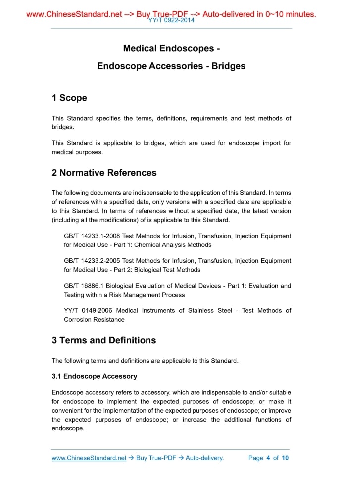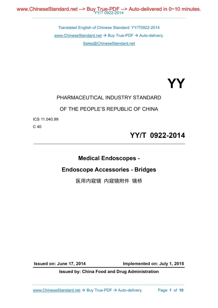 YY/T 0922-2014: Medical Endoscopes - Endoscope Accessories - Bridges Delivery: 9 seconds. True-PDF full-copy in English & invoice will be downloaded + auto-delivered via email. See step-by-step procedure Status: Valid